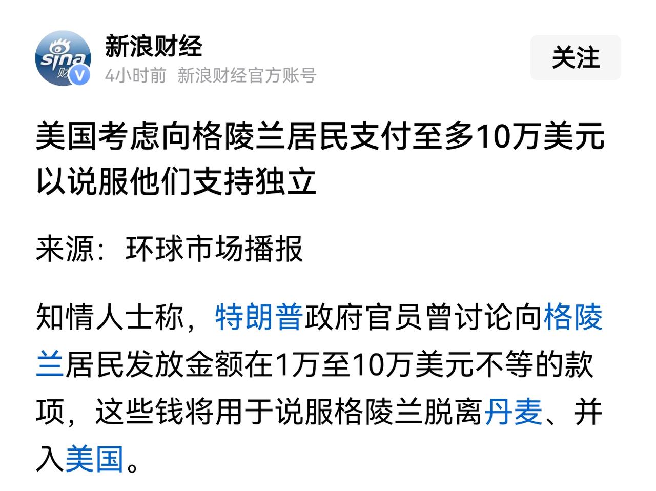 作为世界上最大的岛屿,格陵兰岛面积约216万平方公里,总人口才5.6万人左右。美国人这算盘打得全球都能听见:每人10万美元说服费,总价值不过56亿美元左右。然后再搞个全民公投,不费一兵一卒就能“低价”拿下格陵兰岛,而且这还能让盟友无话可说。毕竟他们说:格陵兰岛的事要遵从丹麦与格陵兰岛民众的意愿。 56亿美元预算,就想买下资源丰富的格陵兰岛。要知道格陵兰岛蕴藏着约4000万吨稀土资源,同时已探明的石油储量约为175亿桶,天然气储量约4.15万亿立方米。这些按照市场价值估价总价值就在数万亿美元,其中稀土储量更是占到全球约32%。 更何况随着未来北极航线的正常化,这已经是遏制北极航线的战略要地了。这部分价值已经不是美元能算得清的了。 美国人想用10万美元收买人心,进而搞公投,那就是强盗逻辑了。当别的地区搞公投,只要美国人不承认,就都是非法的。换成自己,就能偷天换日。 大家觉得未来如果美国一定要拿下格陵兰岛,会用什么方式呢? 1、直接从丹麦手里购买。 2、以北约安全防务为借口,直接施行军事部署,名义上主权仍归丹麦,军事上实际被美国占领。 3、与格陵兰岛直接签署合作协议,绕开丹麦,从经济到军事单独给予格陵兰岛高度自治区的地位。 4、在格陵兰岛地区搞公投,根据公投结果单方面宣布吸纳格陵兰岛。 5、直接派兵入侵、占领。 大家讨论下,会是哪种可能性更大呢?