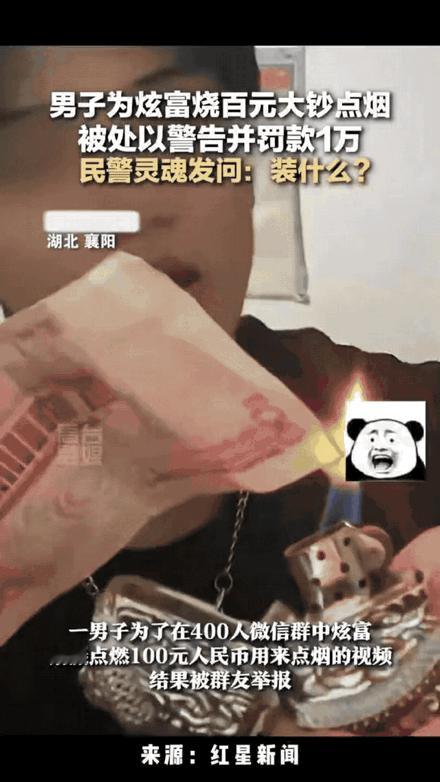 这哪是炫富!这是违法犯罪! 近日,湖北襄阳一男子在群聊中发布了用百元人民币点烟的视频,被群里的人举报了! 男子为了打造高富帅的人社经常在400多人的群里,发布一些开豪车用奢侈品的视频! 这次他决定玩个大的,用人民币来点烟,用100元人民币点烟却招来了警察叔叔!男子坐在派出所的凳子上也不炫富了,倒是蔫了! 警察叔叔问他为什么要这样干,男子回答:就是想向别人炫耀一下证明自己很富有! 这下好了装大了!最后警方根据相关规定对男子进行警告并处以10000元的罚款! 做人做事没有底线终究是要付出代价的,对人民币的不尊重就是犯法!如果钱太多了花不完可以捐给需要的人!