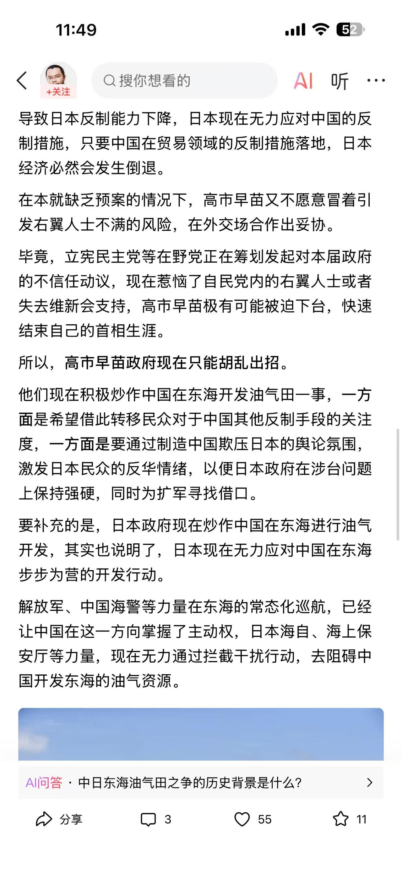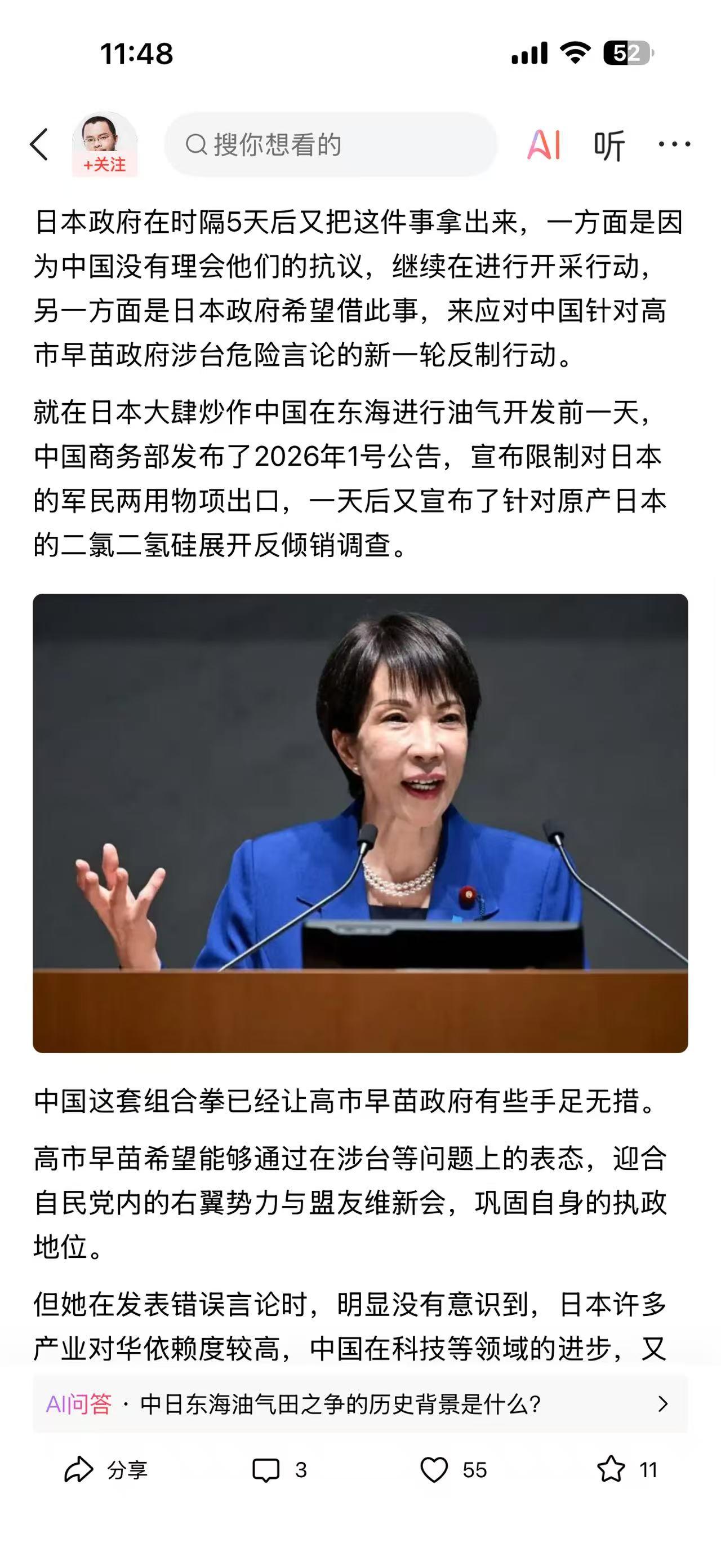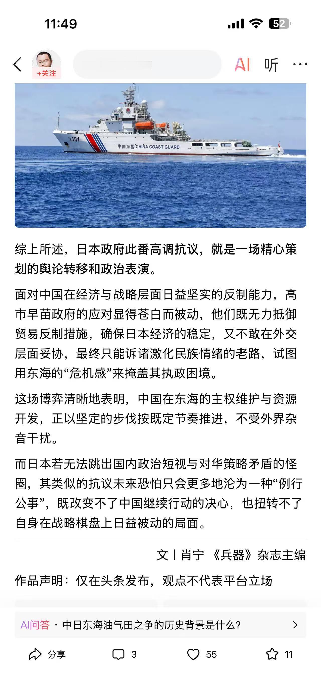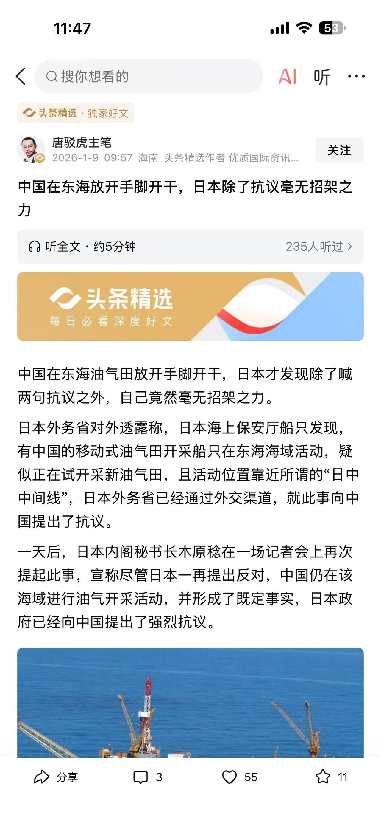 唐驳虎主笔老师的这篇文章我看完后,真是大快人心!中国在东海放开手脚开发油气田,日本除了反复抗议毫无办法,这反差太提气了! 所谓 “中日中间线” 本就是日本单方面主张,中国从未承认,如今在自家管辖海域开发资源,法理站得稳稳的。 更解气的是,面对高市早苗政府在涉台问题上的挑衅,中国还打出贸易反制组合拳,让日方手足无措。这就是实力的底气,任日本怎么炒作,也改变不了中国推进东海开发的决心!