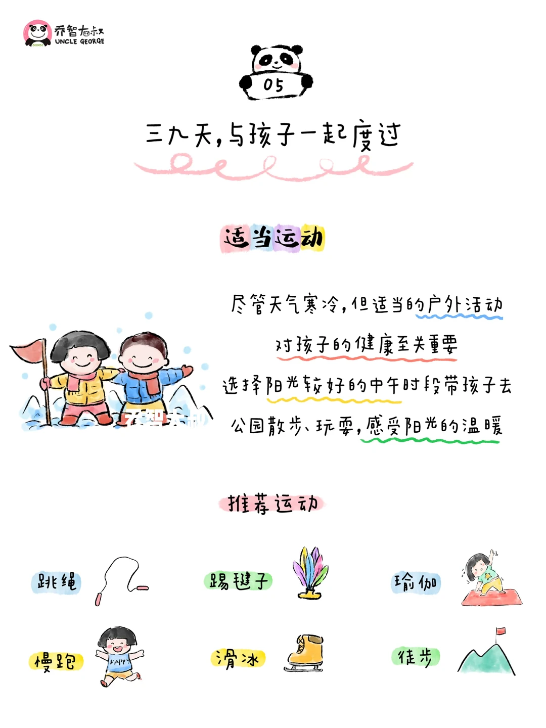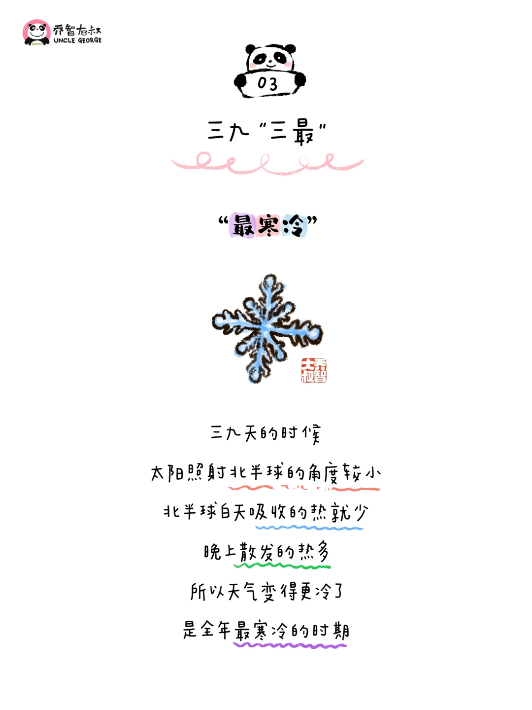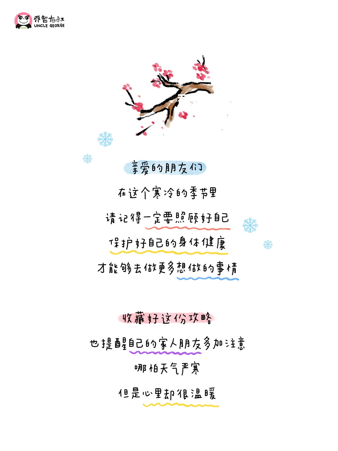 一年中最冷的日子 “三九”真的来啦 🤫 天虽寒,心要暖 ✨ 乔智大叔为你备好了 【三九暖心清单】 泡暖暖的脚♨️ 喝暖暖的汤🥣 最冷的日子里 要给宝贝最暖的陪伴 让我们一起唱着 《九九歌》 数着日子等春天!🌱