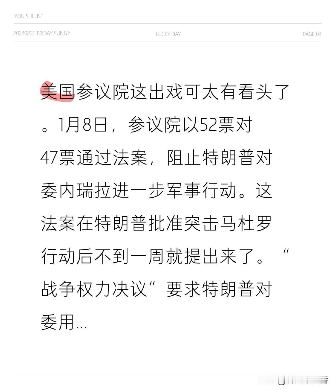 美国参议院急踩刹车。1月8日,参议院以52票对47票通过法案,阻止特朗普对委内瑞拉进一步军事行动。这法案在特朗普批准突击马杜罗行动后不到一周就提出来了。 “战争权力决议”要求特朗普对委用武前得先找国会批准,由两党议员联合提出。这次投票虽是程序性的,但已表明最终表决稳了,接下来还得送众议院审议。 特朗普气坏了,直接抨击5名“倒戈”的共和党参议员,说他们不应再当选。此前类似决议两次被共和党阻挠,这次风向变了。这决议即便两院都通过,还可能被特朗普否决,后续发展真是让人拭目以待。