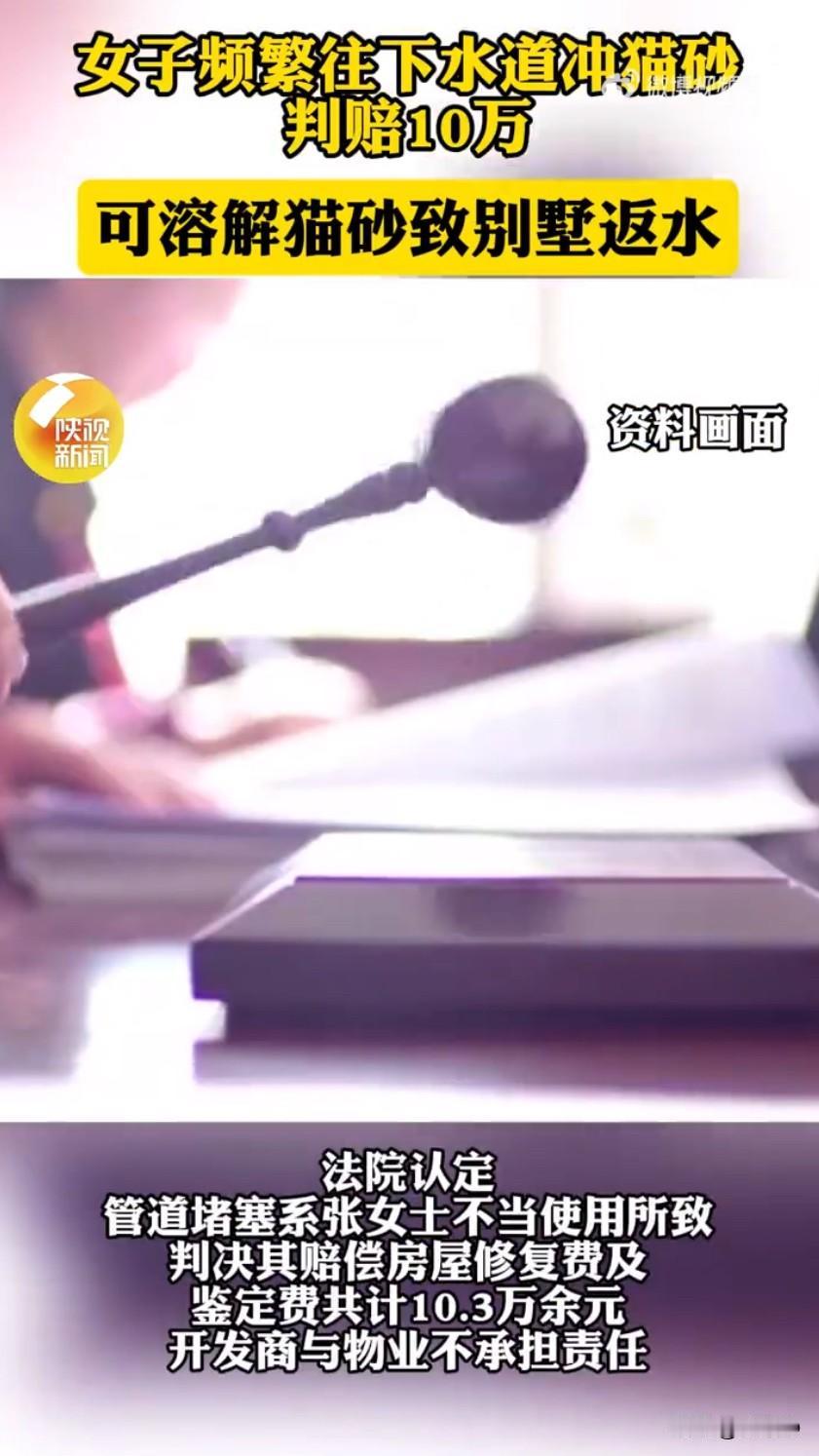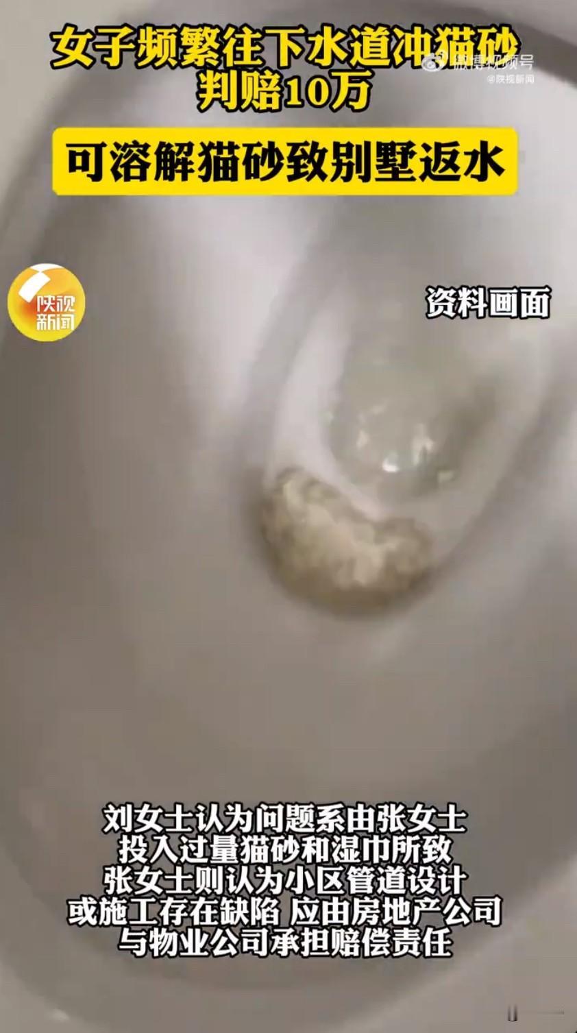女子冲可溶解猫砂致楼下返水,判赔10万!法官提醒:再方便也不能乱冲 北京一起因冲猫砂引发的邻里纠纷,让网友们直呼“图省事付出大代价”!女子频繁往下水道冲猫砂判赔10万 可溶解猫砂致别墅返水判租户赔10万 话题刷屏后,不少养宠人都敲响了警钟,原来“可溶解”猫砂也不能随便冲。 事情的起因很常见,张女士租了某小区的联排别墅,家里养了好几只猫,图方便就把“可溶解”猫砂连带着湿巾一起冲进马桶。可她没料到,这些看似能化开的东西,却给楼下邻居刘女士带来了大麻烦。某天,刘女士家正在装修,卫生间地漏突然反水,污水顺着管道蔓延到多个房间,新买的木地板、刚贴好的壁纸全被泡坏,场面一片狼藉。 物业赶来疏通后,出具的情况说明里明确写着,堵塞管道的是类似猫砂和湿巾纤维的物品,比对后和张女士用的猫砂完全一致。而且疏通后做的管道测试显示,管道本身排水正常,堵塞就是人为造成的。刘女士看着受损的房子又气又急,找张女士协商赔偿,可张女士觉得自己没做错,辩称用的是可溶解猫砂,问题应该出在小区管道设计或施工有缺陷,该由开发商和物业负责。 双方谈不拢,刘女士只能把张女士、房地产公司和物业公司一起告上了法院,要求赔偿近9万多元的损失。庭审时,开发商和物业也拿出证据,证明房屋交付时管道没问题,平时也定期疏通,这次事故后还及时处理,已经尽到了责任。为了确定损失,法院还委托评估公司做了鉴定,光是修复费就8万多,加上鉴定费总共花了10万多元。 法院审理后认为,现有证据能明确证明堵塞物就是张女士冲的猫砂和湿巾,而且没有证据显示管道有质量问题,也不能怪物业没尽到维护义务,最终判决张女士赔偿全部10.3万余元,开发商和物业不承担责任。 其实很多养宠人都以为“可溶解猫砂”能直接冲,但法官特意提醒,就算是可溶解的,大量、频繁地冲,再加上混合湿巾这类难分解的物品,很容易超出管道的承载能力,最后造成堵塞。网友们看完也纷纷议论,“可溶解不是万能的,公共管道可经不起这么造”“图自己省事,让别人遭殃,赔钱一点不冤”。 这事儿也给大家提了个醒,邻里之间过日子,得互相体谅,不能只图自己方便就忽视别人的权益。不管是养宠的还是普通住户,都得养成好习惯,别随便往下水道扔杂物,物业也该多宣传管道使用规范,这样才能避免类似的纠纷。溶水猫砂 来源:陕视新闻