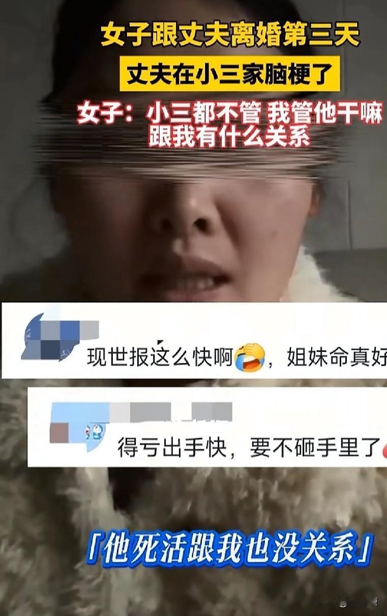 举头三尺有神明啊,这不,出轨男最快的现世报来了。 近日一名女子发视频称,刚离婚的丈夫和第三者明目张胆的在一起了,可万万没想到啊,就在他们离婚的第三天,前夫脑梗了,还就在第三者家里。 这是老天都看不下去了吧,男人追求的不就是婚姻之外的真爱吗,可是现世报就是,第三者一看他现在都这样了,打电话给他家属,让人领回去。家属又通知前妻,希望能照顾他。 凭什么呢,真爱都不管了吗,凭什么要离婚了的前妻管呢,最后兜兜转转回到了他的原生家里。好多网友祝福这个妹子,好人果然有好报。
