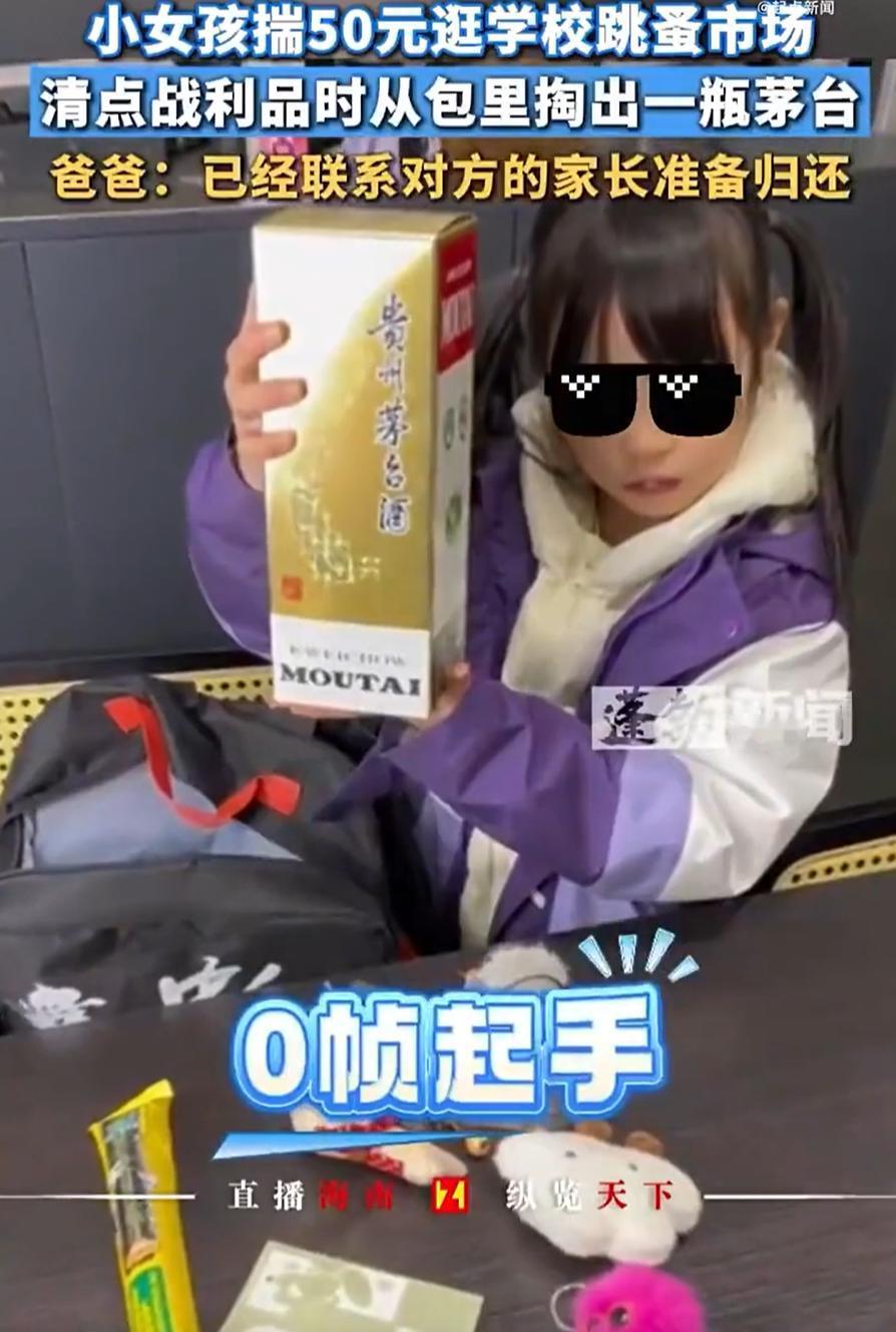 笑死了!四川,一小学女生朝父亲要50块钱参加学校的跳蚤市场,开始看到孩子就拿回来两个挂饰还觉得她被同学骗了,没成想下一秒女儿就从书包里掏出一瓶茅台,爸爸一看这惊喜有些太大了,连忙联系对方家长把酒归还了 张先生介绍,前一天女儿从他这要了50块钱,说是学校搞跳蚤市场,同学们互相买卖闲置的小玩意儿。爸爸也没多问,觉得孩子高兴就行,钱也不多,就给了 结果女儿放学回来,先是掏出了两个普普通通的小挂饰,爸爸看了心里还嘀咕,五十块就换了这?别是被同学“忽悠”了吧 没想到下一秒,小姑娘又从书包里慢悠悠摸出个盒子来。爸爸接过来一看,愣了——竟然是一瓶茅台酒。他赶紧打开盒子检查,里面可不是空的,是一瓶完完整整、还没开封的茅台 爸爸当场就清醒了,这惊喜太大,根本接不住。后面的操作也很干脆,联系同学家长,把酒原封不动退回去。事情不复杂,但细节很真实,小孩子不懂价格概念,只知道家里有,就觉得能拿去换点东西,大人一看就明白这是不能碰的 有网友表示:我儿子幼儿园的女同学给他送了一块劳力士 放学后在他书包发现的,一看是金劳,我连忙联系同学妈妈,才知道同学把爷爷的表给拿来了 这两件事放在一起看,特别有意思 在孩子眼里,东西的“价值”往往只和当下的心情、喜好挂钩。这个瓶子好看,那块手表亮晶晶,这个小玩具我喜欢,它就“值”我手里所有的零花钱,或者值得我把它送给最好的朋友。他们不懂得茅台代表的市场价格,也不明白劳力士意味着什么。那份天真和纯粹,恰恰是整件事里最让人会心一笑的部分 当然,也有网友说,如果不归还会怎么样 如果不归还,短期看可能没什么事,长期看问题不小,而且代价不一定体现在钱上。、 最现实的一点。对方家长一旦发现家里少了一瓶酒,顺着学校一问,很容易就能对上。到那一步,事情性质就变了,不再是孩子之间的交换,而是大人明知东西不对却选择留下。这时候再解释是孩子不懂事,基本站不住脚,反而更被动