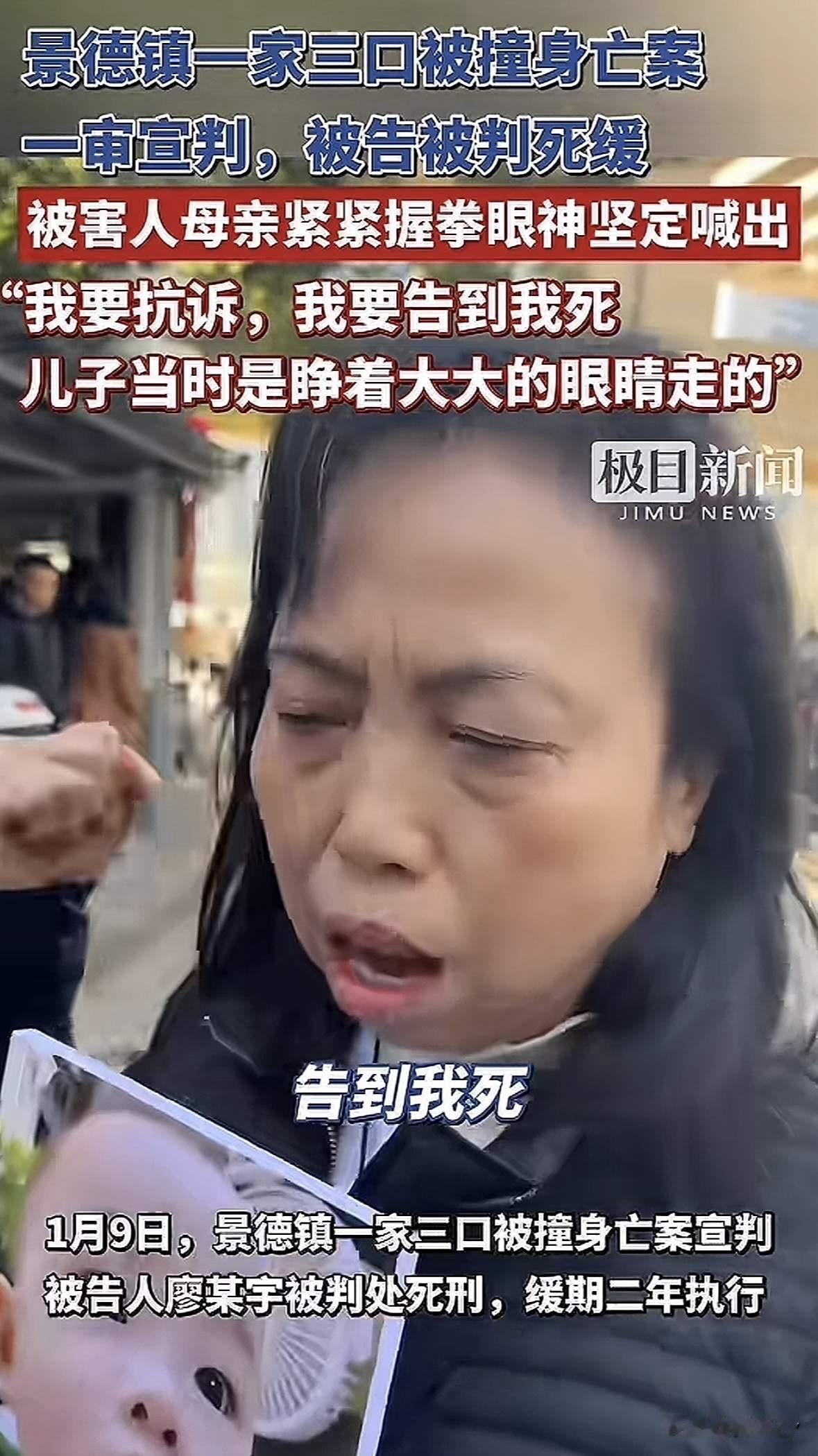 法院宣判后,胡妈妈蹒跚着走出法庭,面对庭外那么多支持她的朋友,她握紧双拳眼神坚定的大声喊着:我要抗诉,用我的余生为我的一家三口讨公道!我要告到我S! 只因为两个人在车上谈论鹦鹉什么时候开始说话,谁都坚持自己的言论后发生争吵!然后就开始猛踩油门发泄不满情绪! 当时小胡抱着不满1岁的宝宝和妻子一家三口刚好经过,廖新宇因车速太快造成了无法挽回的后果! 太心疼这位母亲了,她说儿子走的时候,是睁着大大的眼睛走的!她永远都忘不了,一闭上眼睛就是儿子一家三口的模样! 胡妈妈今天出庭是穿着印有儿子一家三口的T恤,手里抱着小孙女儿的照片出庭的,她怎么也没想到判决是这样的结果!希望胡妈妈坚强!