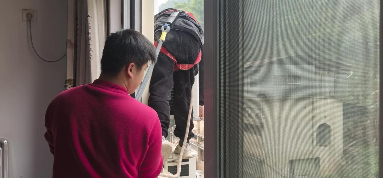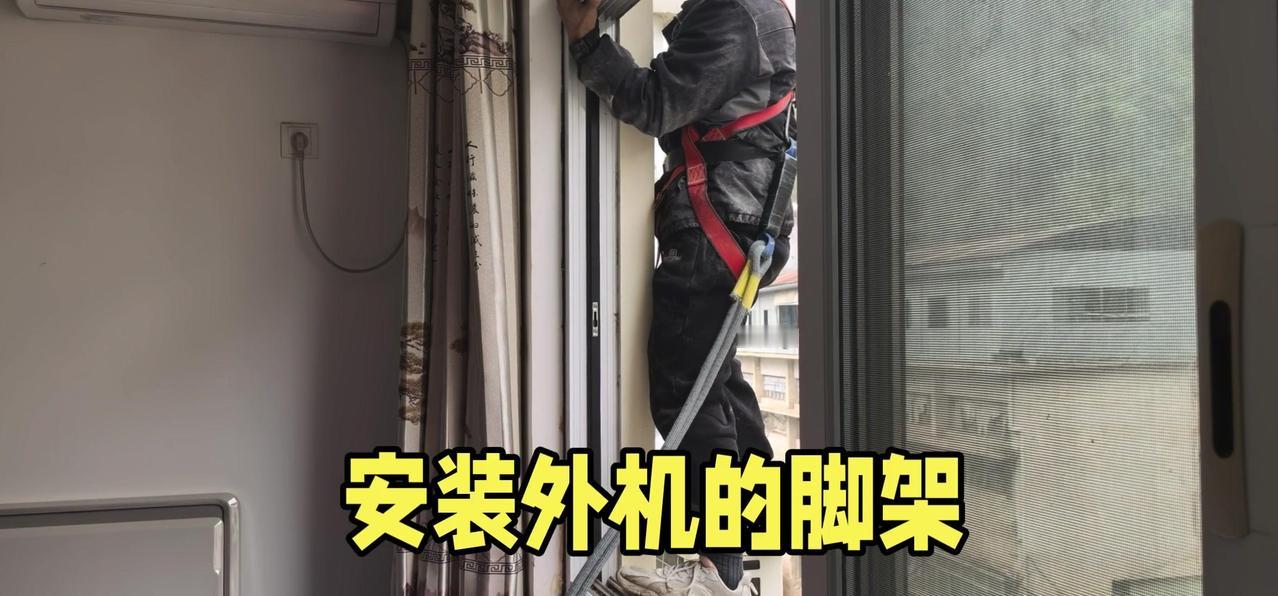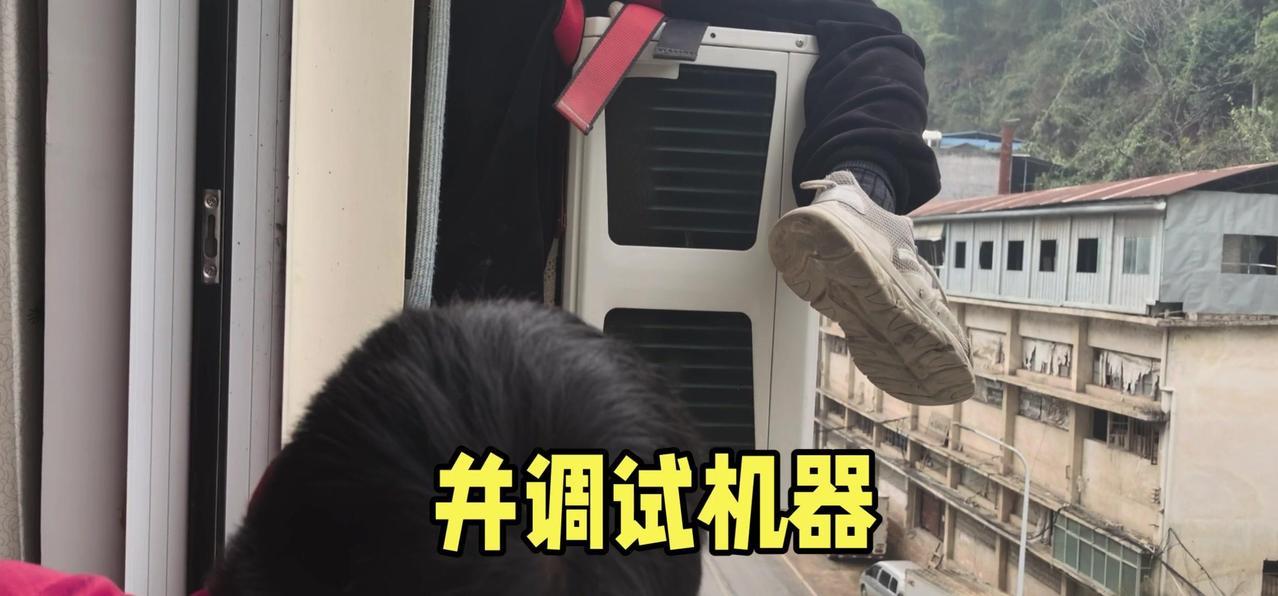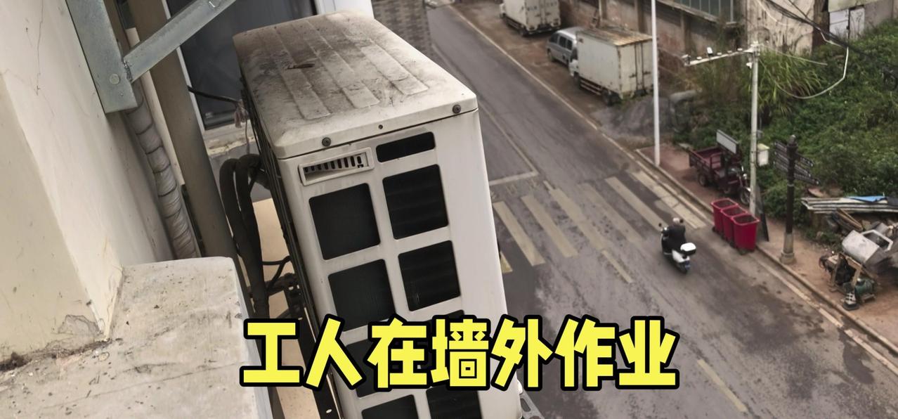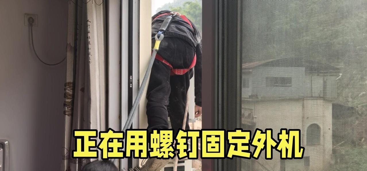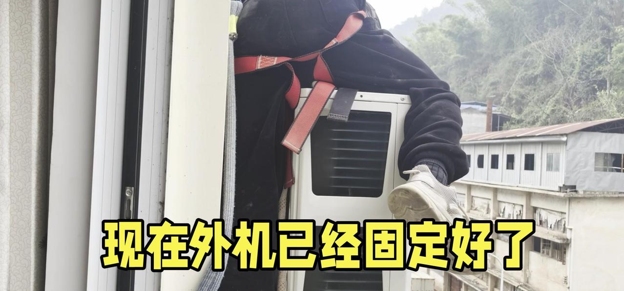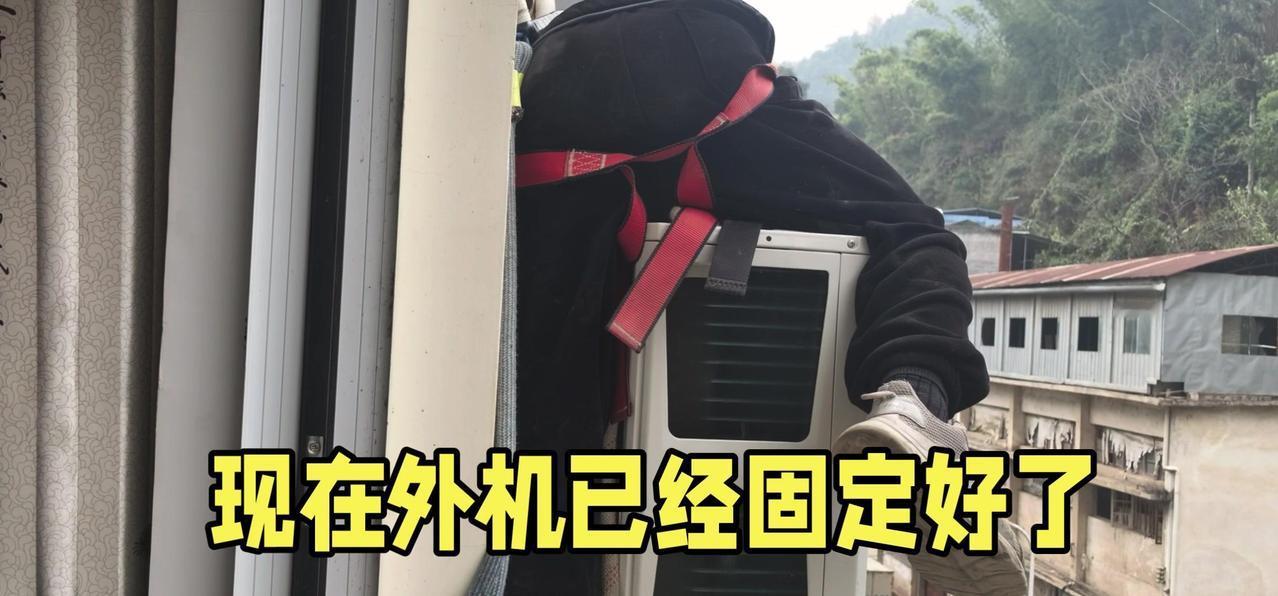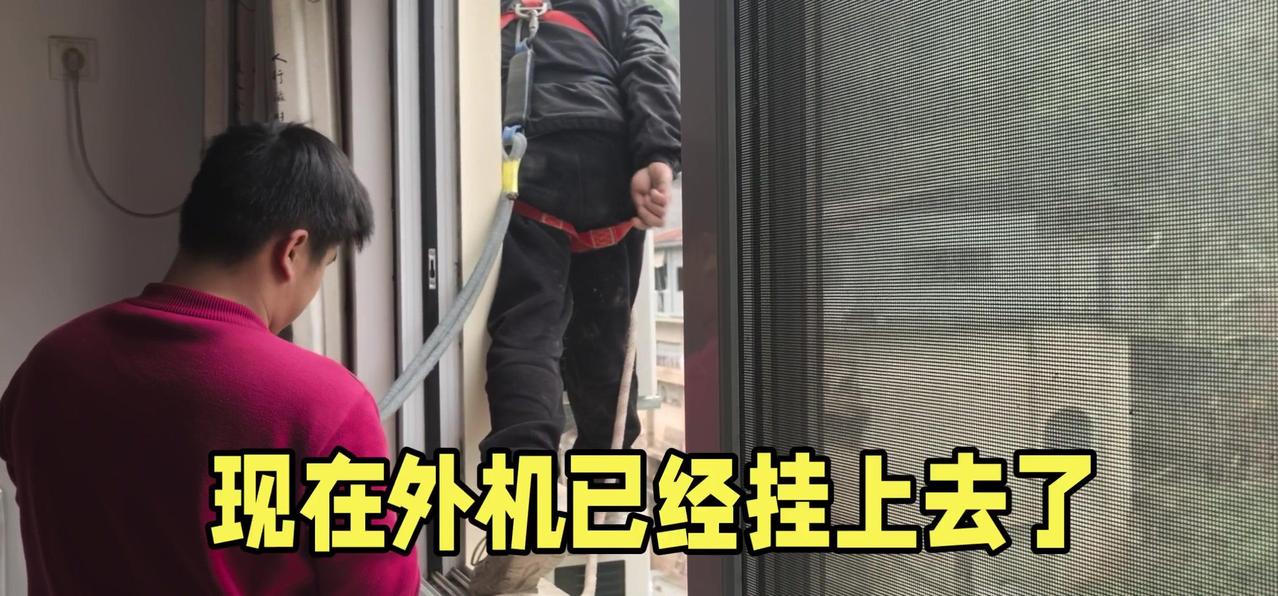 然后开始打孔装外机脚架,两边都安好后,小心翼翼地把外机挂上去,用螺钉固定好。最后连接内外机的连线,调试机器。整个过程里,工人在墙外作业,下面车来人往,每一步都得特别小心,真是太不容易了。