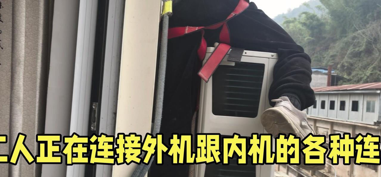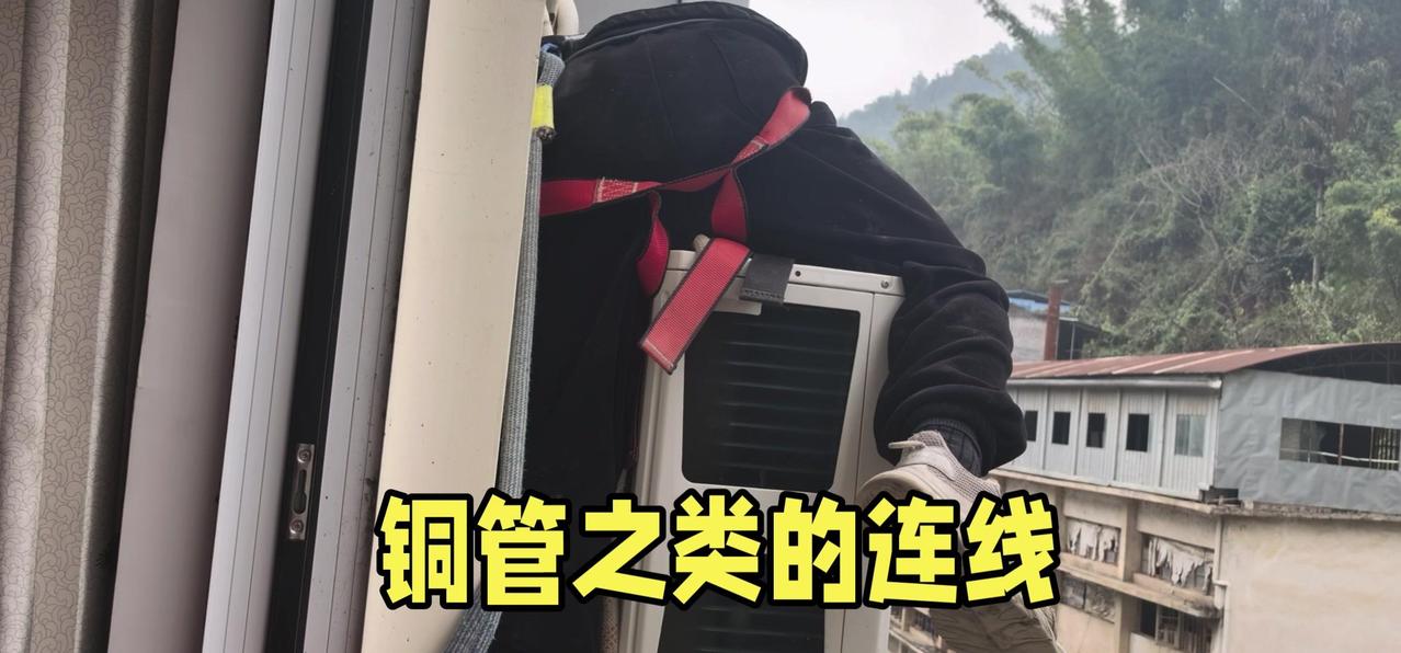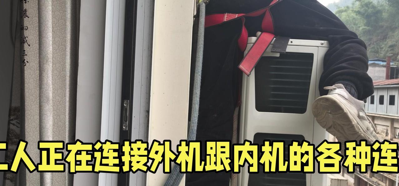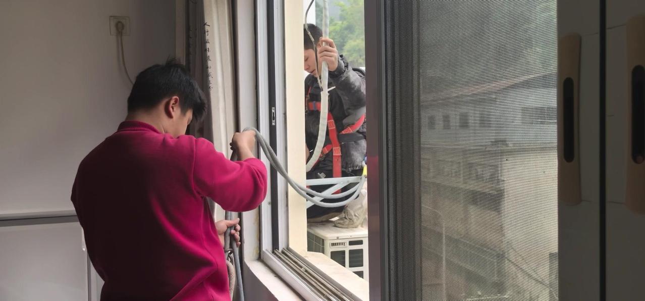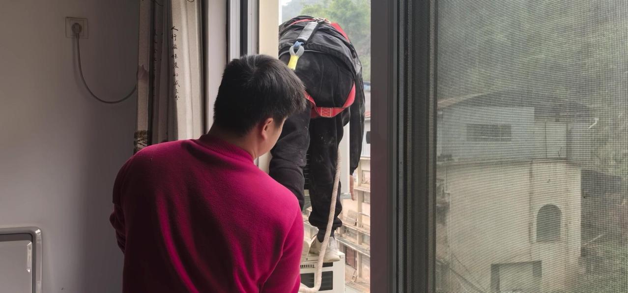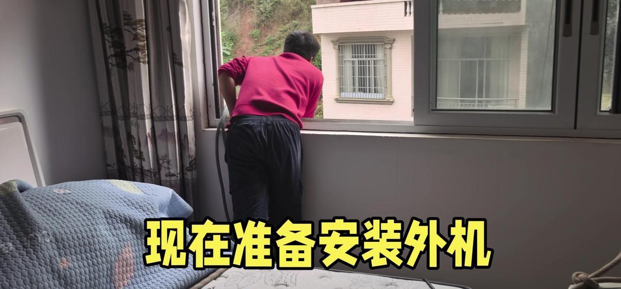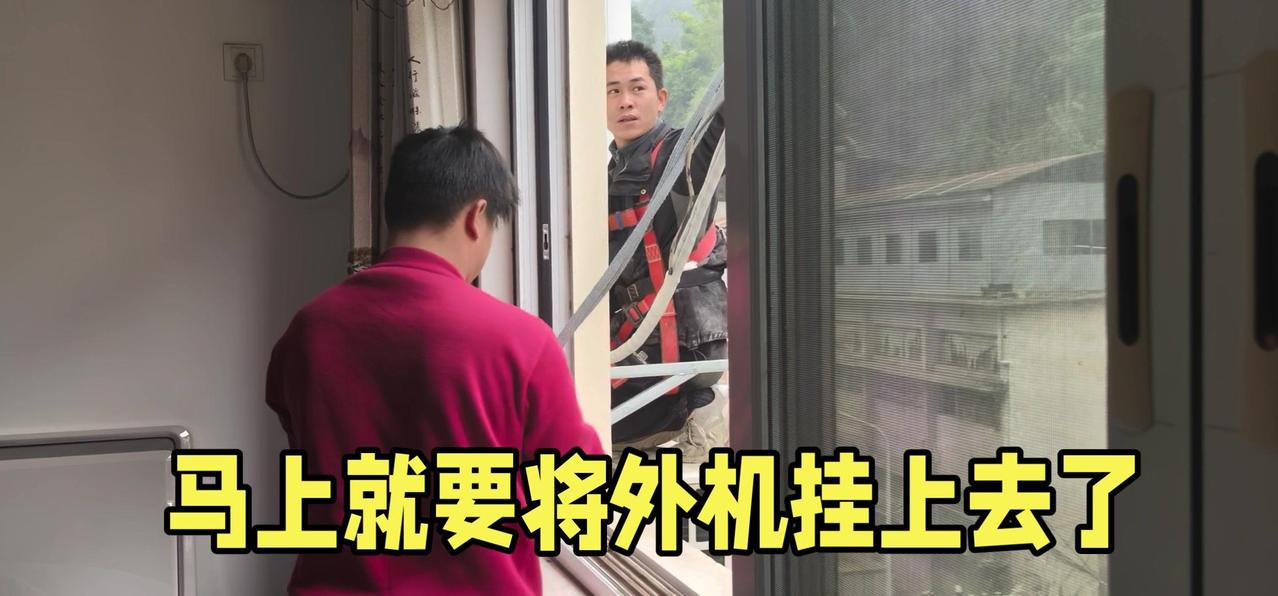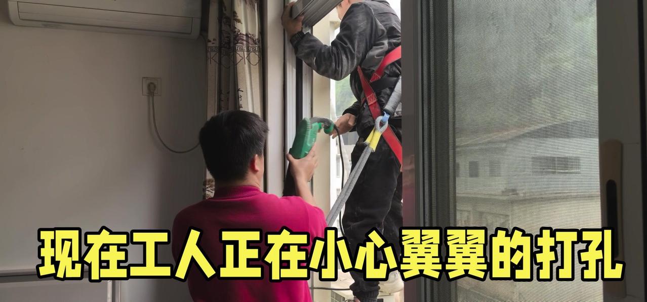 然后开始打孔装外机脚架,两边都安好后,小心翼翼地把外机挂上去,用螺钉固定好。最后连接内外机的连线,调试机器。整个过程里,工人在墙外作业,下面车来人往,每一步都得特别小心,真是太不容易了。