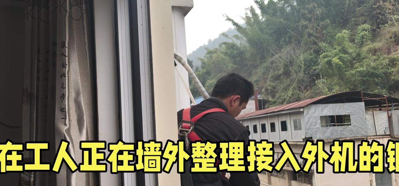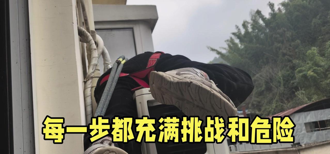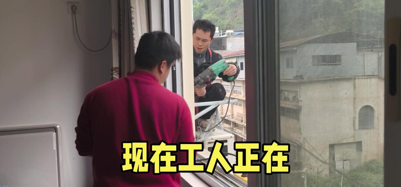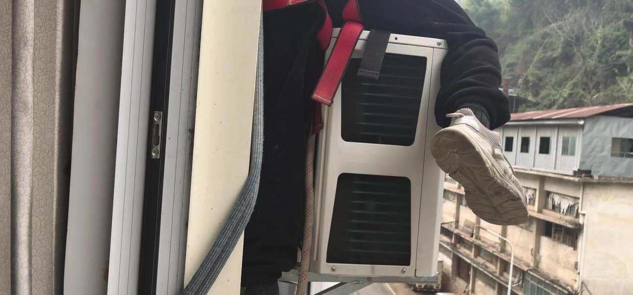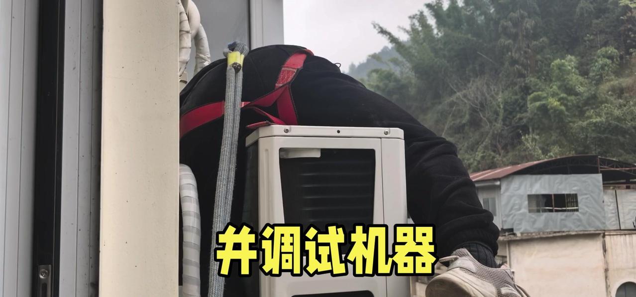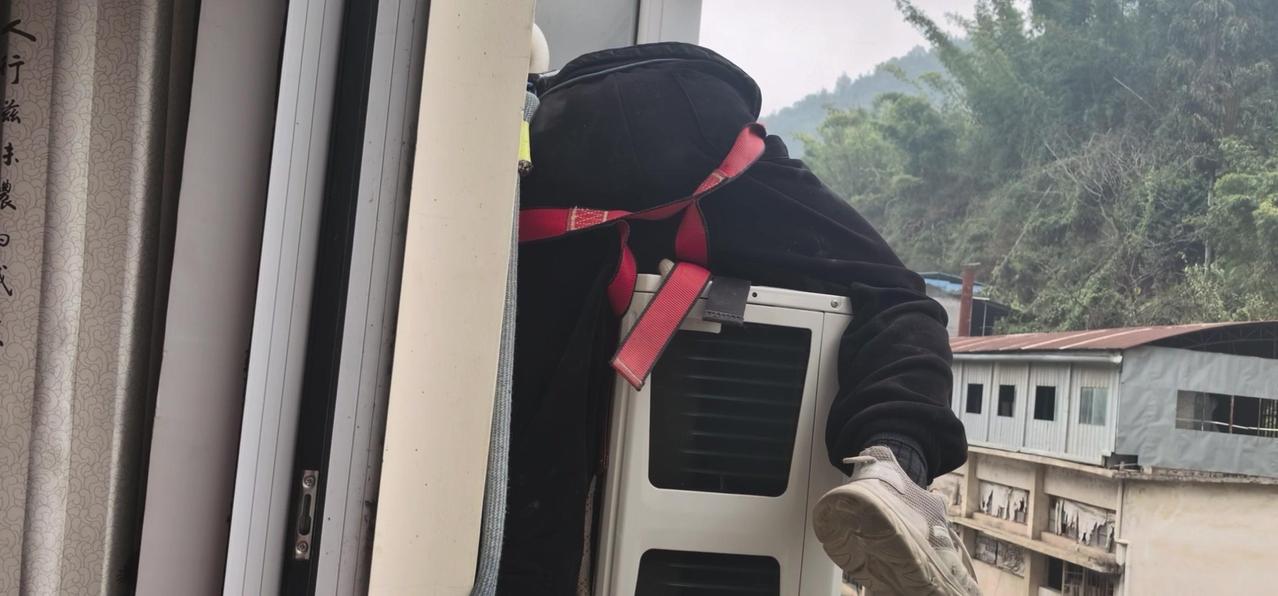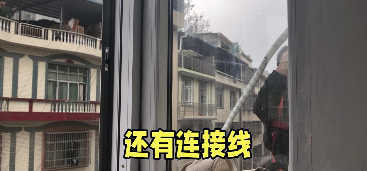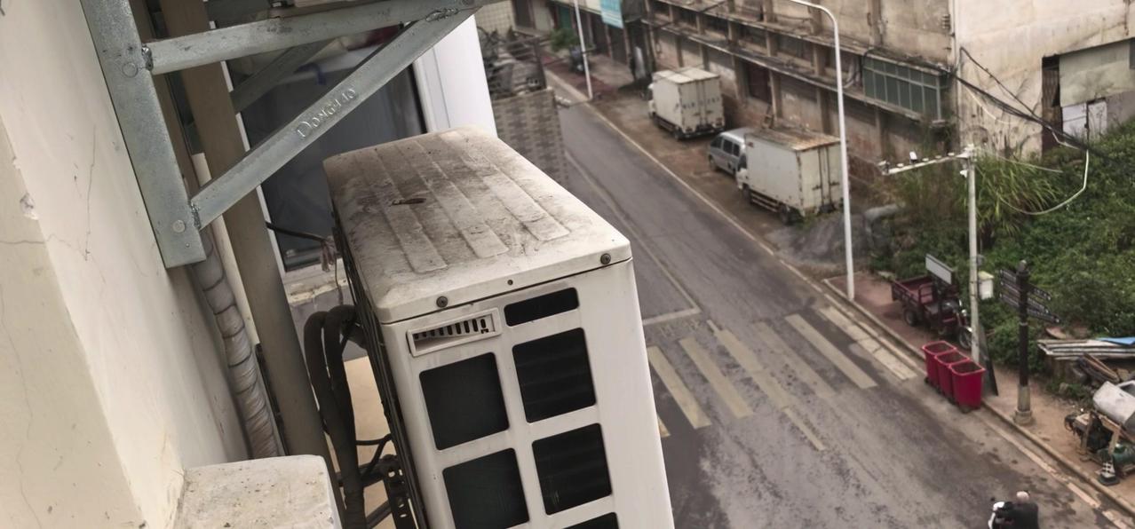 然后开始打孔装外机脚架,两边都安好后,小心翼翼地把外机挂上去,用螺钉固定好。最后连接内外机的连线,调试机器。整个过程里,工人在墙外作业,下面车来人往,每一步都得特别小心,真是太不容易了。