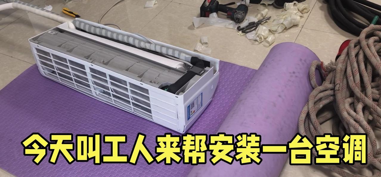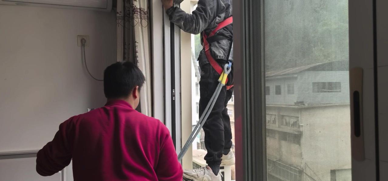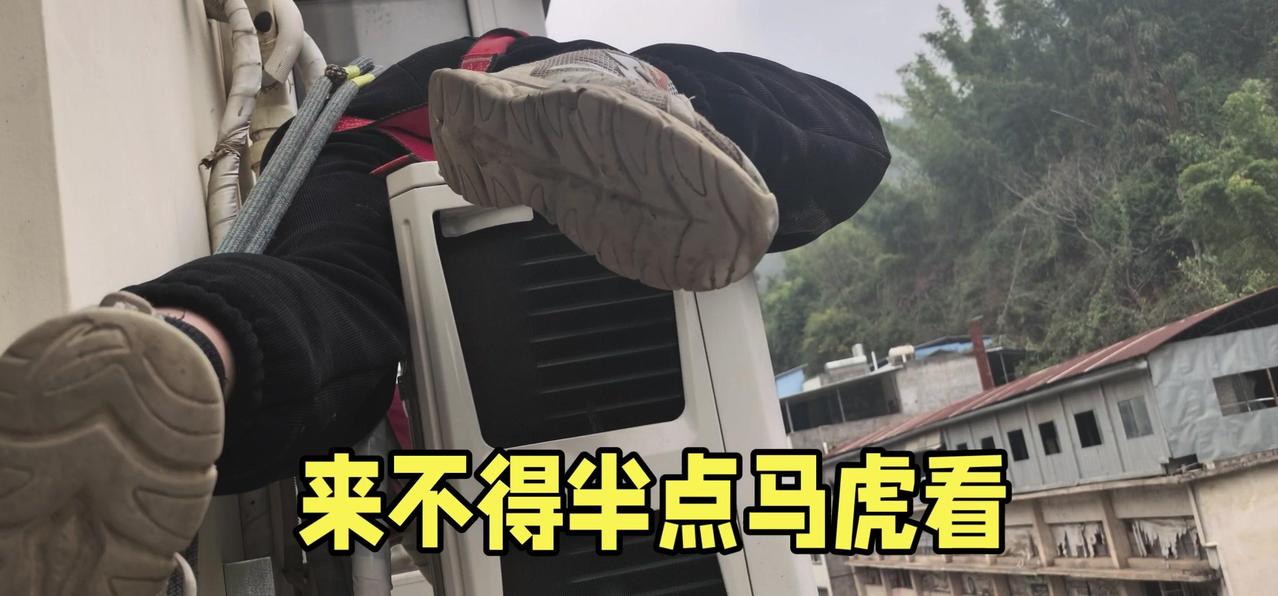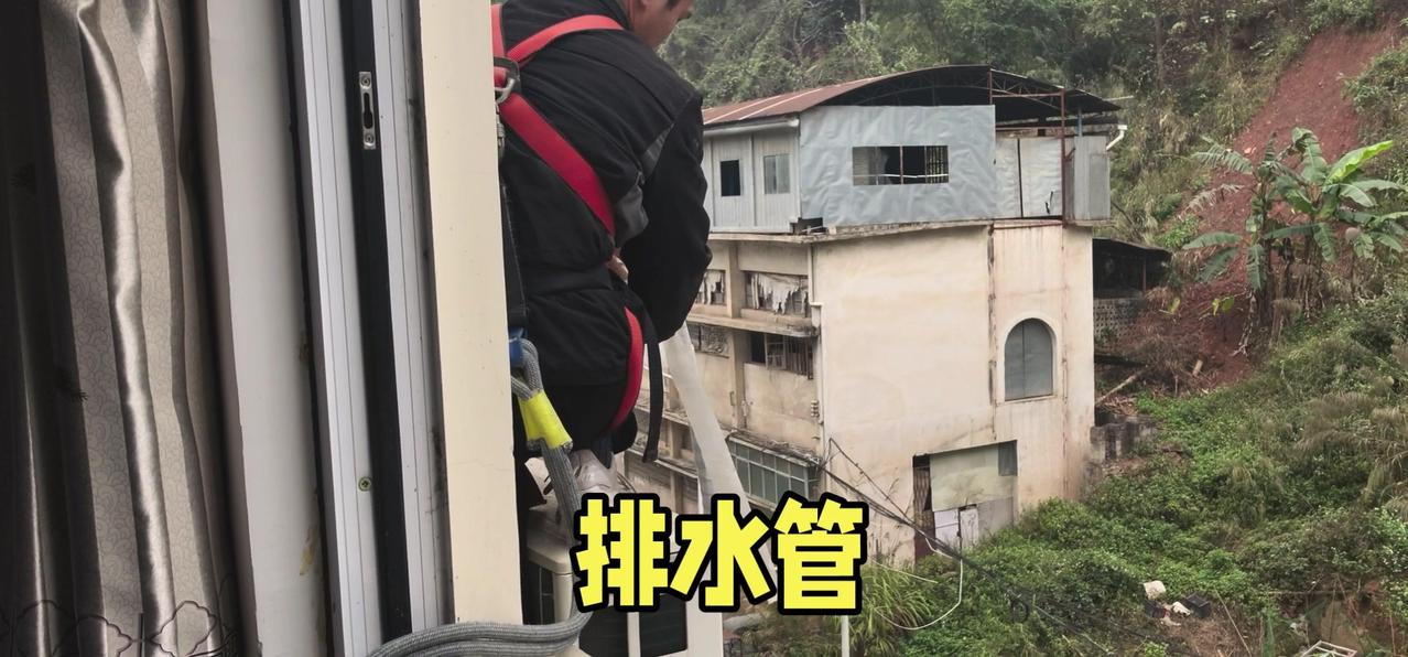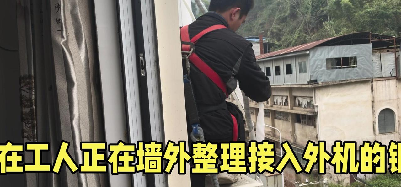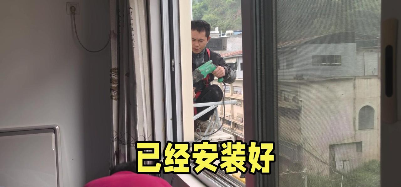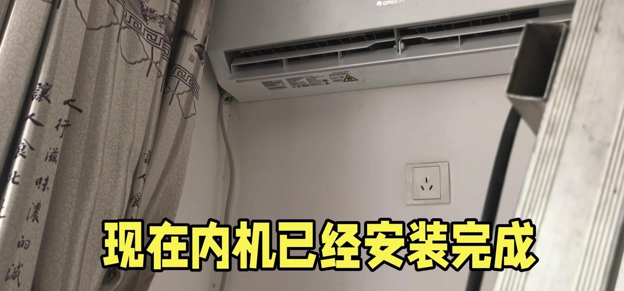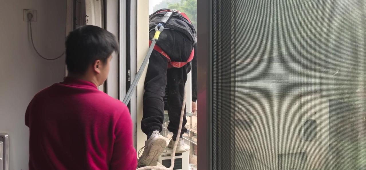然后开始打孔装外机脚架,两边都安好后,小心翼翼地把外机挂上去,用螺钉固定好。最后连接内外机的连线,调试机器。整个过程里,工人在墙外作业,下面车来人往,每一步都得特别小心,真是太不容易了。
