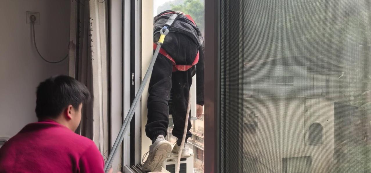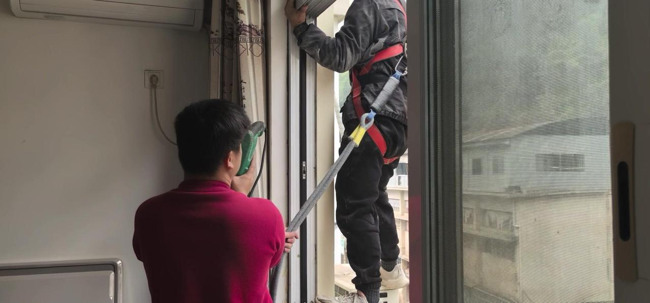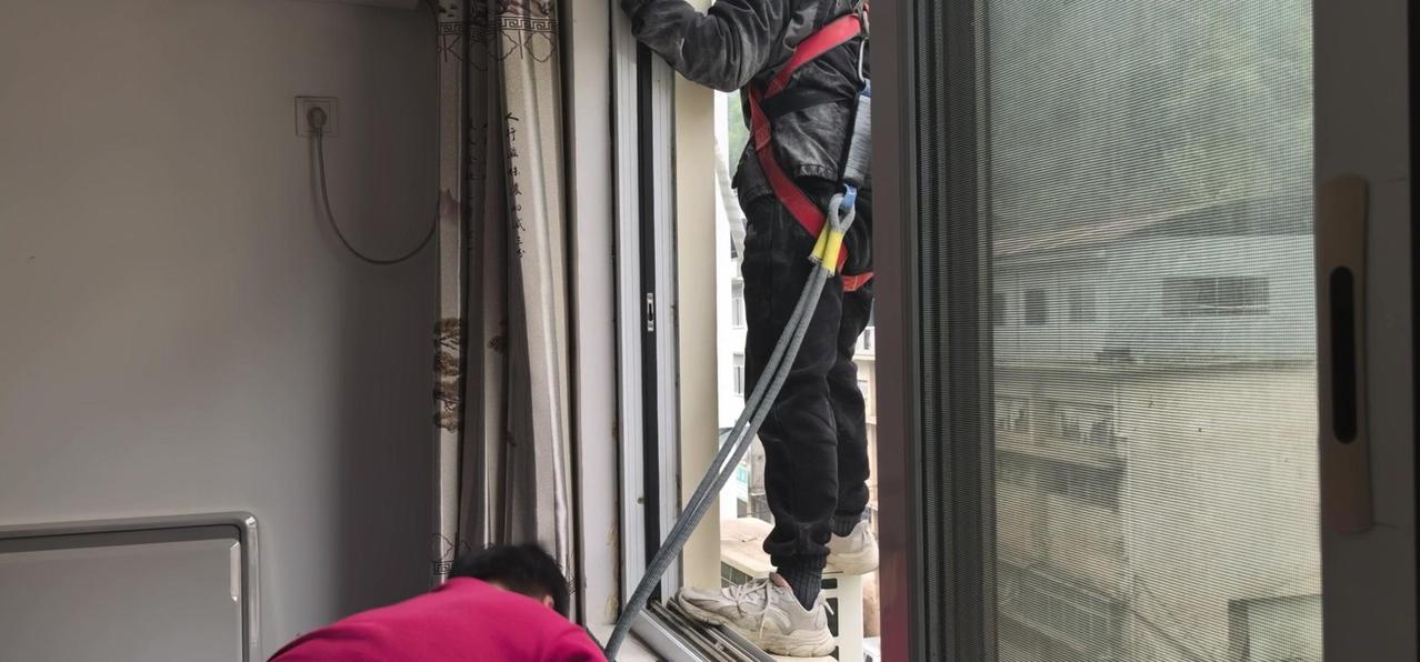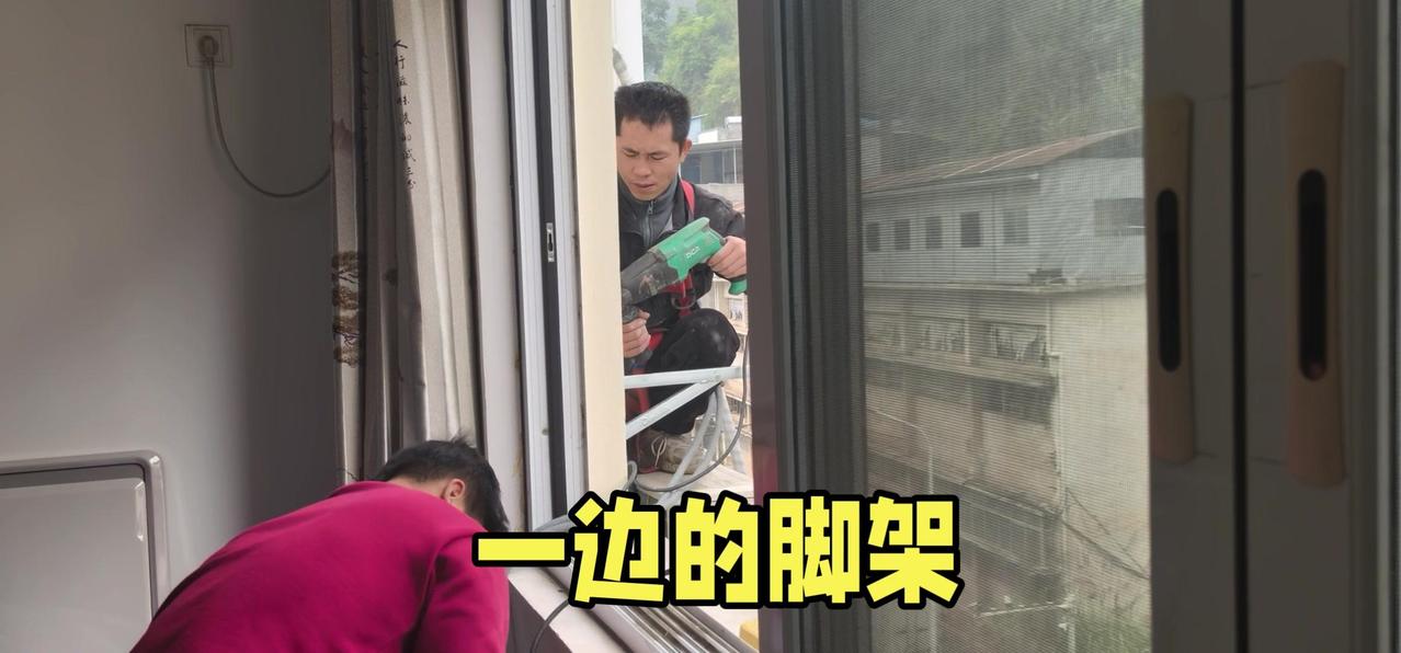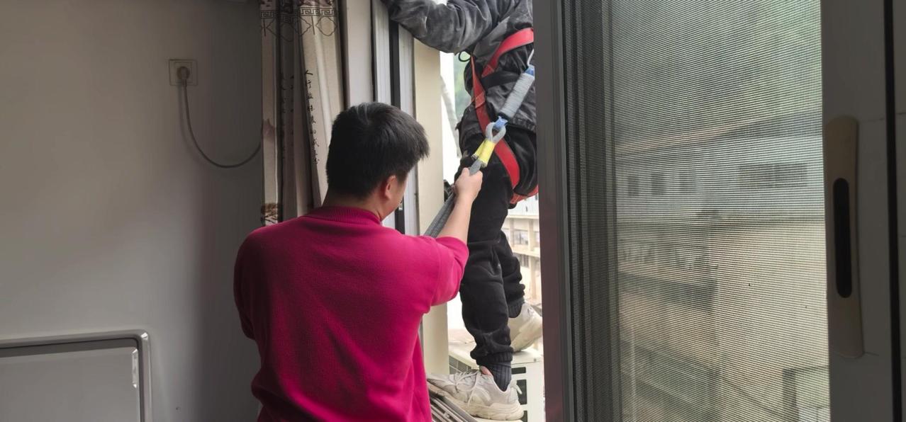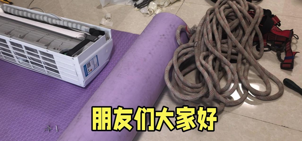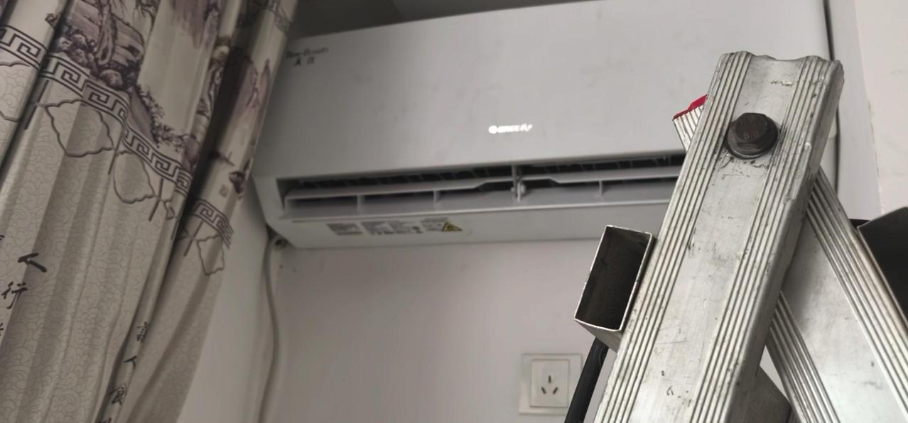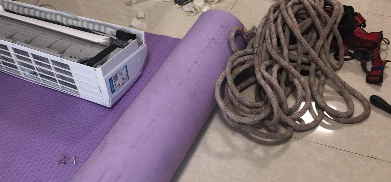 然后开始打孔装外机脚架,两边都安好后,小心翼翼地把外机挂上去,用螺钉固定好。最后连接内外机的连线,调试机器。整个过程里,工人在墙外作业,下面车来人往,每一步都得特别小心,真是太不容易了。