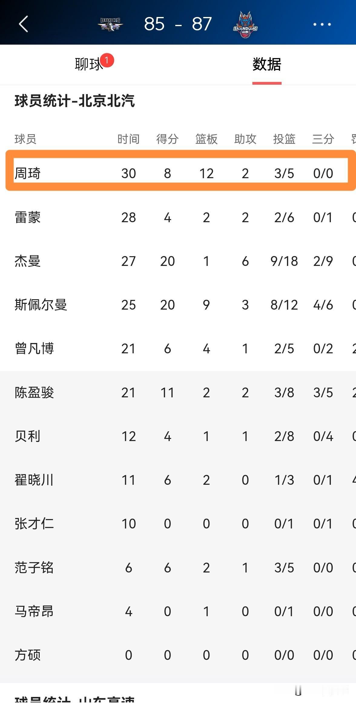 北京北汽超级巨星周琦的出手数真是太少了!在今天北京北汽主场以85:87惜败于山东