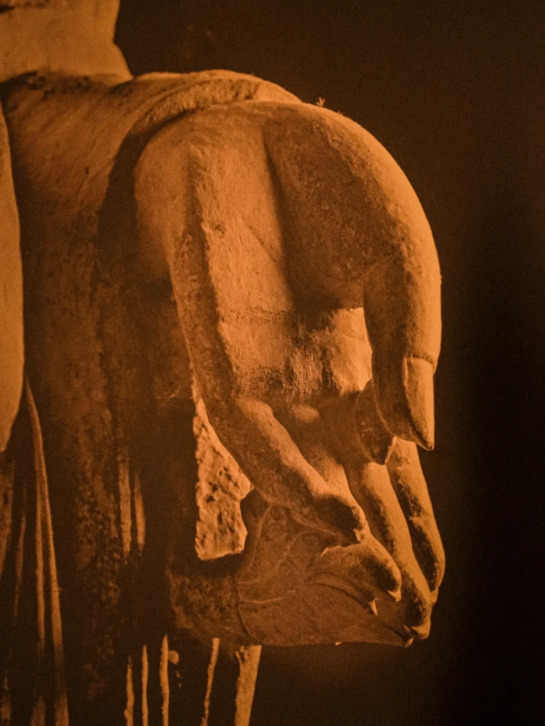 👉正中的"释迦会子"直击人心,自然光和室内光下,释迦像竟呈现父亲和佛祖两种不同身份情绪,两只手的塑造堪比手模