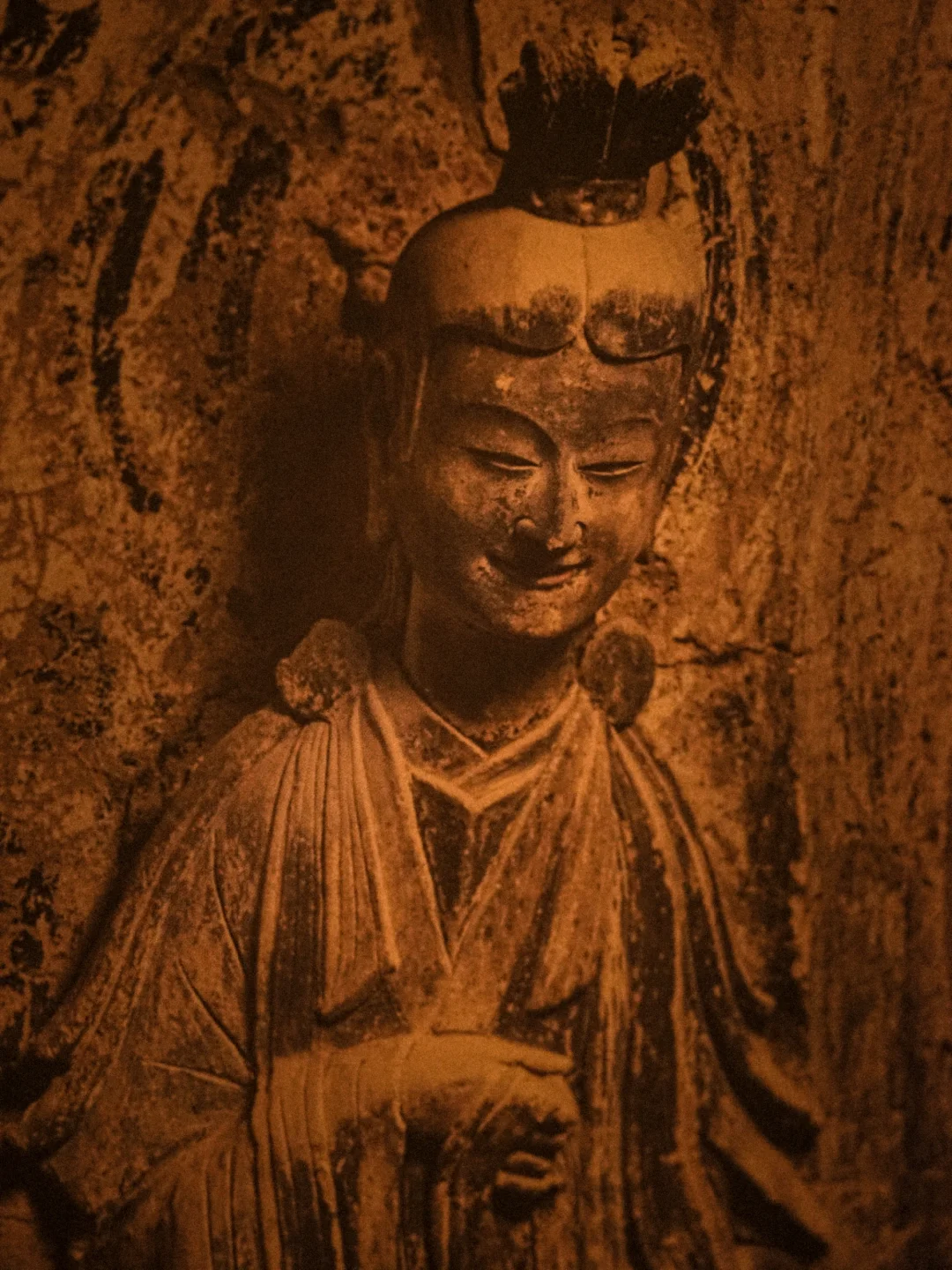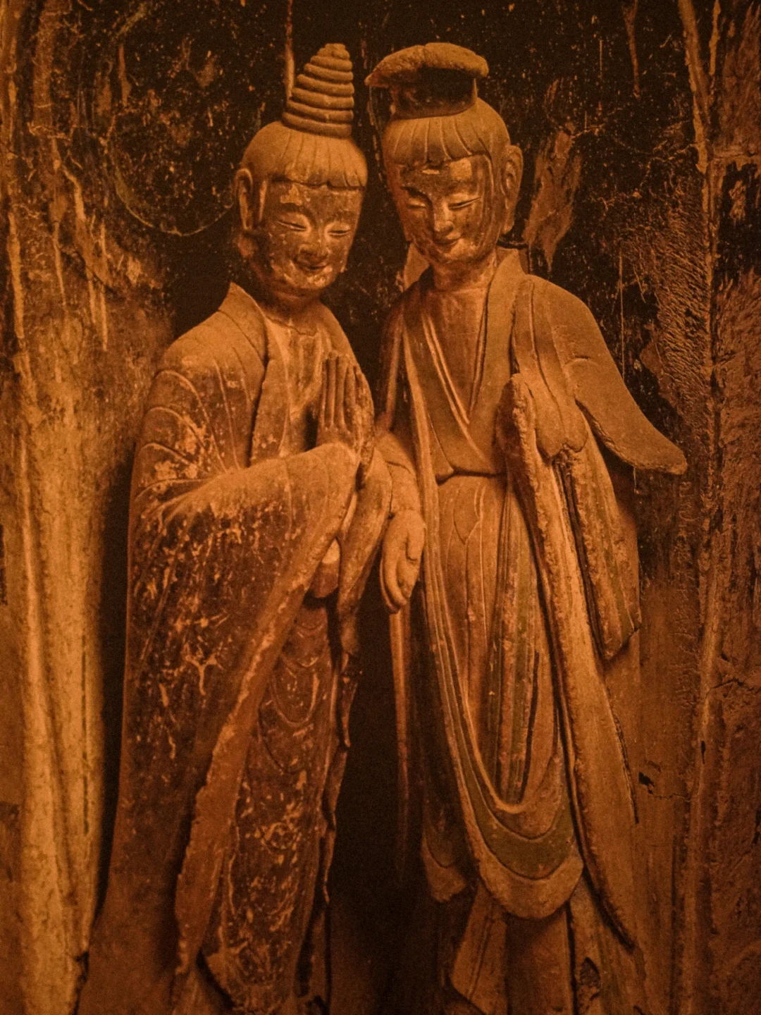 👉保存状况最好的石窟,正壁上北魏晚期一佛二菩萨造像个人认为是全山最美的,无论是姿态、服饰还是那呼之欲出的笑容,足以打动每一个与之对视的人