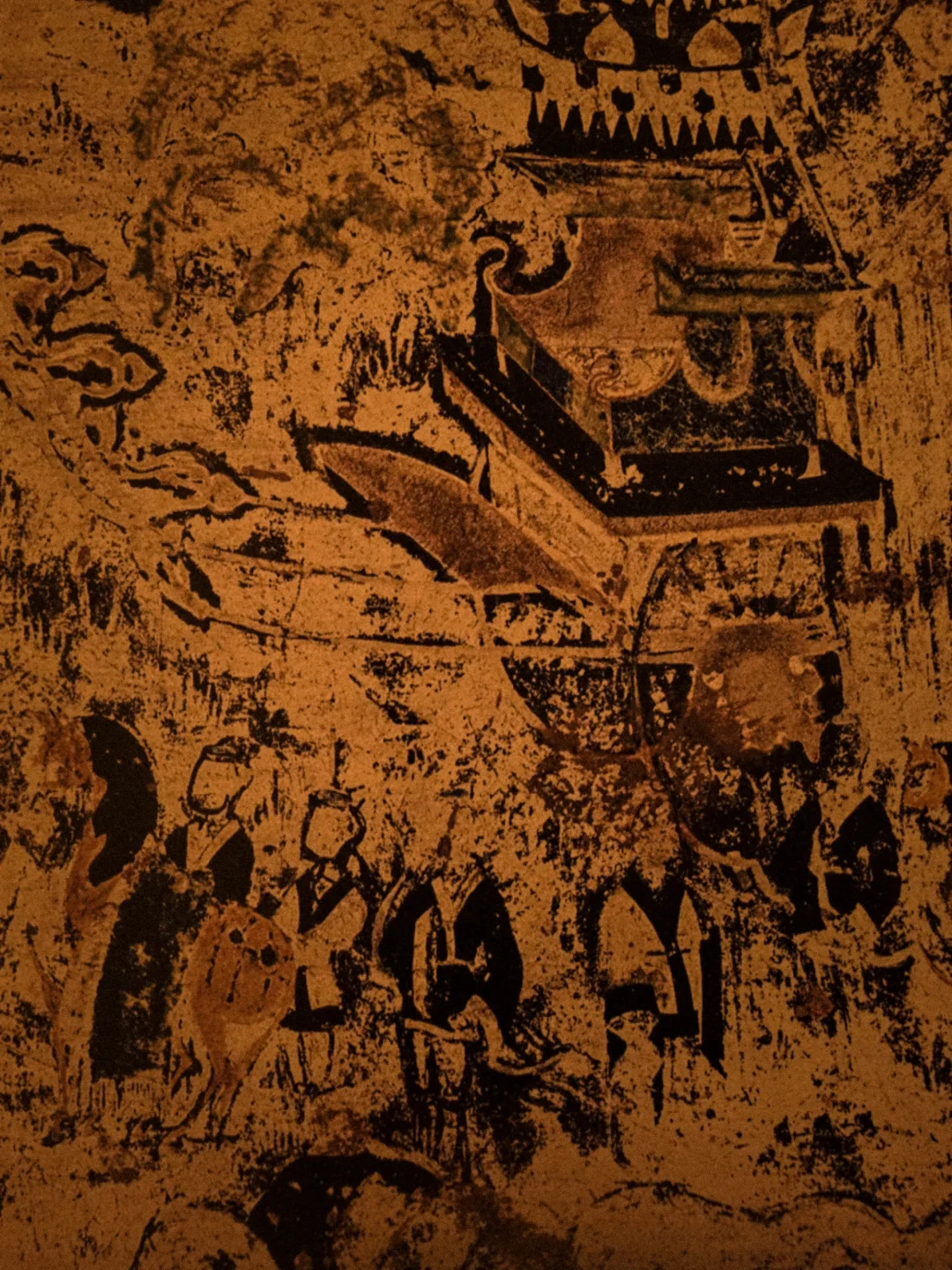 👉壁画是大型涅槃变,大多已剥落,但"八王争舍利"的情节相对完整,线条极富张力