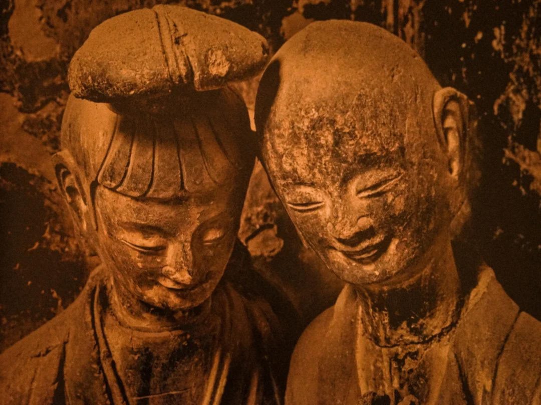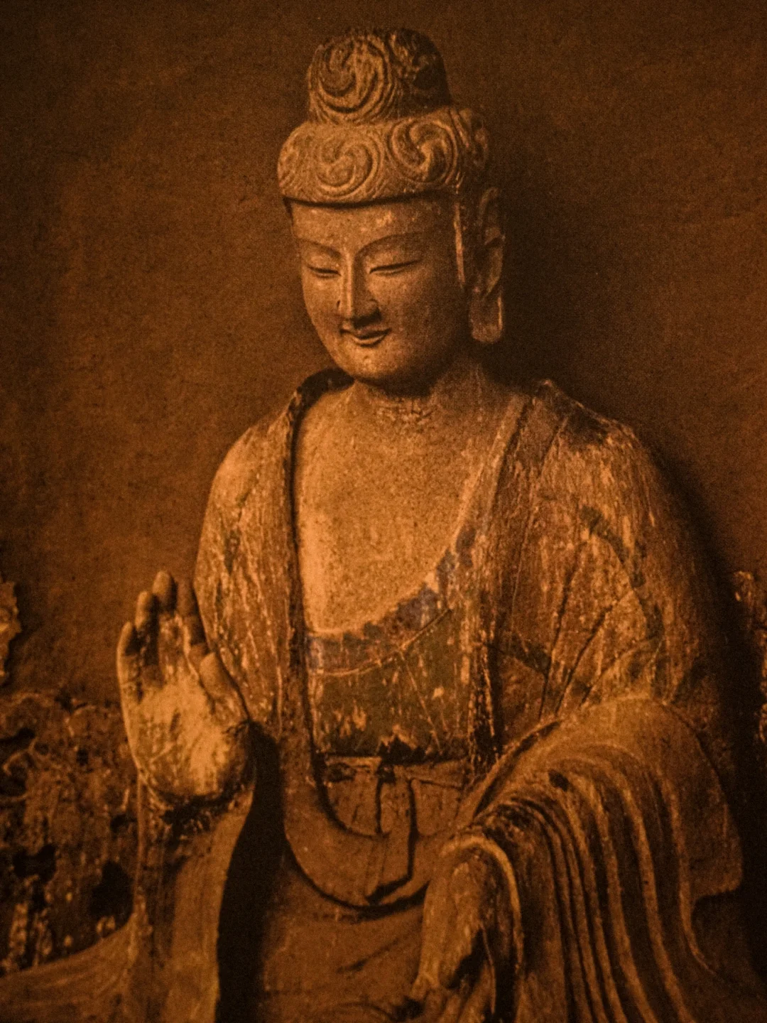 👉左壁龛的两尊菩萨像做示礼状,姿态优雅,神情温和,尤其左侧胁侍菩萨抚胸造型非常少见,颇有人格化特征