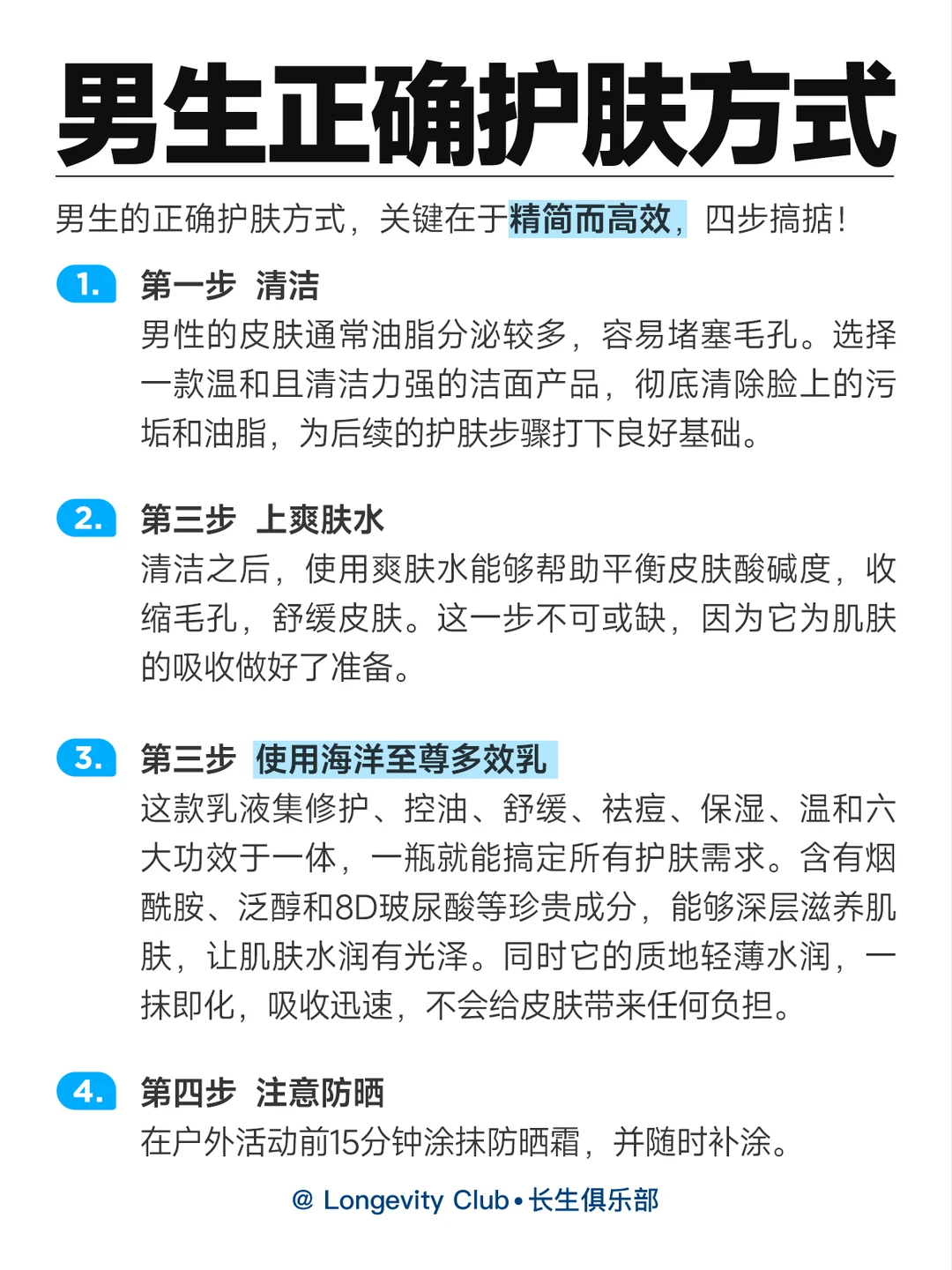 ☞第一步:清洁。男性的皮肤通常油脂分泌较多,容易堵塞毛孔。选择一款温和且清洁力强的洁面产品,彻底清除脸上的污垢和油脂,为后续的护肤步骤打下良好基础。