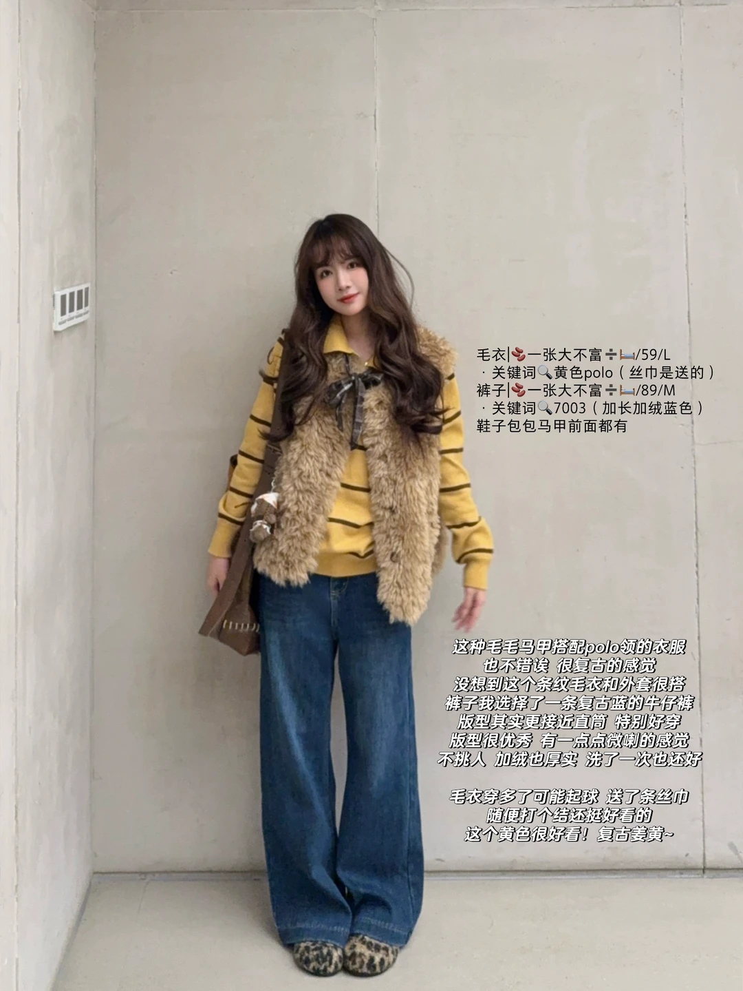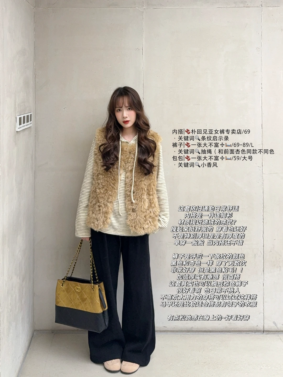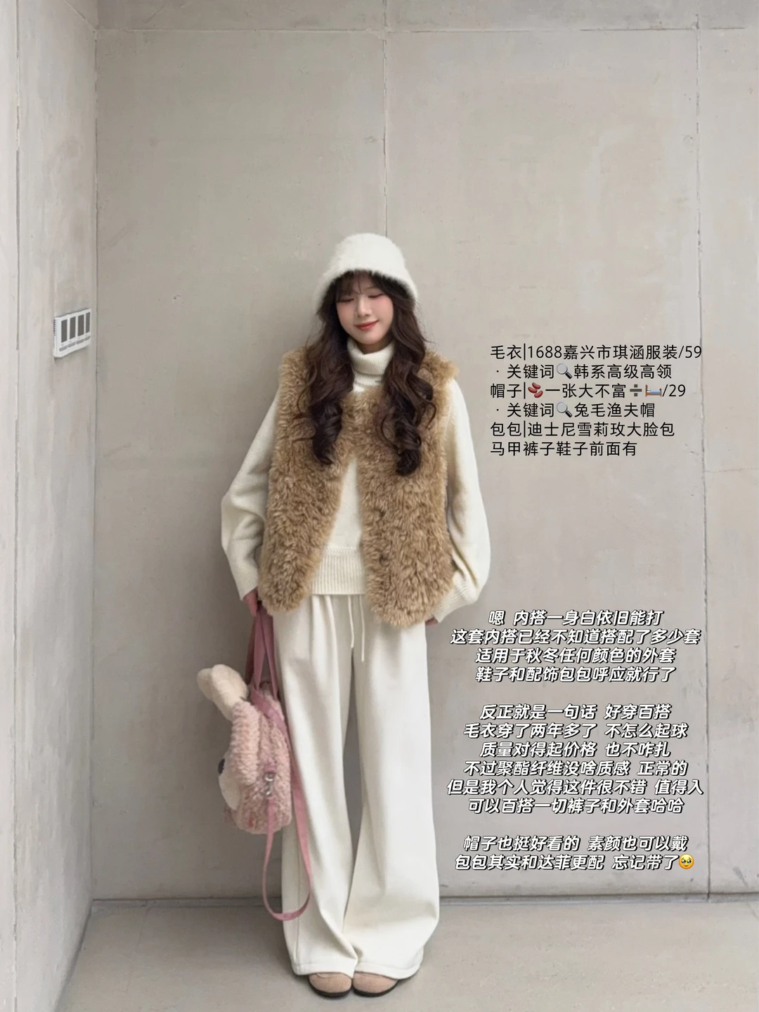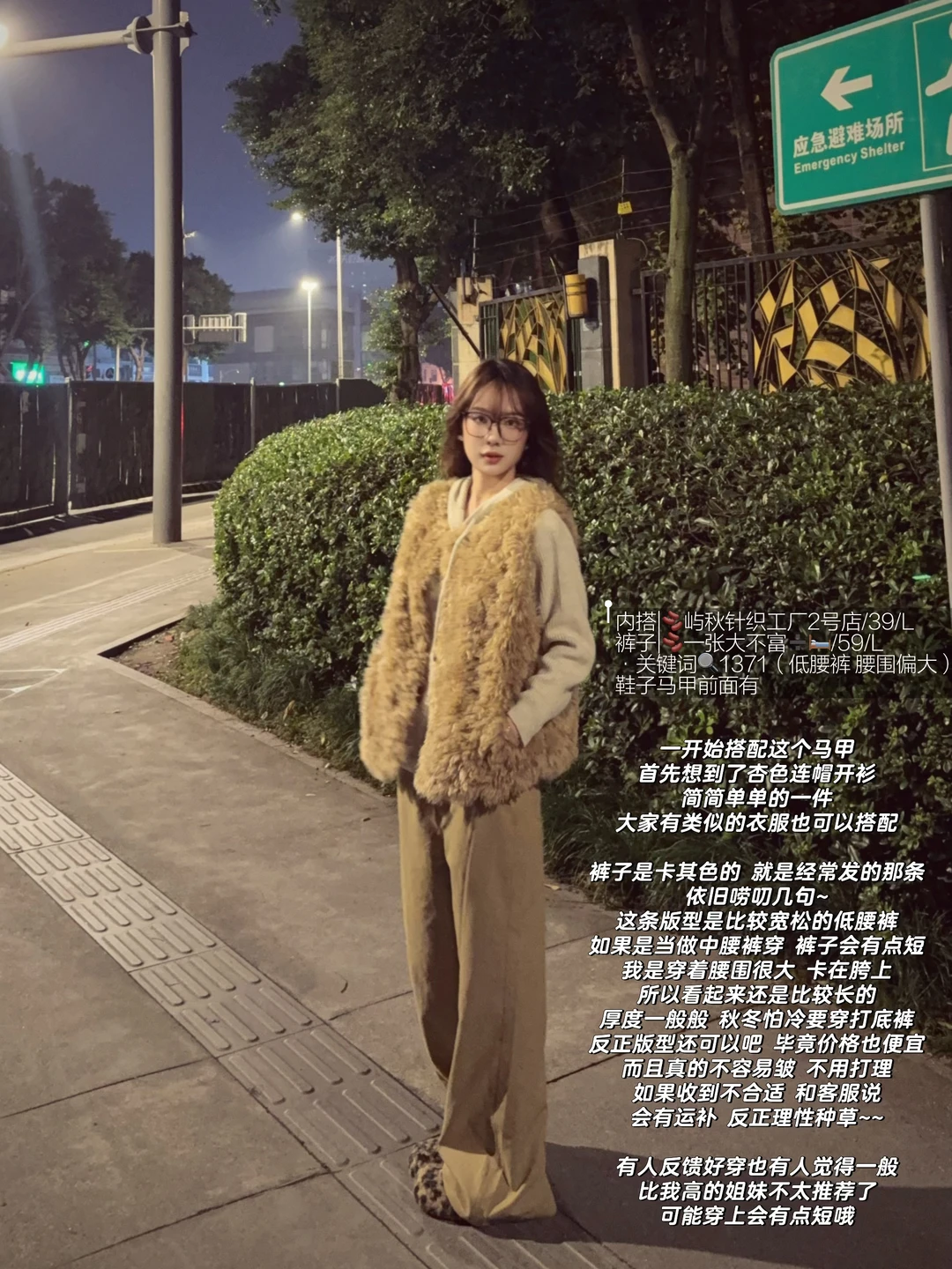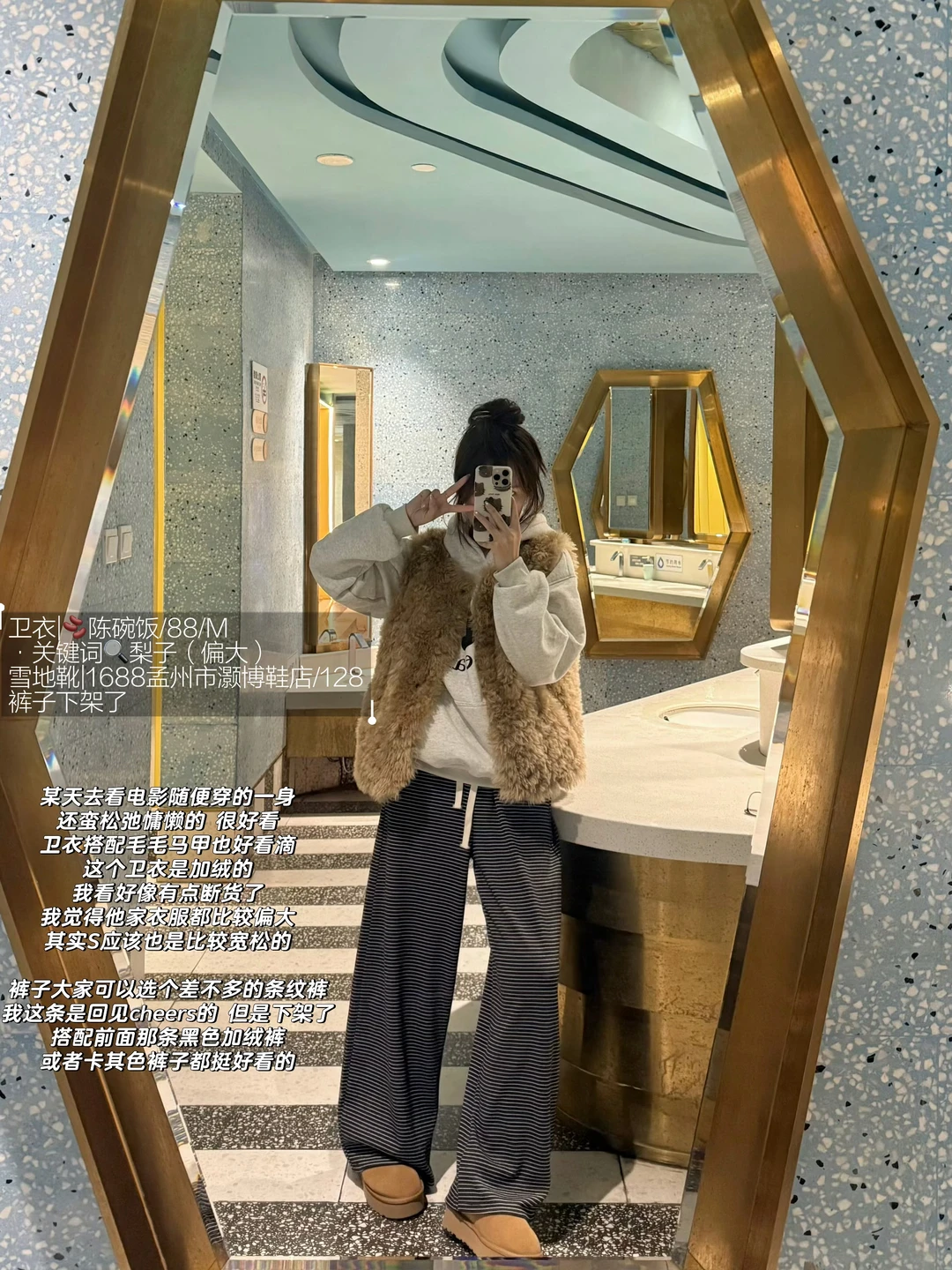 168/104左右 【纯分享理性种草 天冷加衣注意保暖】 来一期藤姐同款毛毛马甲的穿搭思路 应该蛮多姐妹都买了这件 不过我这件不是真皮草 是环保皮草 穿个样子 性价比还是不错的 马甲这种只适合南方啦 北方室内开暖气逛商场还是可以穿的 大概适宜温度在【10-20℃】左右 内搭可以穿个打底衫再穿拉链卫衣或者摇粒绒卫衣 这样会更保暖实穿一些 这几套我觉得都蛮好看 通勤日常和出去玩拍照的都有 大家各取所需哈~仅仅提供一个搭配思路