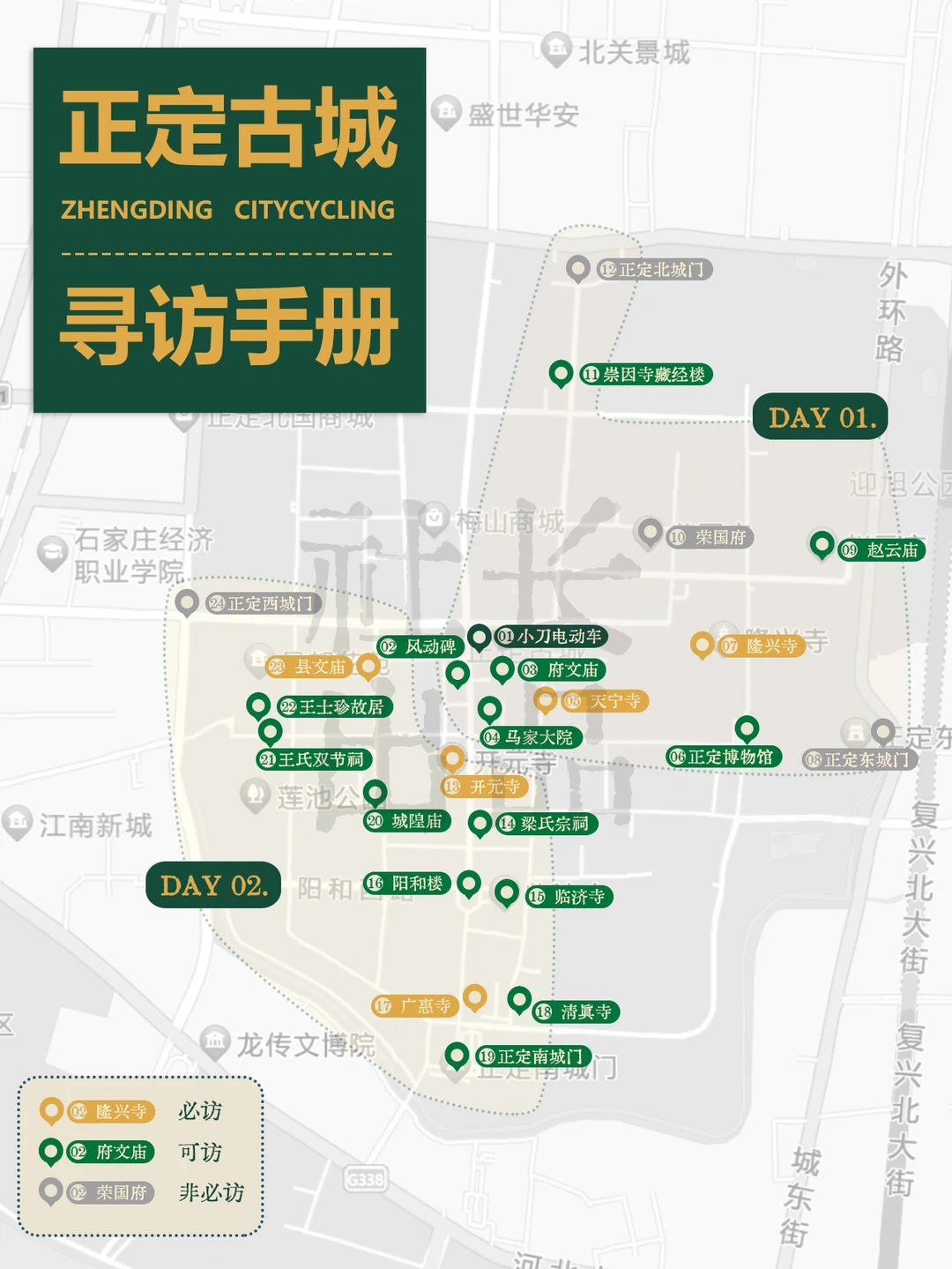 📚一天太赶,两个整天才是刚刚好的配置(寻访手册见图2⃣):D1⃣用【正定博物馆】开篇,剩下的时间留给主角【隆兴寺】,D2⃣走访抬头能看见的高塔和那座五代时期的【大成殿】,然后邂逅惊喜就好。