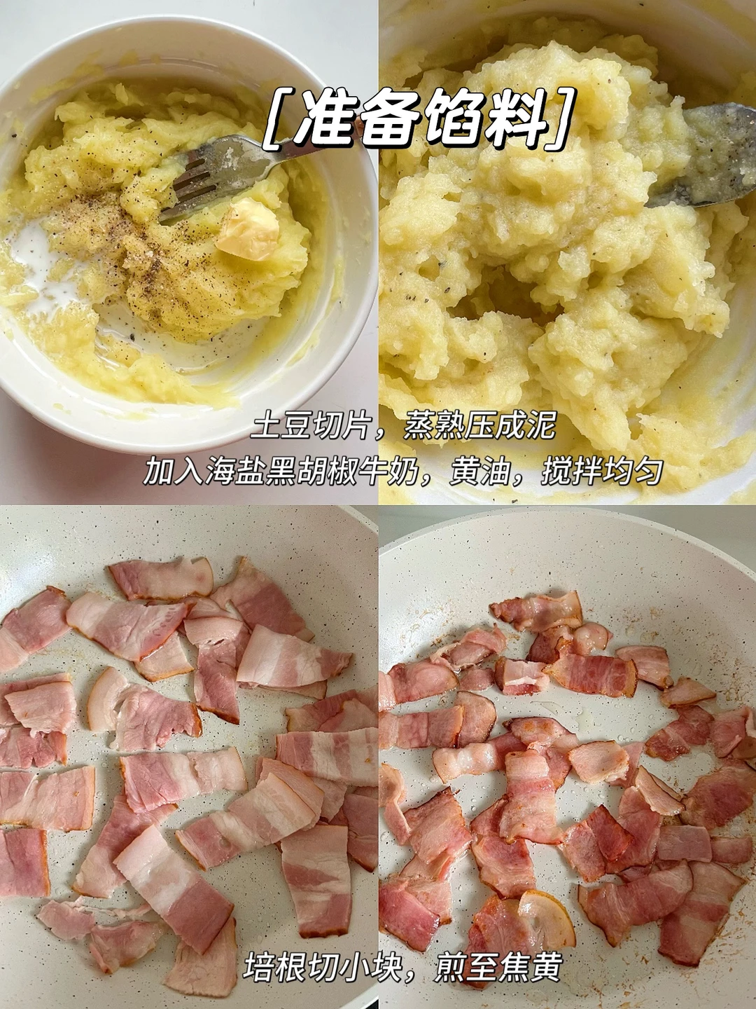 1️⃣土豆蒸熟压成泥,加海盐黑胡椒、牛奶、黄油混合均匀(根据干湿情况调整牛奶,不要一下子加太多)
