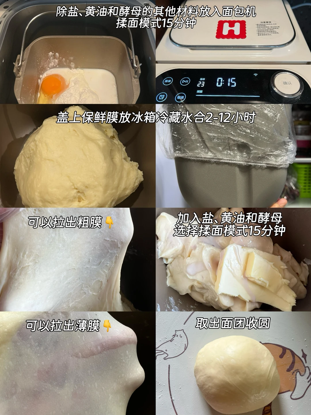 2️⃣ 加入盐、黄油和酵母选择揉面模式15分钟,可以拉出薄膜
