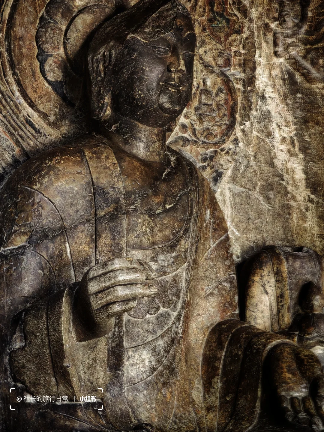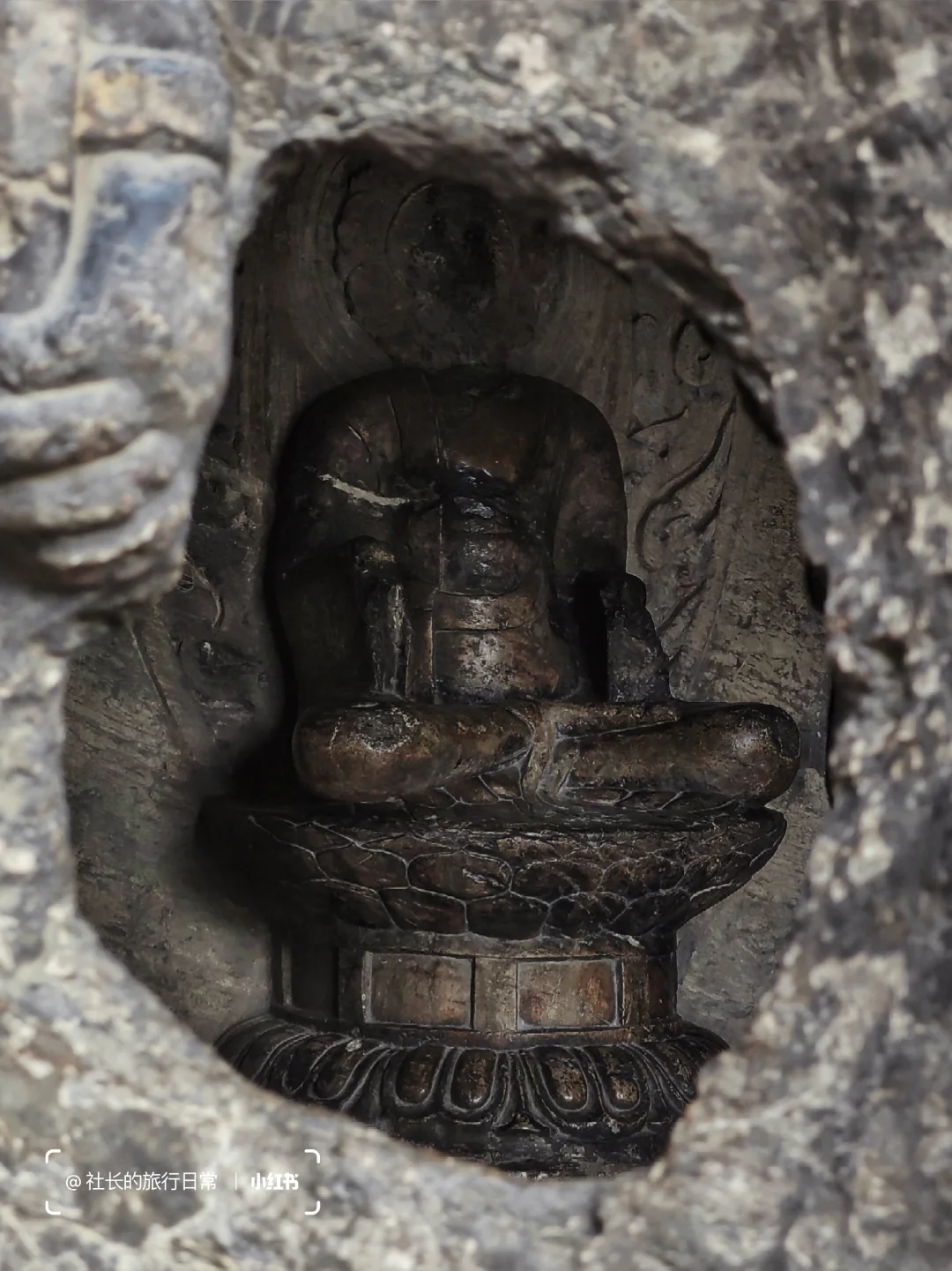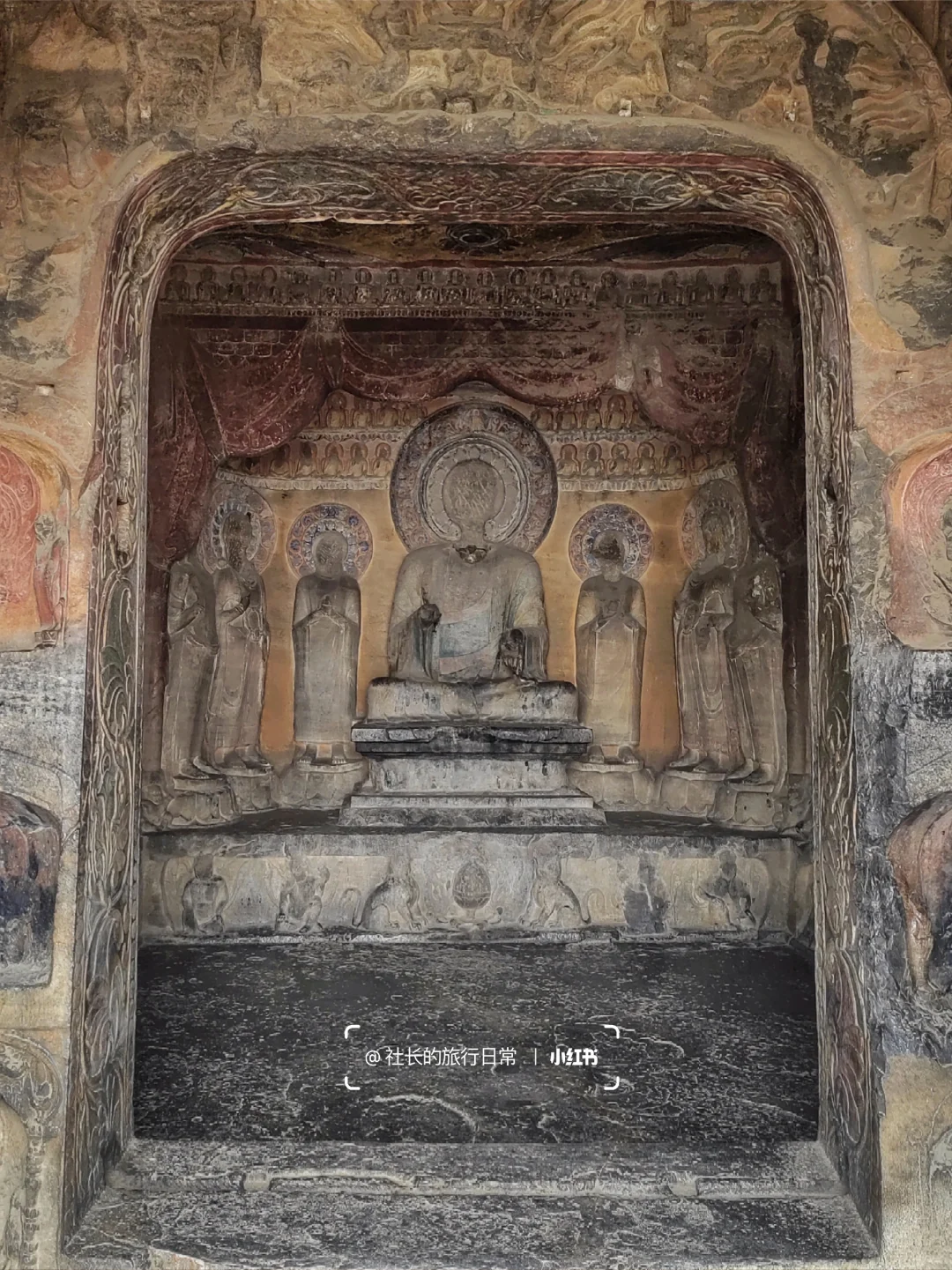 🔅释迦洞:造像头部均是后世增补,多少有些不协调,但窟门上细腻的忍冬宝珠纹清晰可见,保存完好