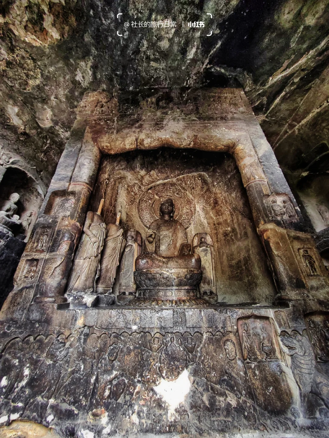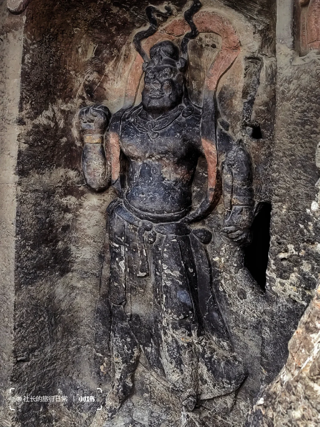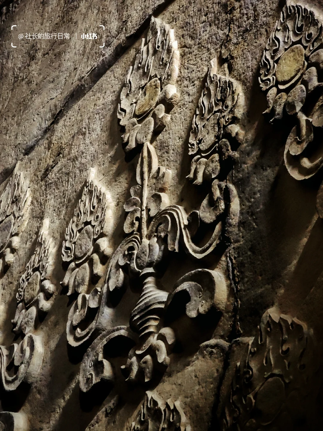 🔅大佛洞:保存相对完好,主佛的火焰纹莲花卷草纹很华丽,细看还有火龙穿插期间;注意中心塔柱右龛顶部的空洞,据说是存放高欢棺椁的陵穴;四周佛龛顶部塔刹是响堂山独有的宝相花造型,再无分号;注意看四周基座,还有少见的神王形象,同样是北齐时期的标志
