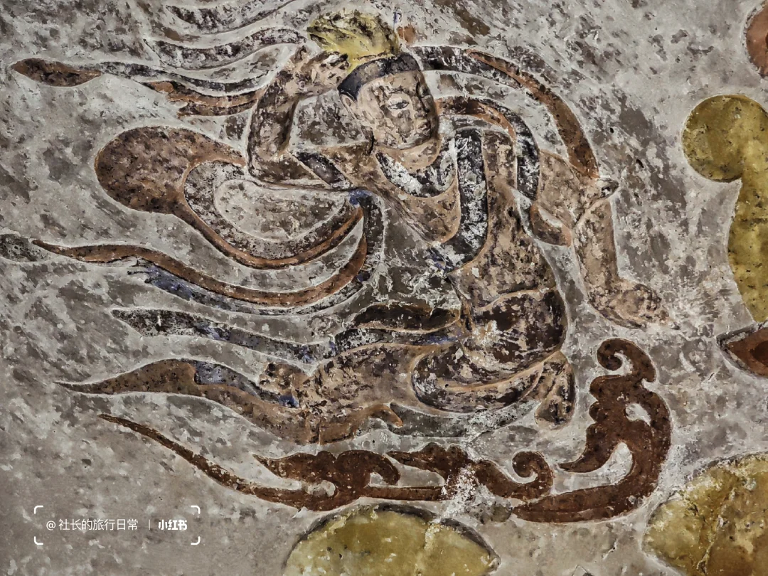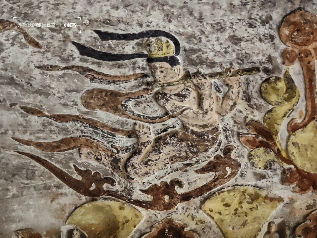 🔅第七窟千佛洞看点最足:窟顶清晰的八位男相飞天乐伎姿态各异,动作飘逸,窟龛外部还有石仿木建筑结构,门口两尊可爱力士也非常吸睛