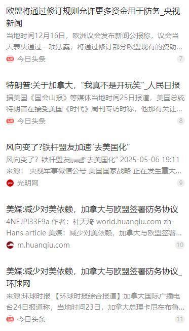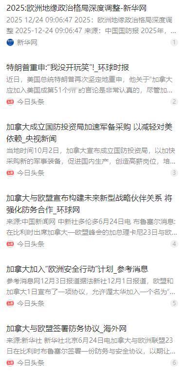 就在特朗普准备把加拿大变成“美国第51州”的狂想时刻,加拿大用一个惊天动作,直接废掉了美国的“金穹”防御网!这动作就是:加入欧盟安全计划。谁能想到,身为北约成员、美国邻居的加拿大,竟然要把自己的国防安全,交给大洋彼岸的冯德莱恩? 麻烦看官老爷们右上角点击一下“关注”,既方便您进行讨论和分享,又能给您带来不一样的参与感,感谢您的支持! 2025 年,国际政坛上一场围绕主权与安全的博弈意外升温。美国总统特朗普在多次公开场合和私下通话中,反复提及让加拿大成为 “美国第 51 个州” 的主张,甚至在接受《时代》周刊专访时严肃表态 “绝非玩笑”,打破了外界对这一言论的调侃猜测。 特朗普给出的 “合并理由” 充满利益算计,声称美国每年因对加贸易逆差亏损 2000 亿至 2500 亿美元,还包揽了加拿大的防务保障,却 “不需要加拿大的任何产品”。他同时暗示,加拿大若想享受美国正在推进的先进导弹防御体系,归顺美国是唯一途径。 这一主张瞬间点燃加拿大舆论,从政界到民间都掀起强烈反对浪潮。4 月,加拿大多个城市爆发抗议集会,民众举着 “别插手”“加拿大本就伟大” 的标语,明确表达主权不容侵犯的立场。马尼托巴省省长直接发声,强调加拿大永远不会成为美国的一个州。 面对特朗普的强硬施压,加拿大总理卡尼没有选择妥协。3 月 28 日与特朗普通话时,他当场拒绝了 “第 51 州” 的提议,尽管事后为避免局势激化,对外表示 “同意在这个问题上保留不同意见”,但私下已加快布局防务自主的步伐。 卡尼政府的反击策略清晰且坚定:通过多元合作摆脱对美国的防务依赖。数据显示,此前加拿大约 70% 至 75% 的防务开支流向美国,军事装备大多依赖美制产品,这种单一依赖让国家安全感岌岌可危。 2025 年 6 月 23 日,布鲁塞尔的加拿大 — 欧盟峰会上传来重磅消息,卡尼与欧盟委员会主席冯德莱恩、欧洲理事会主席科斯塔共同签署 “安全与防务伙伴关系” 协议,宣告双方构建新型战略伙伴关系。 冯德莱恩在签约后明确表示,这只是双方合作的开始,加拿大将在欧洲快速演变的防务架构中发挥重要作用。欧洲理事会主席科斯塔也强调,尽管北约仍是集体防御基石,但这一伙伴关系能让双方 “更快更好地加强战备”。 这份协议为加拿大打开了广阔的欧洲防务市场,使其得以参与总额达 1.25 万亿美元的欧盟 “重新武装欧洲” 计划,以及规模 1500 亿欧元的 “欧洲安全行动”(SAFE)防务融资计划。作为首个加入 SAFE 的非欧盟国家,加拿大企业可申请低息贷款参与联合军备采购。 合作带来的实惠立竿见影:加拿大防务公司获得进入欧洲一体化防务装备市场的通道,本土军工产业迎来发展机遇。卡尼政府还计划通过合作构建自主供应链,创造高薪岗位,培育国内工业联盟。 欧盟方面同样受益颇丰,加拿大的加入为 “重新武装欧洲” 计划注入新活力。2025 年欧盟启动冷战后最大规模的防务自主进程,投入 8000 亿欧元推动防务体系建设,目标 2030 年建成一体化防务装备市场,加拿大的参与恰好弥补了部分能力短板。 双方的合作还延伸到多个关键领域,包括海事安全、网络安全、危机管理、军事机动性等,承诺扩大防务能力协作,探索加拿大与欧盟防务局建立更紧密联系,甚至考虑让加拿大参与欧盟 “永久结构性合作” 防务项目。 为进一步巩固防务自主成果,加拿大在 10 月成立国防投资局,由加拿大皇家银行前副董事长出任首席执行官,全面改革国防采购流程,精简审批环节,为与欧洲及其他盟友的合作铺路。 卡尼政府还重新审查了原本计划采购的美国 F-35 战斗机项目,积极考察瑞典萨博集团的 “鹰狮” 战斗机等替代选项,核心考量是增加装备在加拿大的生产比重,减少对美制装备的单一依赖。韩国的 K-9 自行榴弹炮也进入采购视野,有望快速填补战备缺口。 加拿大的一系列动作,直接打破了美国通过导弹防御体系一统北美防务的盘算。特朗普政府原本希望通过防务捆绑迫使加拿大妥协,却没想到反而推动加拿大加速 “去美国化”,形成跨大西洋的防务新纽带。 这场博弈背后,是全球安全格局的深刻调整。2025 年,欧洲因美国 “战略收缩” 面临安全保障缺口,全力推进防务自主,多国大幅增加军费、扩大军队规模、改革兵役制度,加拿大的加入恰好形成互补。 从实际影响来看,加欧防务合作并未否定北约的作用,而是探索了多元安全合作的新路径。加拿大皇家军事学院教授指出,欧盟的防务伙伴关系不涉及军事作战,不会成为北约替代品,但为盟友提供了更多安全选择。 卡尼在多个场合强调,当前国际环境不稳定,加拿大寻求伙伴关系多元化是必然选择,与欧盟的合作正是 “求助于最可靠盟友” 的体现。这种合作模式既保障了加拿大的主权独立,又为经济发展注入动力。