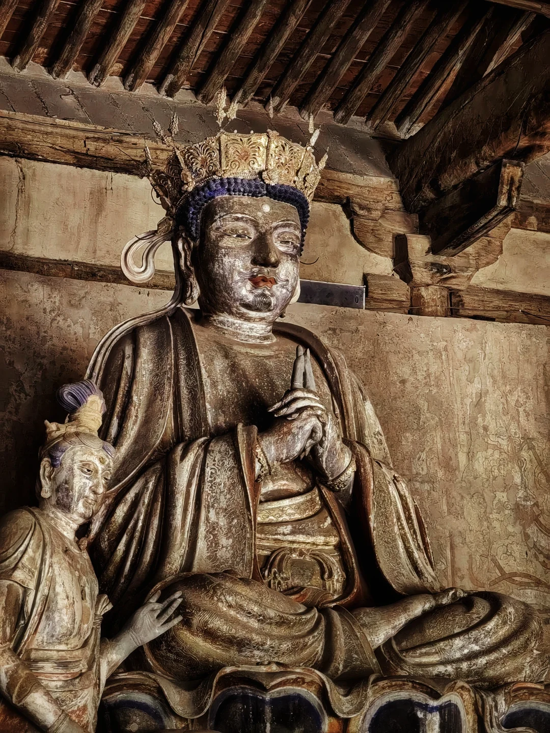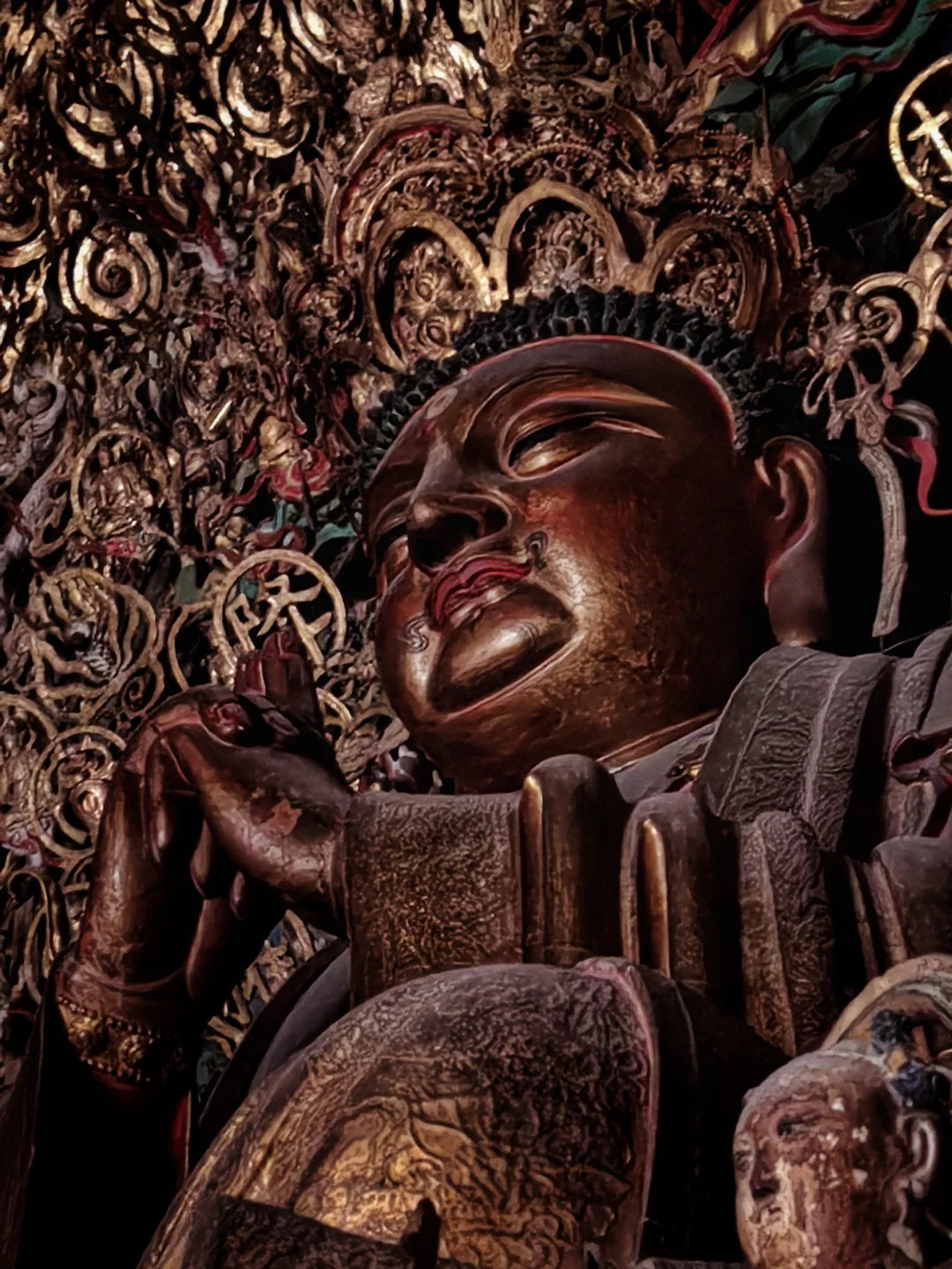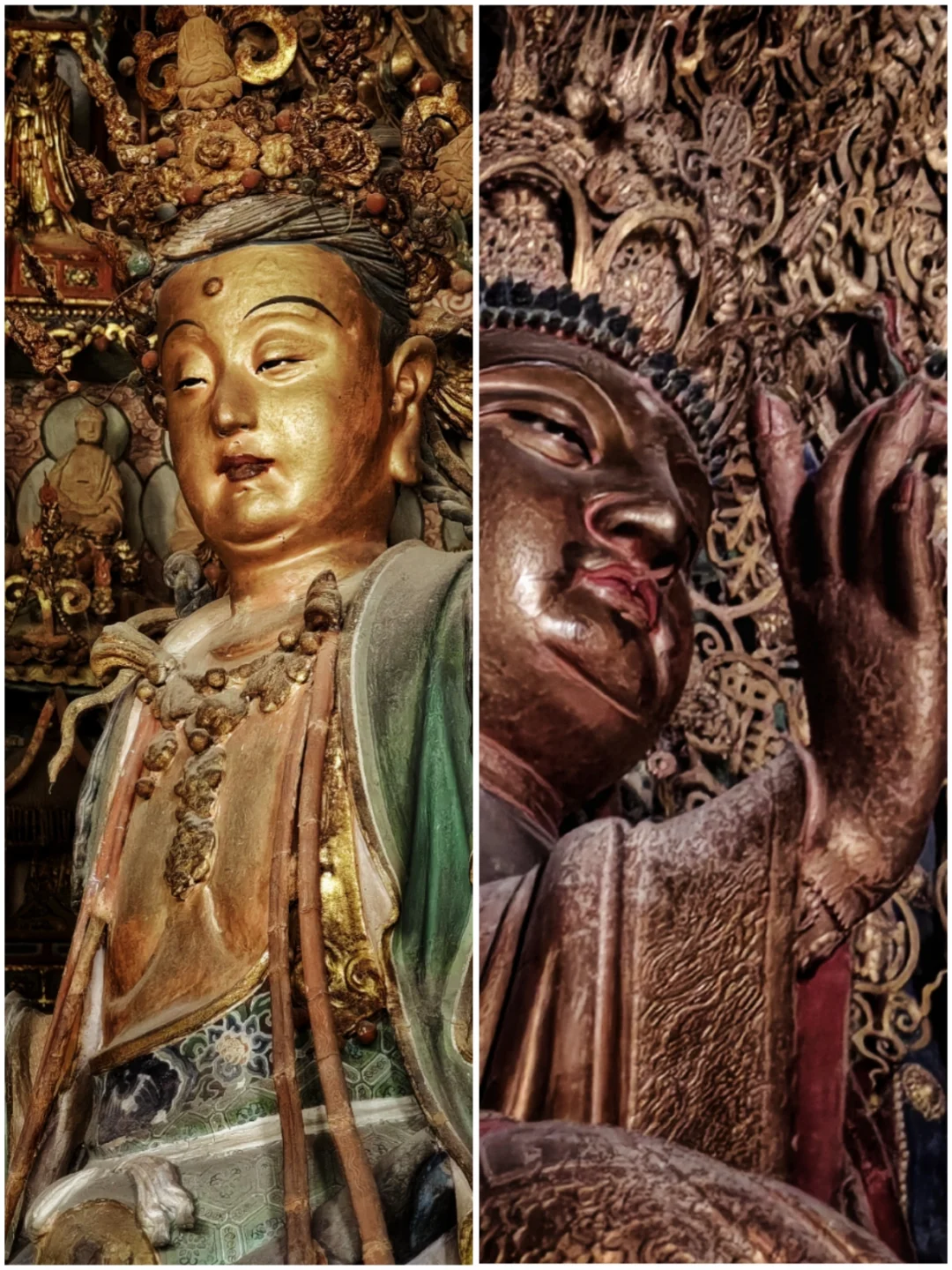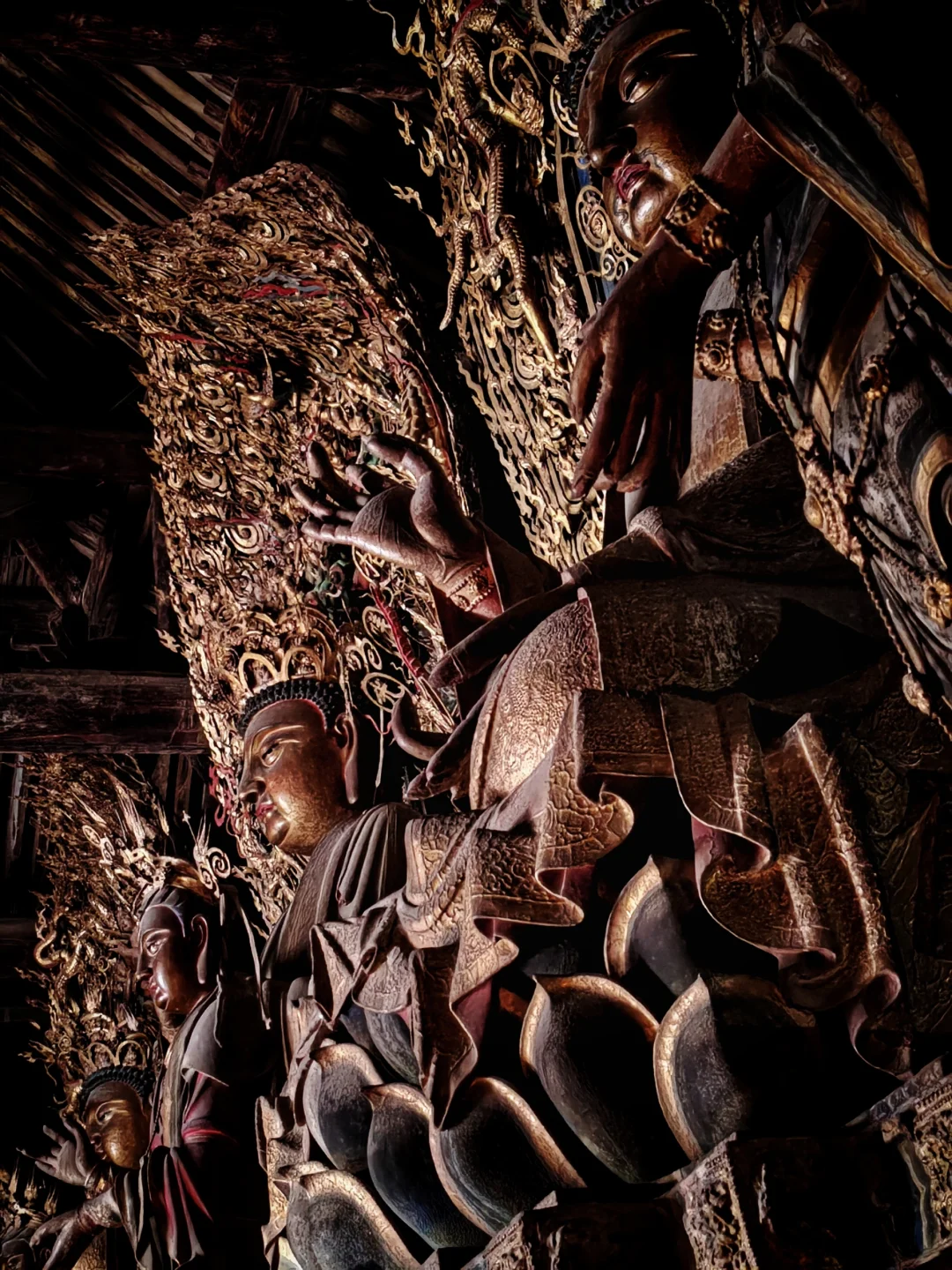 👉原来小西天后面的修复都有意未上色,意在让后世区分原装与修缮,仔细端详这些悬塑就能找到修补的痕迹