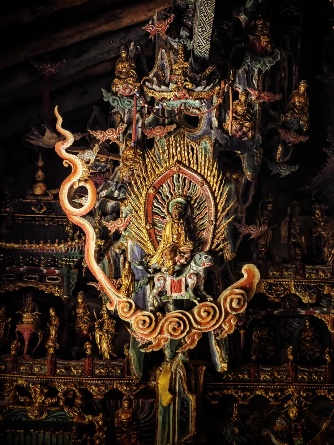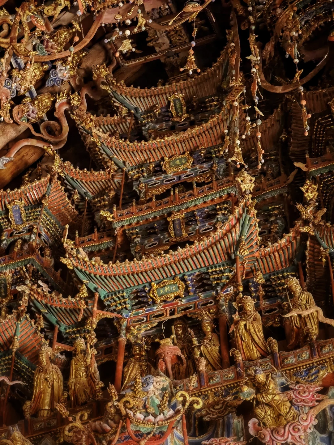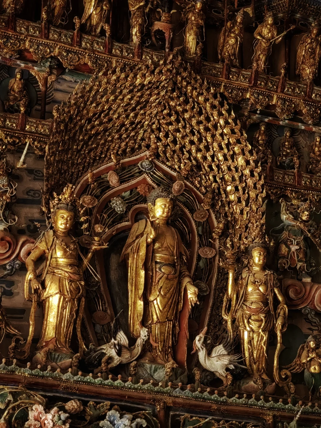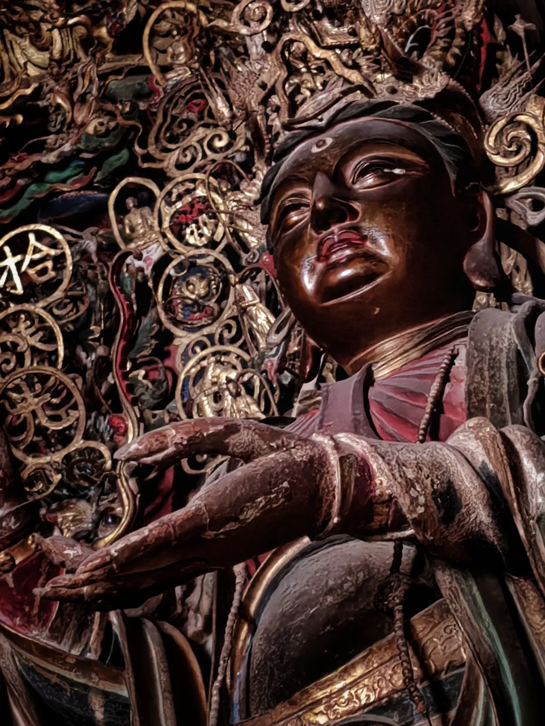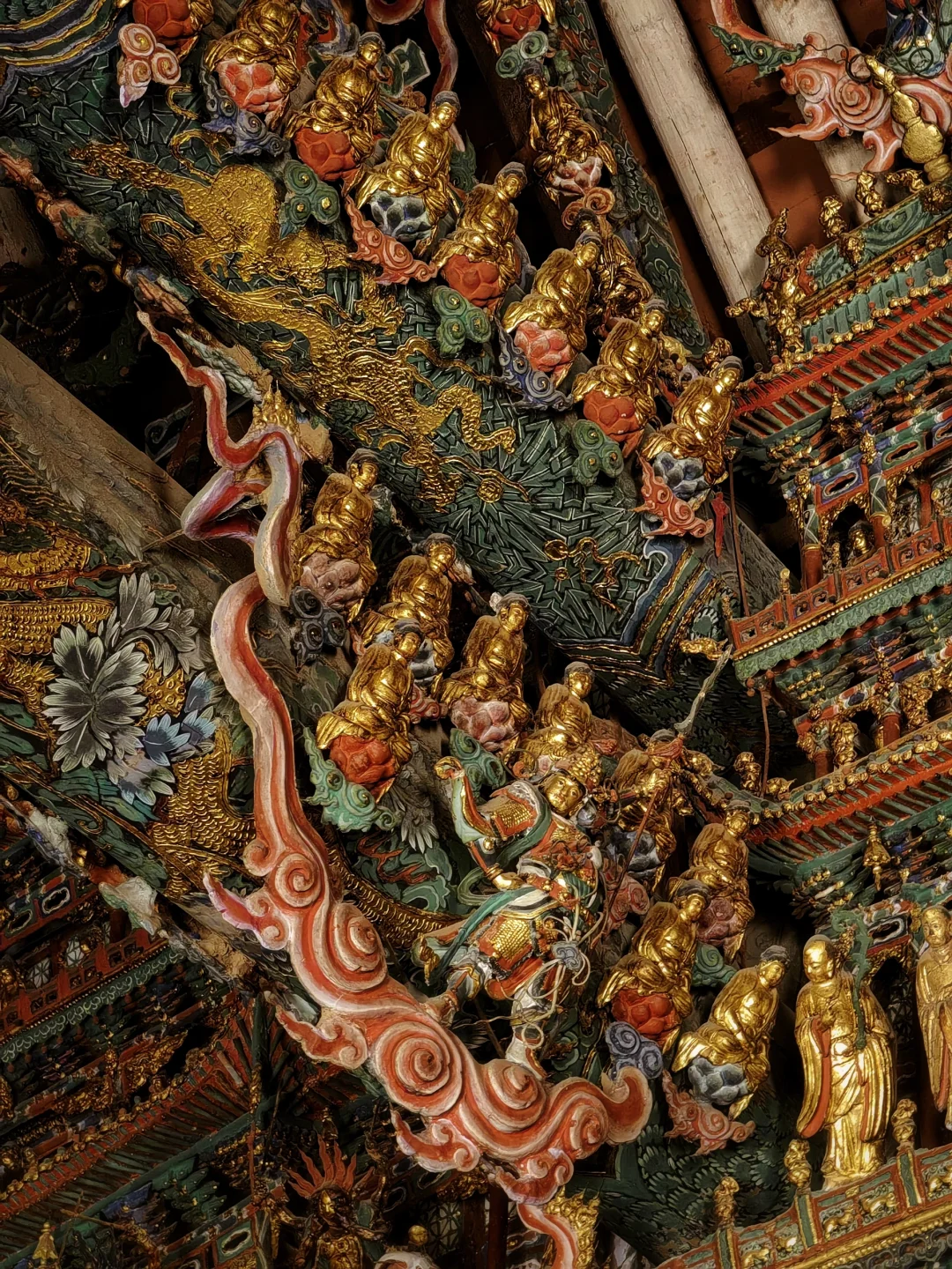 👉原来小西天后面的修复都有意未上色,意在让后世区分原装与修缮,仔细端详这些悬塑就能找到修补的痕迹