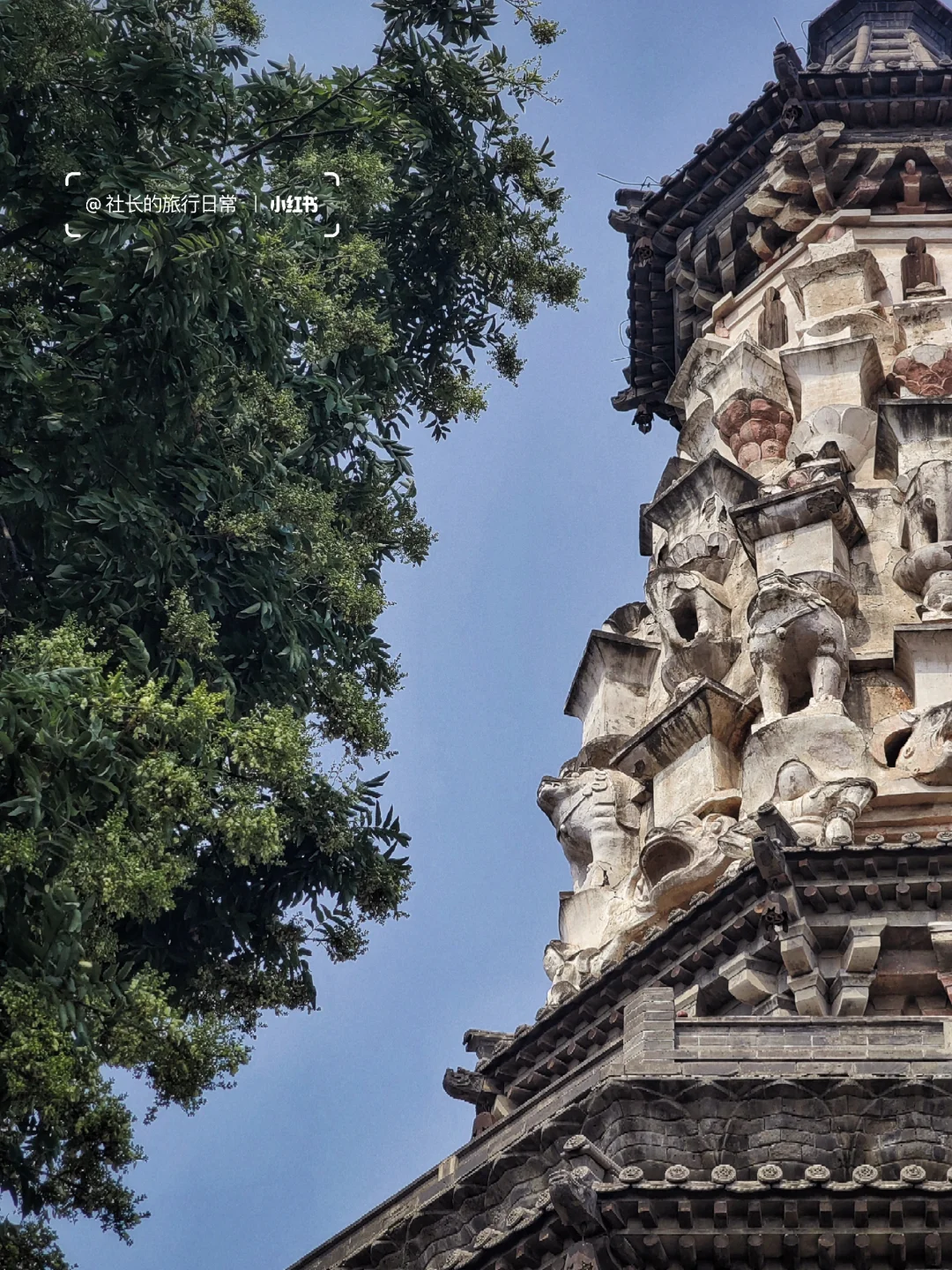 🌈广惠寺:广惠寺华塔是四塔中最特立独行的,一方面塔身有力士、猛兽、神佛一类的精美造像,另一方面"大塔+小塔"这种巧妙结合看起来也颇具异域美感,这样的塔造仅存于宋金时期,据说当时塔身还有金箔华彩,我们想象了下,还是更喜欢现在朴素的样子