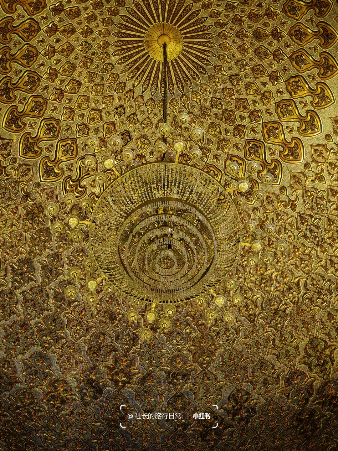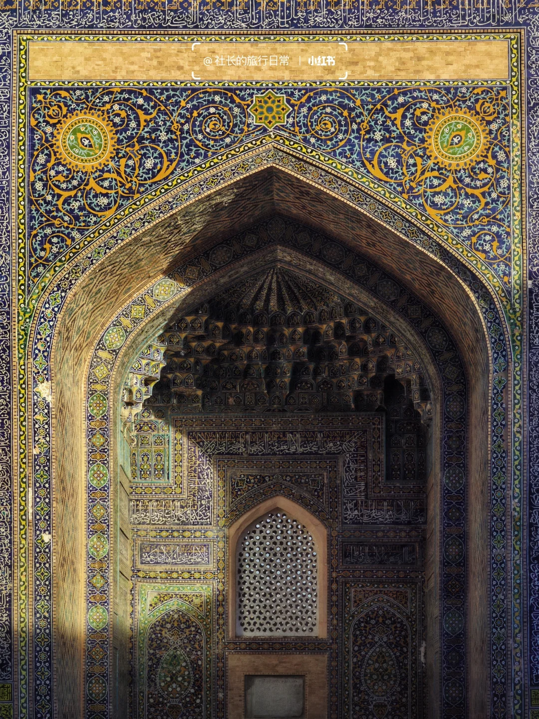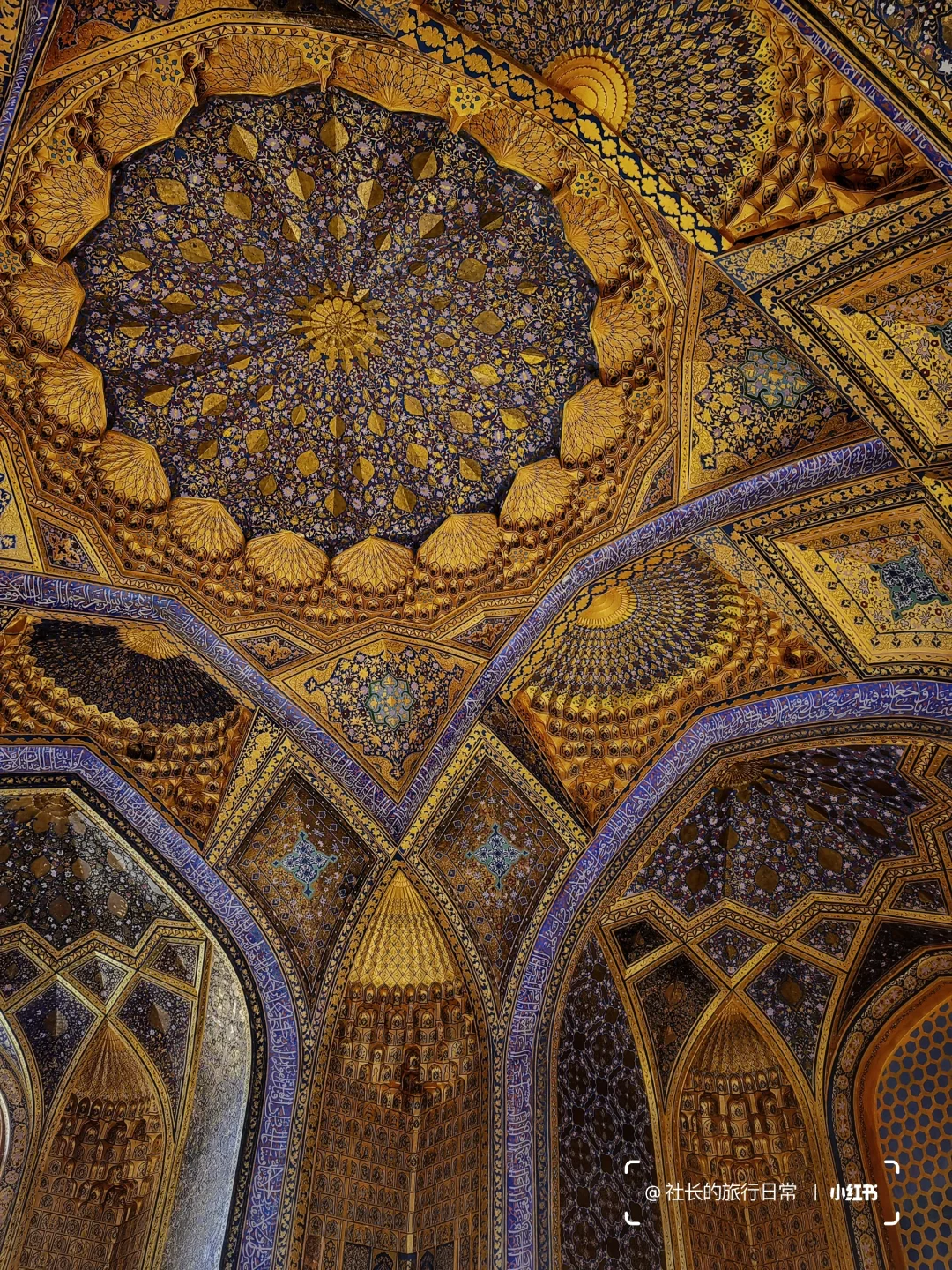 👉中间的【Tilla-Kori神学院】有着惊人的穹顶装饰,灿烂的金叶和湛蓝的马赛克交相辉映,独特的设计让原本的平顶看起来有拱起之感,堪称中亚穹顶辉煌的“天花板”