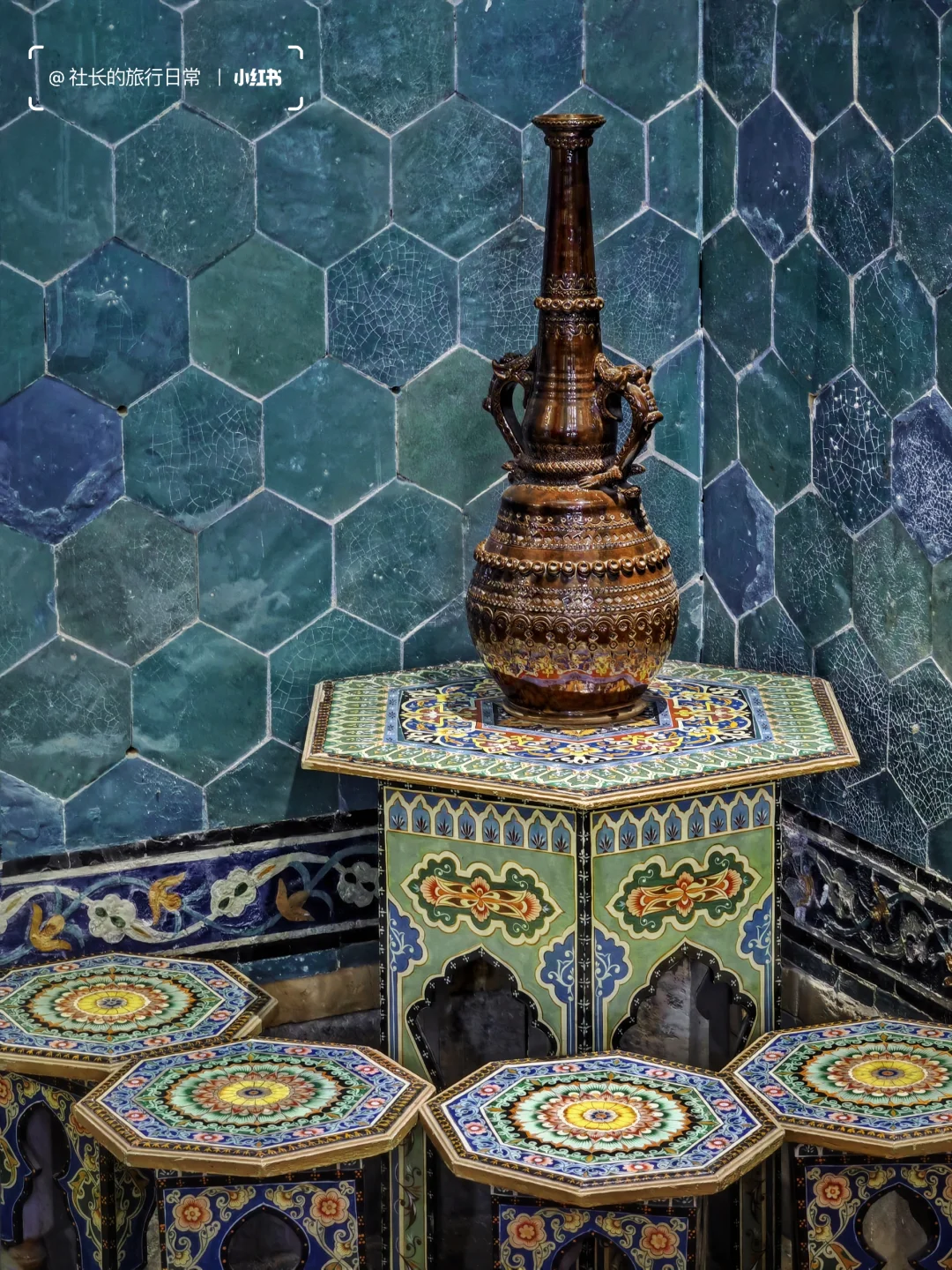 老远就能看见以Gur-E-Amir为代表的巨大陵墓,在老旧社区的衬托下颇有奇幻感,【Gur-E-Amir陵墓】意为“国王的陵墓”,起初是一座贵族神学院,后因帖木儿孙子的意外去世而逐渐变成家族陵墓。主厅的金碧辉煌丝毫不输Tilla-Kori,里面的安葬着帖木儿家族和导师,据说曾有人打开过这些石棺,从而认证了“跛子”帖木儿和“断头”Ulugbek的说法,也开启了“开棺之时,将有更可怕的敌人降临”的诅咒