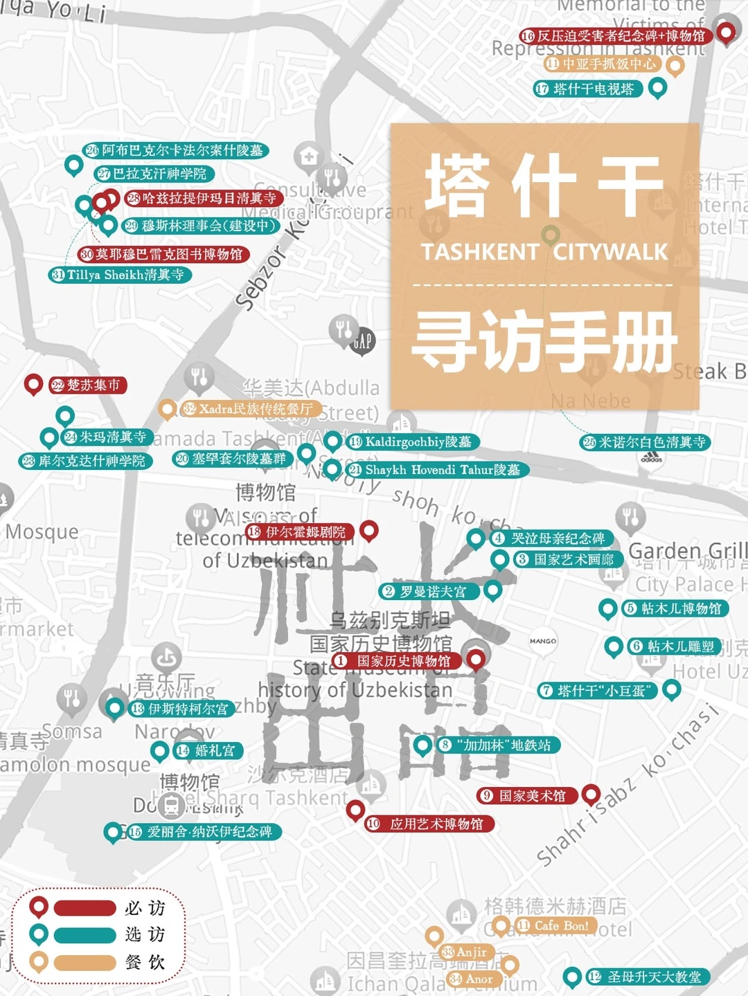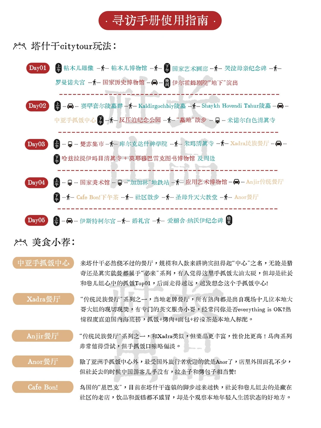 我们在塔什干住了4个晚上——这是非典型玩法,老城与新区各有迷人魅力,特别奉上秘制citytour吃喝玩乐手册(划重点!见图2⃣)以及每日玩法参考(见图3⃣),篇幅所限,不再赘述。