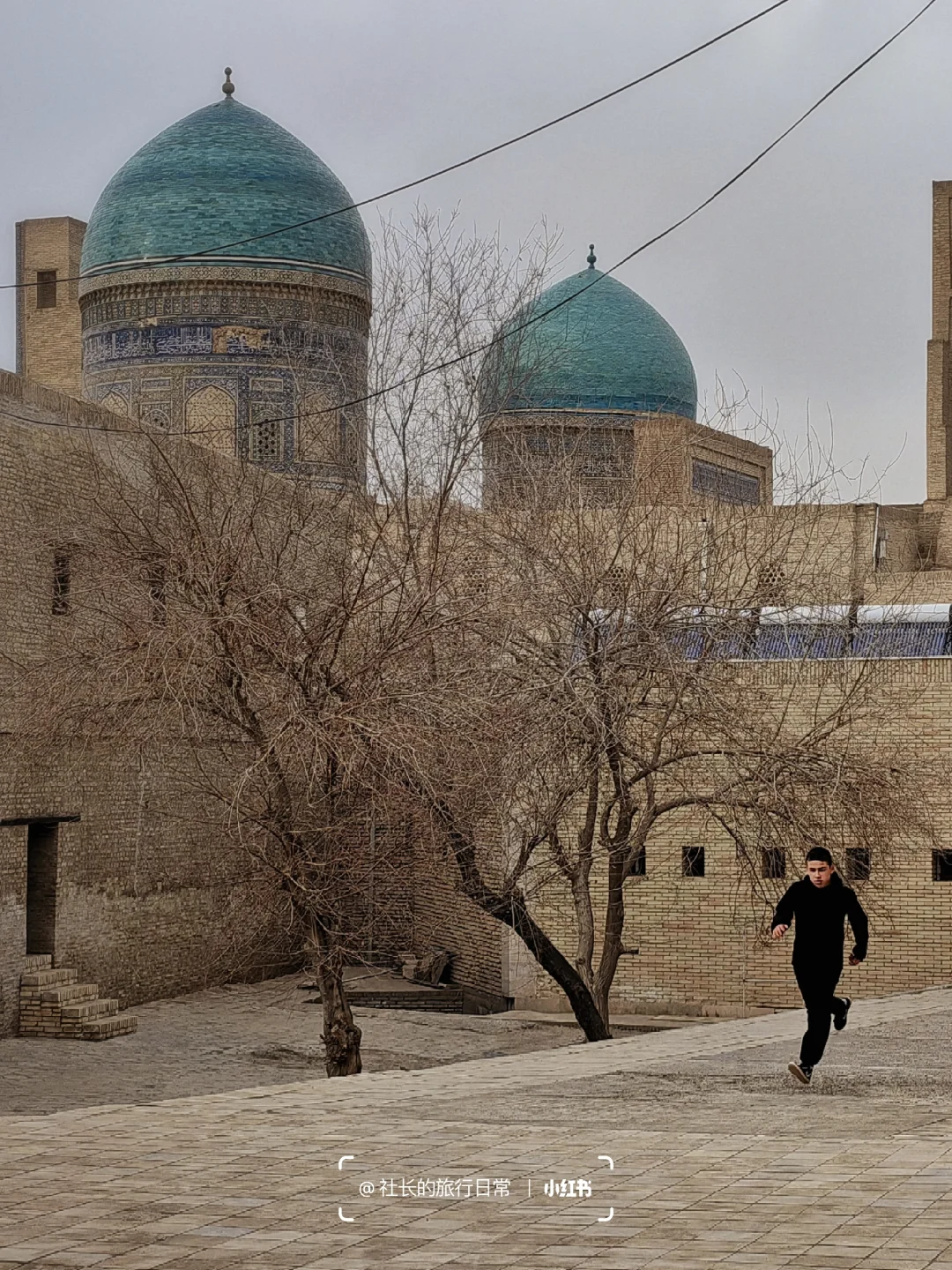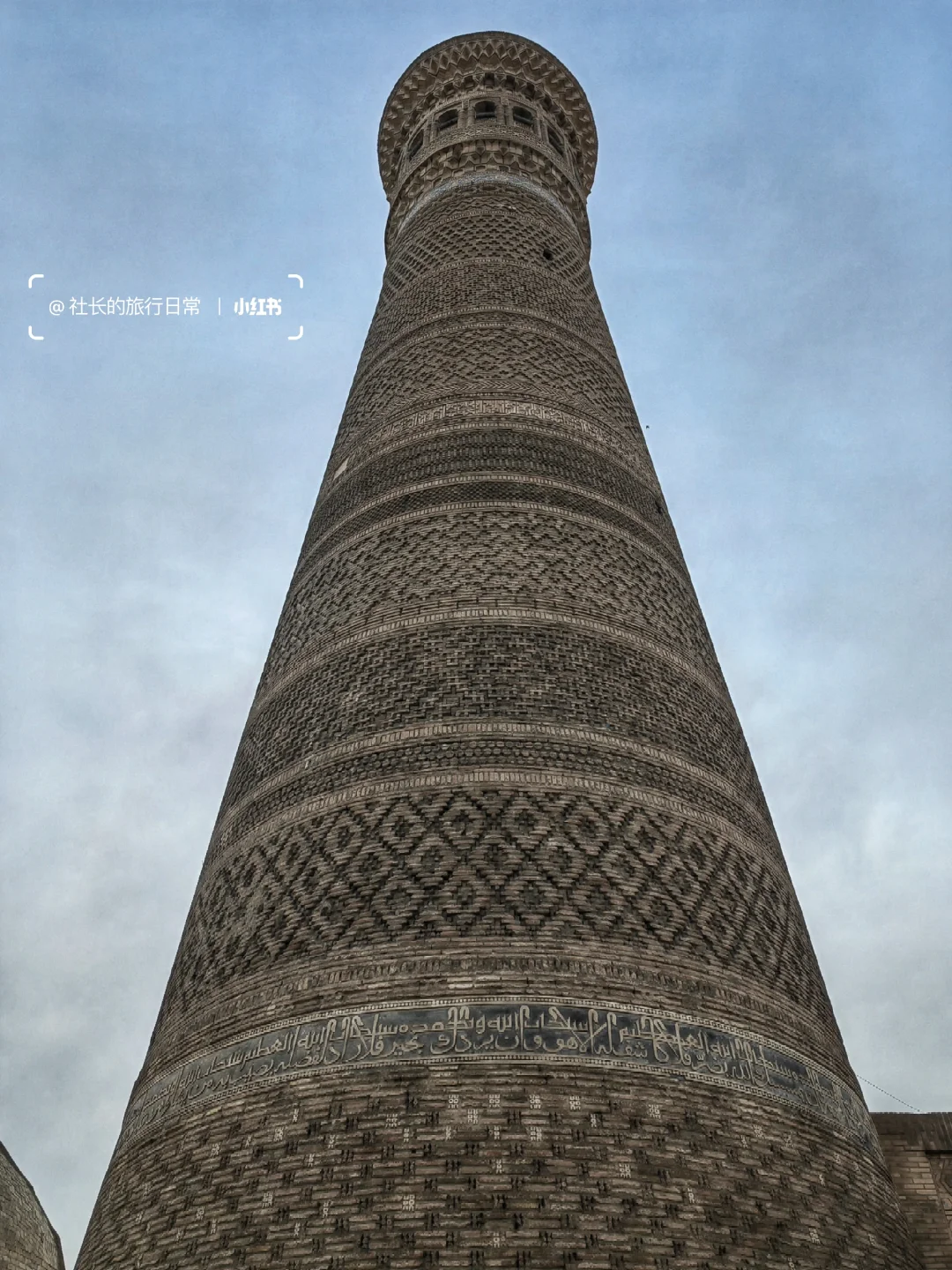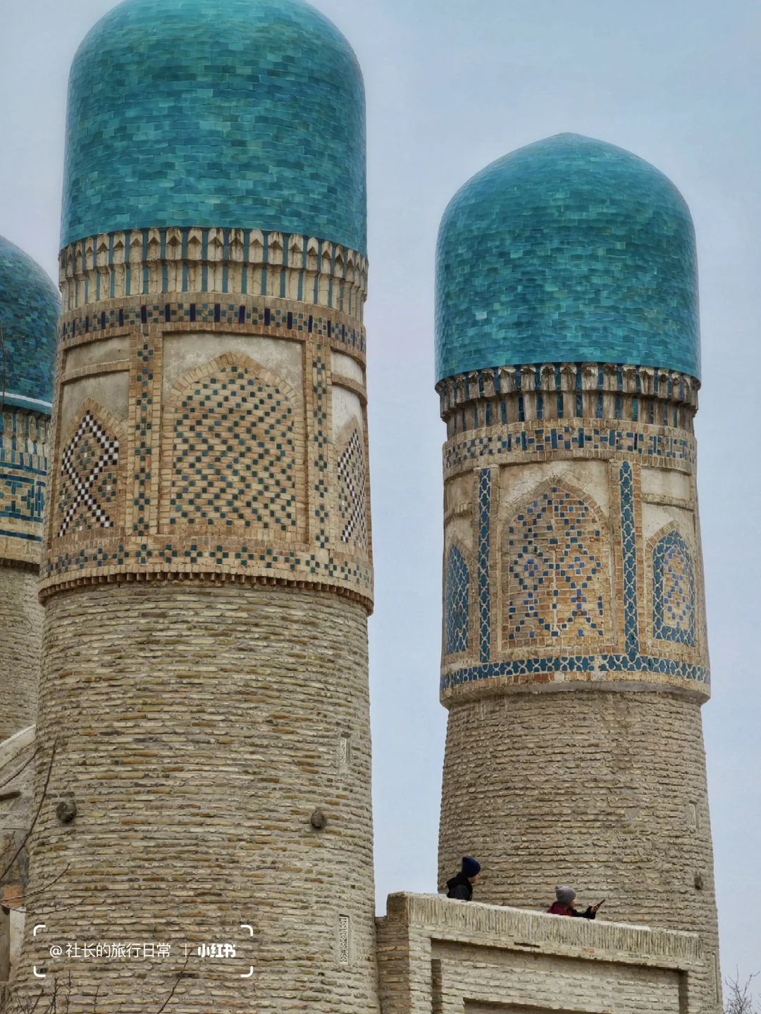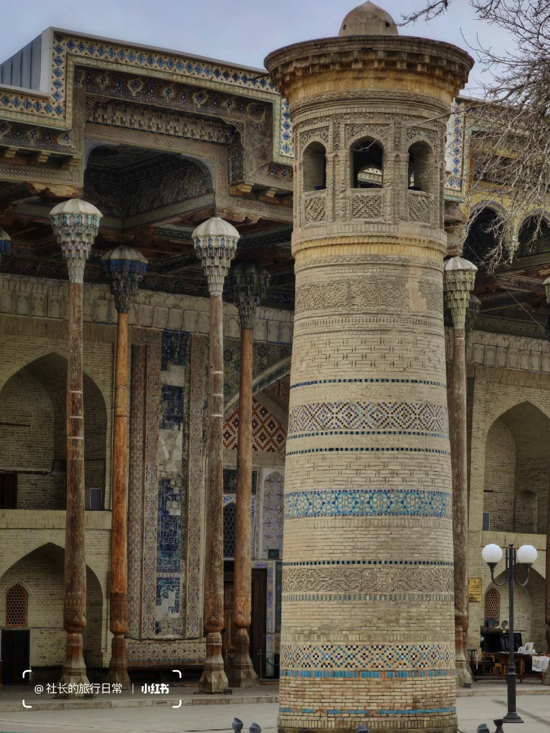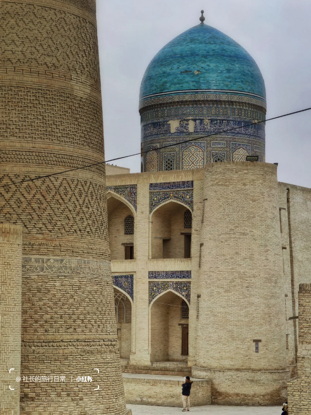 💡巨大的【喀龙宣礼塔】是我们老城漫步的地标,是当年“震住”成吉思汗的神塔,也是曾经堕楼示众的处刑台,细看塔身每层装饰都有所不同,还能找到当年伏龙芝大炮擦伤的痕迹,背后的【喀龙清真寺】同样体格庞大,据说曾容纳万人同时礼拜,16世纪以来几乎未经重新雕饰。对面的【Mir-i-Arab神学院】拥有布哈拉最耀眼的穹顶,内里至今仍有学生使用,故无法入内参观
