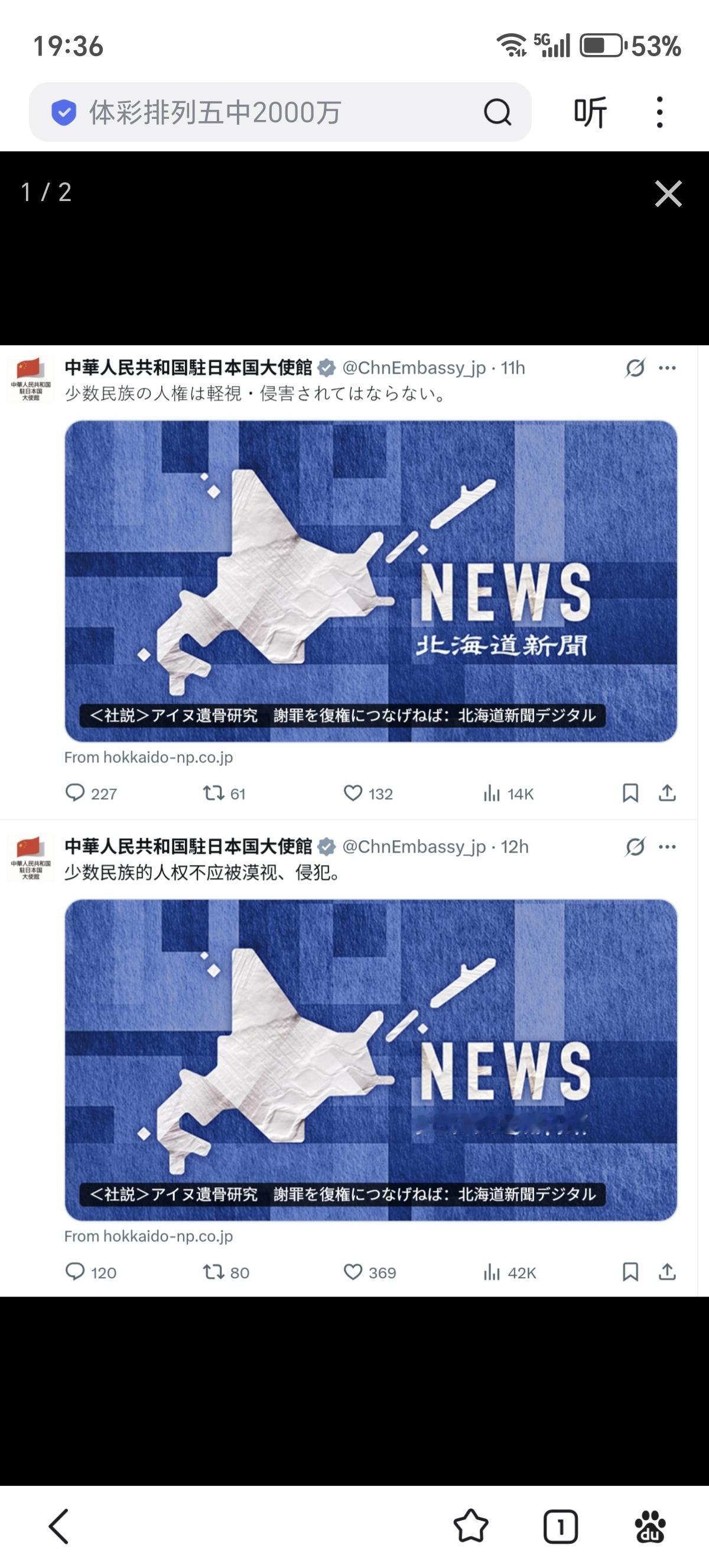 新的一年,继续锤,中国驻日本大使馆转发北海道媒体发布的有关阿伊努人的新闻。