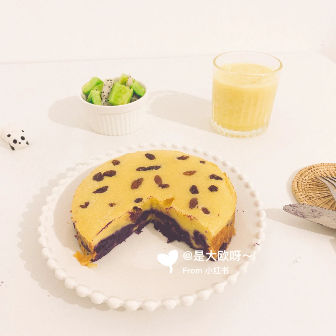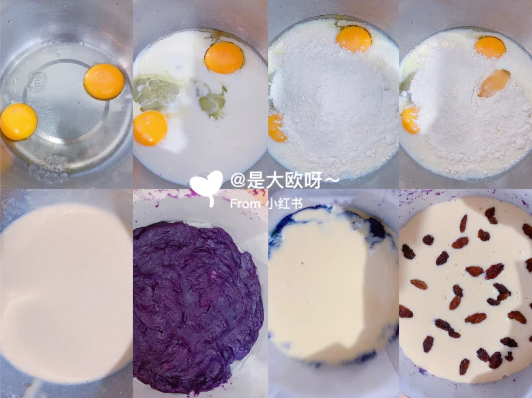 紫薯2个、鸡蛋🥚2个、面粉85g、牛奶🥛100g、蜂蜜🍯10g、葡萄干或其他坚果果干适量,也可不放。
