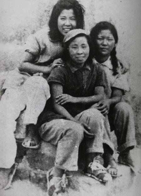 抗战时期。延河边穿草鞋的延安女青年。左起:白凌、张建珍、朱漪。白凌后任中国青年艺术剧院副院长、中央歌剧院党委书记,1985年离休。张建珍后任中央新闻纪录电影制片厂副总编辑,钱筱璋任新影厂厂长、文化部电影局副局长。朱漪后任中国儿童艺术剧院导演、艺委会主任。