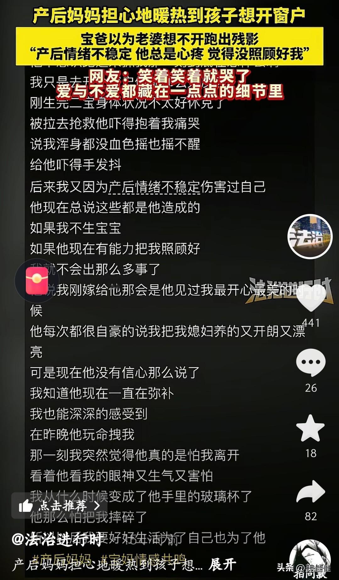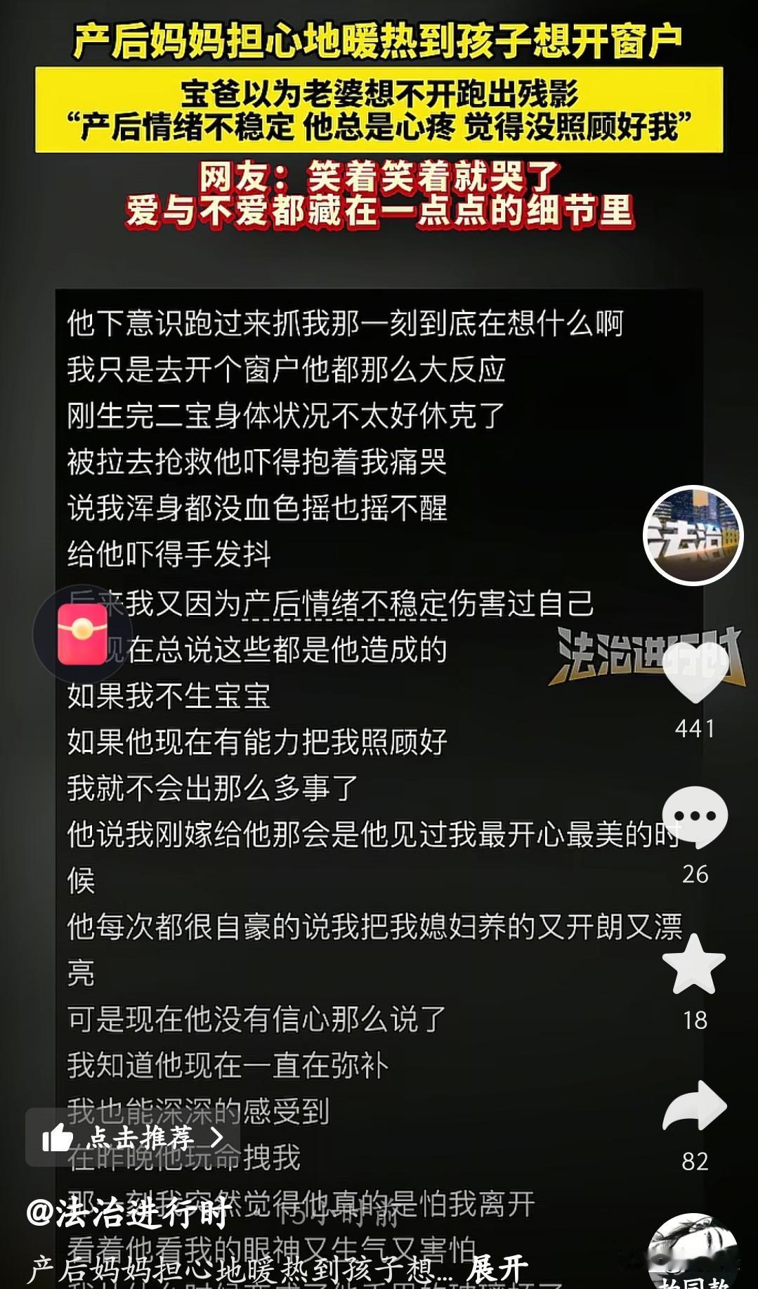 吓哭!宝妈开个窗,老公竟疯了似的冲过来! 天津这位宝妈只是想开窗给娃透透气,老公却以为她想不开,瞬间冲过来一把拽住,那慌张的样子连监控都拍出道残影! 原来宝妈生完二宝后经历过休克抢救,还因产后情绪不稳伤害过自己,这件事成了老公心里的一根刺。他总怪自己没照顾好妻子,看着曾经开朗漂亮的爱人变成这样,满心愧疚。 这次只是开窗的小动作,却触发了他的应激反应。宝妈说,那一刻感觉自己成了老公手里的玻璃杯,他怕极了把自己摔碎。 看着这一幕,笑着笑着就哭了,爱从来不是挂在嘴边的甜言蜜语,而是他下意识冲过来的瞬间,是他眼里又气又怕的神情,是那些藏在细节里的小心翼翼。愿每个产后妈妈都能被这样的爱意包裹,也愿所有人都能读懂这份藏在慌张里的深情。
