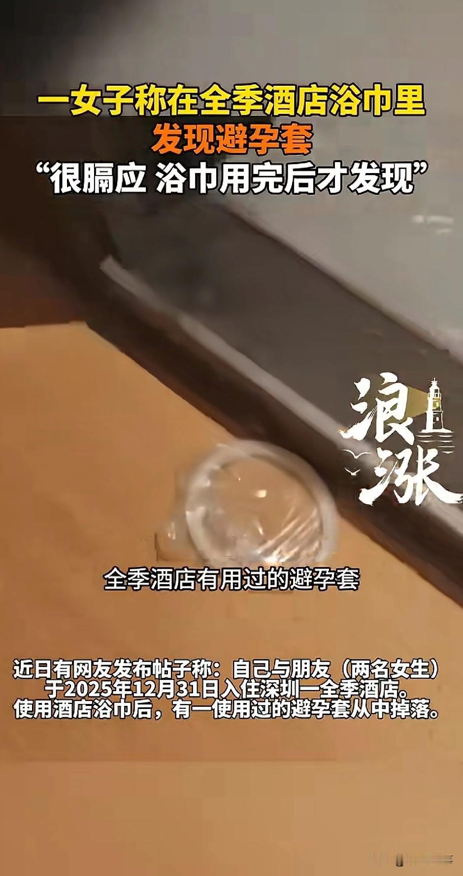 “太恶心了!”深圳,一女子自述跨年夜和朋友出去玩,当晚两人在一家知名酒店居住。然而,让她没想到的是,在洗澡用浴巾擦完身体后,从浴巾里竟掉出一个用过的避孕套。女子瞬间觉得整个人都不好了。 据涉事女子表示,2025年12月31日跨年夜,她和朋友(另一名女子)入住深圳一家知名的连锁酒店。 疲惫了一天,她们想着洗个热水澡好好放松一下。 可谁曾想,当女子洗完澡拿起酒店浴巾擦拭完身体后,一个用过的避孕套突然掉了出来! 女子瞬间觉得又恶心又膈应,好好的跨年夜心情全毁了。 事后,她和朋友第一时间联系酒店,店长到场后称可能是更换浴巾时没打开查看,当场提出免除当日房费。 本以为这事能勉强平息,可当晚酒店发来文字消息,称查看监控确认布草全部更换,且除工作人员外无他人进入房间。 但两名女生表示,自己压根没看过所谓的监控,双方各执一词。 后来,记者联系涉事酒店,工作人员坚称提供了监控,目前,总部已介入调查。 此事经曝光后,网友们纷纷评论:“连锁酒店也这么不卫生?” “免房费就想打发人?心理阴影怎么算?” “酒店的说辞,怕不是觉得这是女生自导自演吧?” 说实话,大家入住酒店,就是图一个省心。 住酒店花了钱,就该享受到干净卫生的服务。 《消费者权益保护法》规定,消费者接受服务时,人身和财产安全应得到保障,酒店提供的用品必须符合卫生要求。 浴巾里藏着不洁物品,明显违反卫生标准,酒店已经构成了违约。 有人觉得酒店主动免房费,已经够可以了。 但从法律角度看还远远不够。根据《民法典》规定,当事人一方履行合同义务不符合约定,需承担赔偿损失等责任。 这里的损失不只是房费,还包括后续可能产生的体检费、医疗费,甚至精神损害赔偿。 毕竟这种情况不仅让人心理不适,还可能存在健康风险。 另外,酒店说查了监控,拟证明自房间打扫后,没有进去过。但事实上,房间内的卫生问题已经发生了,酒店的责任跑不了。 不管是保洁没检查仔细,还是布草清洗环节出了纰漏,责任都在酒店方。 《公共场所卫生管理条例实施细则》明确要求,酒店顾客用品必须“一客一换”。 出现这种问题,说明酒店卫生检查流程有严重漏洞,没尽到应尽的义务。 目前,此事还在调查中,希望能给两位女生一个合理答复。 最后,这件事也给所有酒店敲响警钟:卫生是底线,不能有丝毫松懈!不然,消费者花那么多钱去入住是图什么呢?