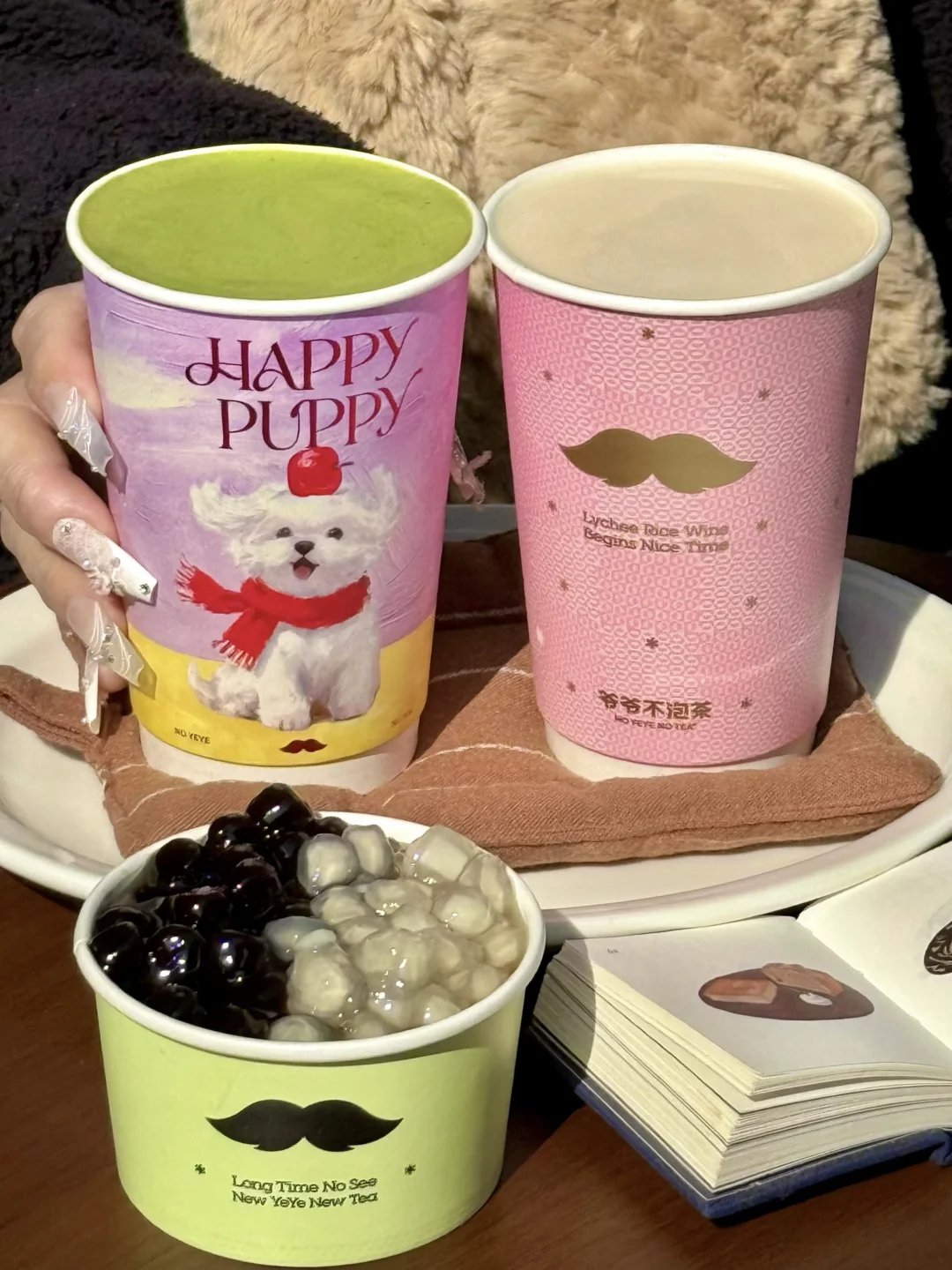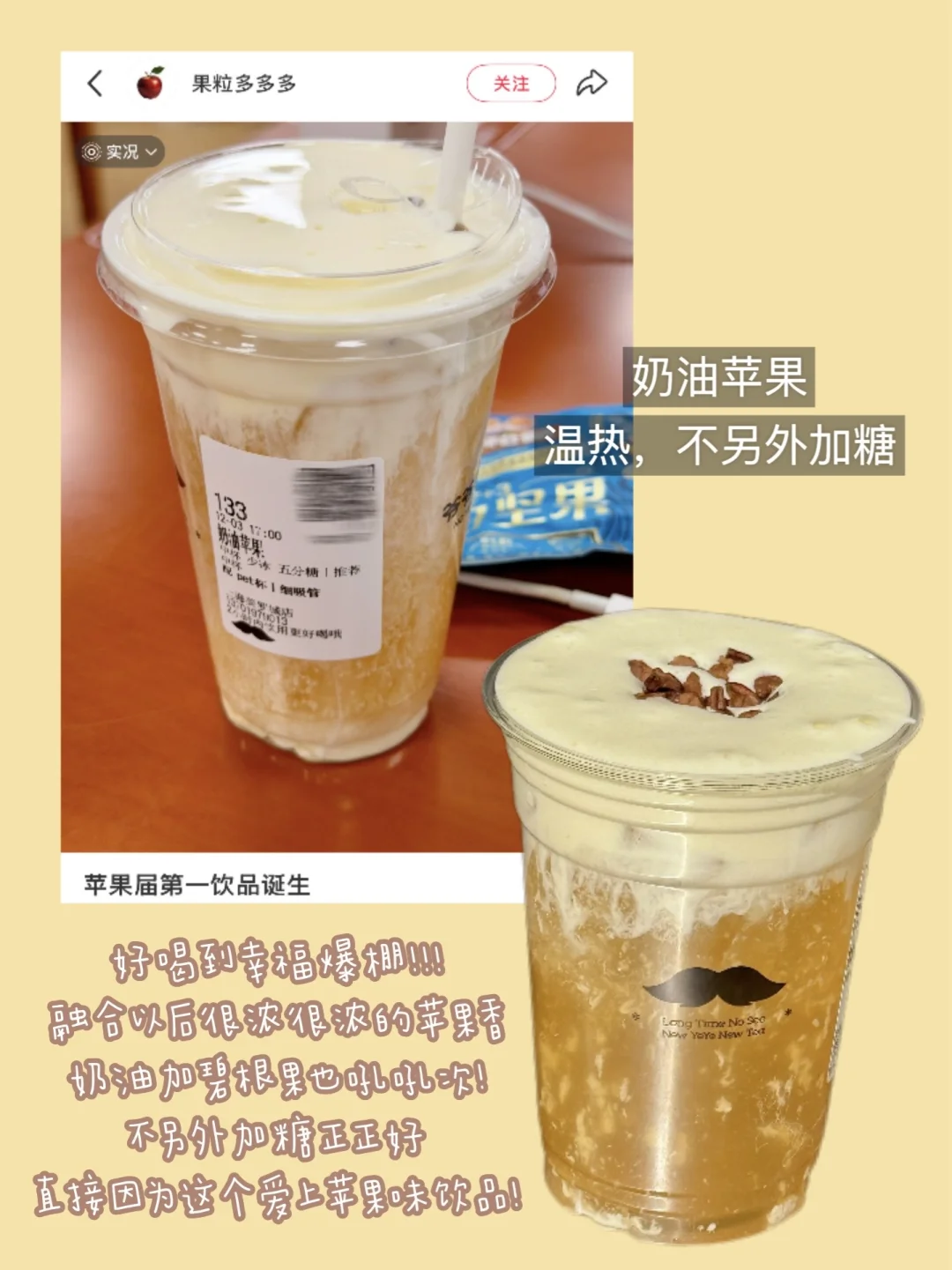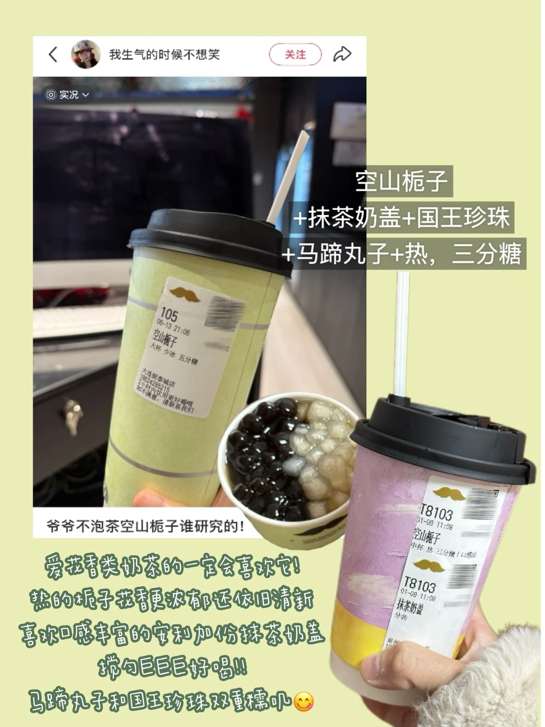 爷爷不泡茶我又爱上你了 以为冷的就够好喝了,冬天尝了热的居然也狠好喝🥹 一天不喝就浑身刺挠….喝过第一口和第十次喝都依然惊艳!!! · ①荔枝冰酿+温热+不另外加糖(荔枝米酿茶冻搭配好绝) ②空山栀子+热+三分糖+抹茶奶盖+马蹄丸子+国王珍珠(喝完整个口腔都是香香的[喝奶茶R]) ③奶油苹果+温热+不另外加糖(空口吃苹果的感觉!!!好清爽) ④鲜草莓白雪+温热+不另外加糖(一口惊艳!!全程都能嚼到脆甜的草莓果肉,0茶底好喝s了🤤🤤)