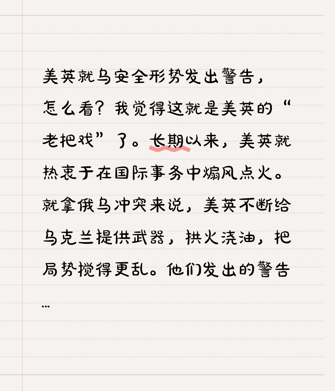 美英就乌安全形势发出警告,怎么看?我觉得这就是美英的“老把戏”了。长期以来,美英就热衷于在国际事务中煽风点火。就拿俄乌冲突来说,美英不断给乌克兰提供武器,拱火浇油,把局势搅得更乱。他们发出的警告,与其说是关心乌克兰安全,不如说是为了自己的利益。 从地缘政治角度看,美英通过制造紧张,能加强对欧洲的控制,遏制俄罗斯。而乌克兰就成了他们博弈的“棋子”。这种警告不过是他们继续操弄局势、捞取好处的手段罢了,可怜了乌克兰民众要承受这动荡不安的局面。