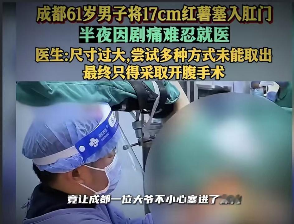 成都肛肠科的大夫也是见多识广,连红薯入体的病例都能遇到! 这位61岁大爷也是够猛,进上消化道的吃食能到下消化道! 夜里11点多出的事儿,凌晨4点忍不了了才就医。 其他方法尝试未果后,大夫只能“中转开腹”取薯。 这下大爷肯定是能长记性了,一个红薯的价钱与一次手术的价钱能比吗,关键是人还受了不少罪!