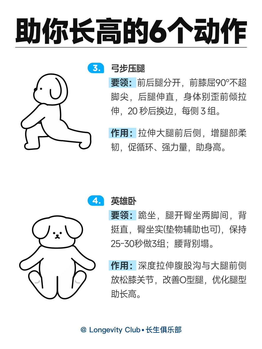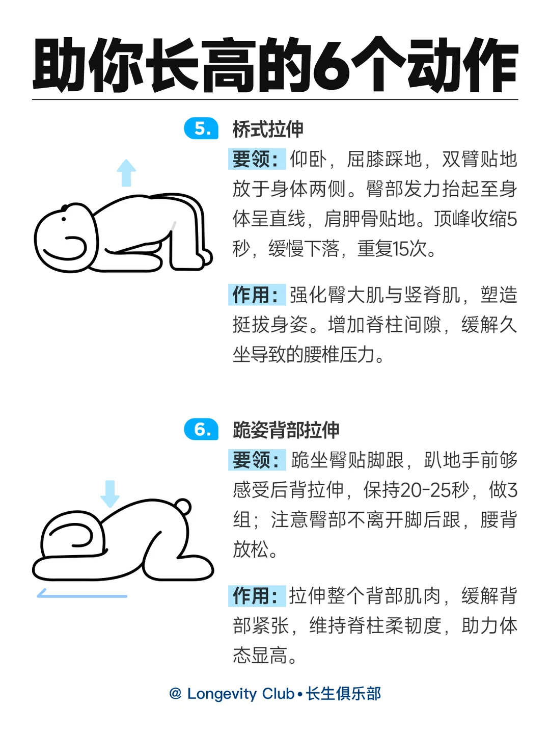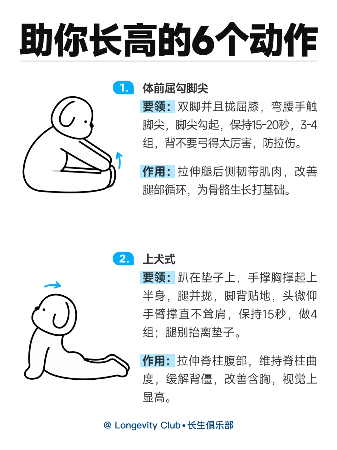 ✅体前屈勾脚尖 ✅上犬式 ✅弓步压腿 ✅英雄卧 ✅桥式拉伸 ✅跪姿背部拉伸 同时也要注意日常饮食中 多摄入优质蛋白和钙🥛 保证充足的睡眠🌙哦 如果你是骨骺线未闭合的青少年 以上的方法能对身高进行拔高; 但是对骨骺线闭合(一般,女:16-18;男:18-22)的成年人 虽无法实现实质性增高 但通过长期坚持运动拉伸,改善体态,能从视觉上提升2-3厘米的显高效果 一起努力,让身高再涨涨哦! 毕竟能高一点是一点嘛~