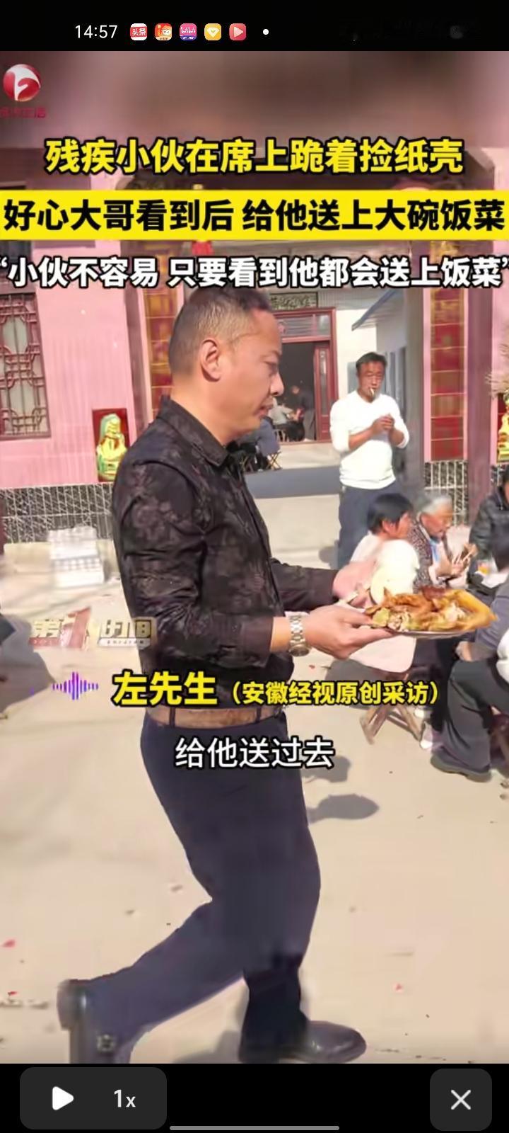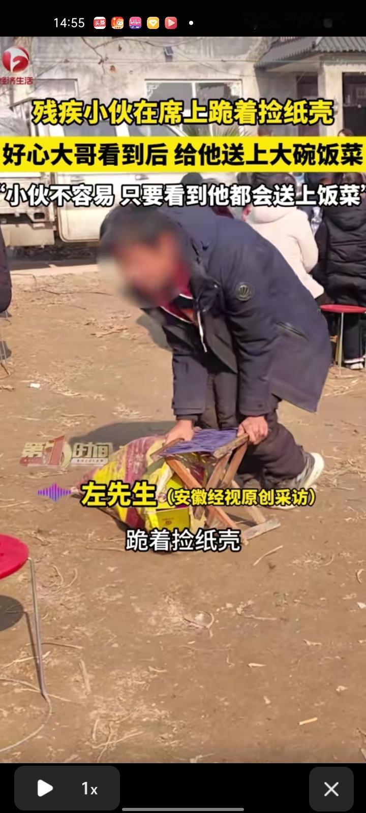 1月11日,菏泽市单县。农村办酒席时,一位残疾小伙跪在地上捡纸壳,好心男子看到后,给他送碗饭菜填饱肚子。 当事人左先生表示,小伙是隔壁村的,一个人生活确实不容易,只要看到他都会送上饭菜,这是举手之劳的小事,希望更多人关爱他们。