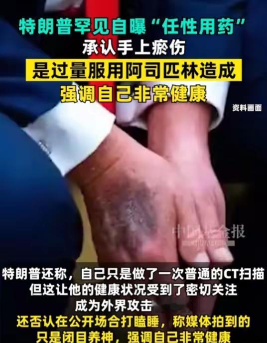 特朗普身体出状况了,健康堪忧,不知是否可以撑到1月20号? 近来,79岁的特朗普健康状况成了全球热议的焦点,不少人暗自揣测他能否顺利撑到1月20日。一系列反常表现接连出现,让这份担忧绝非空穴来风,而更耐人寻味的是,他在国际事务上的强硬作风也突然松动,两者叠加之下,难免让人浮想联翩。 最开始引发热议的是特朗普手背上常年不消的瘀青。之前大家就发现,他出席公开活动时,右手背总被遮瑕膏盖着,偶尔还会贴个创可贴遮挡。 直到近期接受《华尔街日报》采访,他才主动解释,说是因为每天都在吃阿司匹林,而且剂量远超医生建议的标准,这才导致了瘀青。 更让人惊讶的是,他说自己已经这样吃了25年,就算医生建议减量也拒绝,还直言“有点迷信阿司匹林稀释血液的效果”,担心血液黏稠会影响心脏。 按照美国梅奥诊所的标准,每天81毫克才算低剂量服用,而特朗普每天的剂量足足有325毫克,是推荐量的四倍还多。 除了瘀青,特朗普的嗜睡问题也被反复提及,要知道他之前总吐槽前总统拜登是“瞌睡乔”,可自己却多次在公开场合被拍到疑似打瞌睡的画面。 2025年11月,在白宫椭圆形办公室的一场会议上,镜头就捕捉到他双眼紧闭、头部微垂的样子;不到一个月后,12月的内阁会议上,类似的场景再次出现。 面对质疑,特朗普只解释说那些瞬间是在“放松”,还辩称“有时他们会拍下我眨眼的画面,却刚好捕捉到我闭眼”,同时强调自己晚上睡眠很少,每天从上午10点工作到晚上七八点,精力完全够用。 更不容忽视的是他早已被证实的慢性疾病。2025年7月,白宫新闻秘书莱维特就公开确认,特朗普患有慢性静脉功能不全,这种病会导致腿部和脚踝肿胀,在70岁以上人群中很常见。 特朗普自己也提到,他曾试着穿弹力袜缓解肿胀,但因为“不喜欢那种感觉”就放弃了,这也让他出席活动时,偶尔会被拍到脚踝明显肿胀的样子。 更有意思的是,关于之前的体检,他还出现过改口的情况,一开始说2025年10月在沃尔特·里德国家军事医学中心做了磁共振成像检查。 后来又改口说是耗时更短的计算机断层扫描,还懊悔地说“真不该做这项检查,给了他们可乘之机”,担心大家会因此猜测他身体有问题。 就在这些健康疑点不断积累的时候,特朗普在国际事务上的作风也出现了明显松动。之前他对委内瑞拉态度强硬,2026年1月初还下令对委内瑞拉发起大规模军事行动,强行控制了总统马杜罗夫妇并带回美国,宣称要“管理”委内瑞拉的石油储备。 可到了1月9日,他却突然签署行政令宣布进入国家紧急状态,理由是“保护”存放在美国财政部的委内瑞拉石油收入,避免被境外势力扣押。 当天他还召见了20多家石油企业高管,要求他们向委内瑞拉投资1000亿美元增产石油,结果没得到任何积极响应,这种先强硬后缓和的转变,和他之前一贯的风格截然不同。 面对铺天盖地的健康质疑,白宫医生团队也发布过报告,确认特朗普“绝对健康”,还说他第三次在认知能力测试中拿了满分。 但外界的担忧并没因此减少,毕竟1月20日的执政一周年演说近在眼前,而特朗普政府目前的政绩并不理想。 美国2025年11月的失业率升到了4.6%,创四年新高,食品、电费等民生用品价格居高不下,他急需一场“稳赢的政绩”来提振支持率,之前对委内瑞拉的军事行动,也被分析认为是想在周年庆前刷业绩。 如今健康问题和外交作风转变叠加在一起,也难怪大家会忍不住猜测,他能不能顺利撑过这个关键节点。