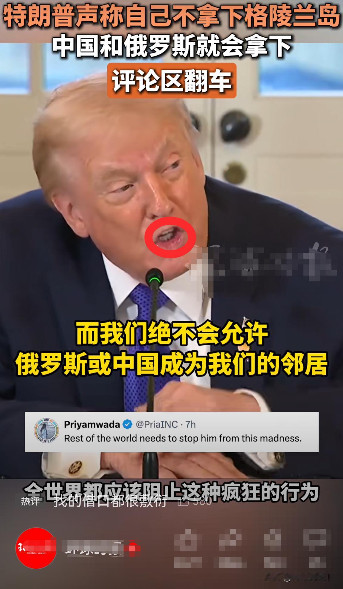 特朗普:我们如果不拿下格陵兰岛,也会被俄罗斯和中国“拿”了! 世界网友:瞧,无论美国做什么,都会拿俄罗斯和中国来借口。 特朗普:不管他们是否愿意,我们都得采取行动。 世界网友:那我们不如解散华盛顿区,我们不做,别人也会这么做。 特朗普:我们不想和俄罗斯中国成为邻居。 世界网友:连找借口都这么敷衍了。 世界网友:特不靠谱!撒谎成性! 世界网友:全世界都应该阻止这种疯狂行为!