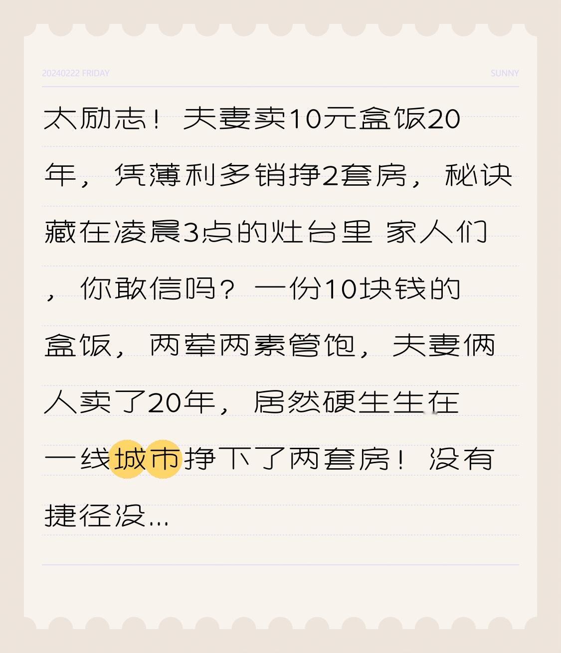 太励志!夫妻卖10元盒饭20年,凭薄利多销挣2套房,秘诀藏在凌晨3点的灶台里 家人们,你敢信吗?一份10块钱的盒饭,两荤两素管饱,夫妻俩人卖了20年,居然硬生生在一线城市挣下了两套房!没有捷径没有炒作,全靠一双手起早贪黑,看完他们的故事,真的让人热泪盈眶。 在浙江宁波的老巷子里,王大叔和李阿姨的盒饭摊,一摆就是20年。每天中午11点,摊位前准排起长队,建筑工人、快递小哥、学生党挤得满满当当,10块钱一份,有鱼香肉丝、番茄炒蛋、清炒时蔬,再加一碗免费汤,分量足到男生都能吃撑。有人算过一笔账,一份盒饭食材成本5块多,扣除水电摊位费,纯利润也就2块钱左右,要挣一套房,得卖多少份啊? 可谁能想到,这看似不起眼的小生意,背后藏着常人熬不住的辛苦。凌晨3点,当城市还在沉睡,夫妻俩就已经起床赶往菜市场,挑最新鲜的蔬菜、最实在的猪肉,回来后洗菜、切菜、腌制、炒菜,忙到早上7点才能歇口气。李阿姨的手上全是老茧,切菜时不小心划到的伤口,结了痂又被水泡开,反复愈合反复受伤;王大叔的腰早就落下病根,每天站在灶台前颠勺8小时,晚上回家连腰都直不起来。 中间不是没遇过坎儿,2019年疫情来袭,街道空无一人,盒饭摊直接停摆,房租和食材损耗压得夫妻俩睡不着觉。有人劝他们涨价,说10块钱太亏了,可他们琢磨着:来吃的都是辛苦人,涨价一块钱,可能就有人吃不起饭了。于是咬牙坚持不涨价,反而推出“半份菜半价”的优惠,给暂时失业的人留了一口热饭。就这一举动,让老顾客们记在心里,疫情好转后,大家纷纷带着朋友来捧场,摊位前的队伍比以前更长了。 还有一次,有人举报他们“无证经营”,城管上门检查,夫妻俩差点就要关摊。后来街道了解到他们的情况,帮忙协调了正规摊位,还减免了部分管理费。王大叔说:“那会儿真的想过放弃,可一想到那些天天来吃的老熟客,还有没还完的房贷,就又咬牙扛下来了。” 20年里,物价涨了一轮又一轮,隔壁的小吃摊换了一波又一波,只有他们的盒饭始终卖10块钱。有人问他们挣钱的秘诀,李阿姨笑着说:“哪有什么秘诀?就是食材实在、分量给足,不坑人不骗人,慢慢攒口碑。”夫妻俩用卖盒饭攒下的钱,不仅供儿子读完了大学,还在宁波买下了两套房子,一套自己住,一套出租补贴家用。 如今王大叔和李阿姨已经快60岁了,可他们依然每天凌晨起床摆摊,有人劝他们退休享清福,他们却说:“干了一辈子,闲不下来,看着大家吃得香,心里就踏实。” 他们的故事没有惊天动地的壮举,却用最朴素的坚持告诉我们:幸福从来不是天上掉下来的,而是靠一双手、一份执念,慢慢打拼出来的。 在这个人人都想走捷径的时代,有人觉得10块钱的生意挣不了大钱,可这对夫妻用20年的时间证明:踏实做事、诚信经营,再小的生意也能做出大天地。生活不会辜负每一个努力的人,那些看似平凡的日复一日,终将在某天让你看到坚持的意义。 如果你也被这对夫妻的故事打动,别忘了点赞转发,让更多人看到这份平凡中的伟大!你身边有没有这样默默努力的普通人?欢迎在评论区分享他们的故事,一起为踏实奋斗的人点赞!