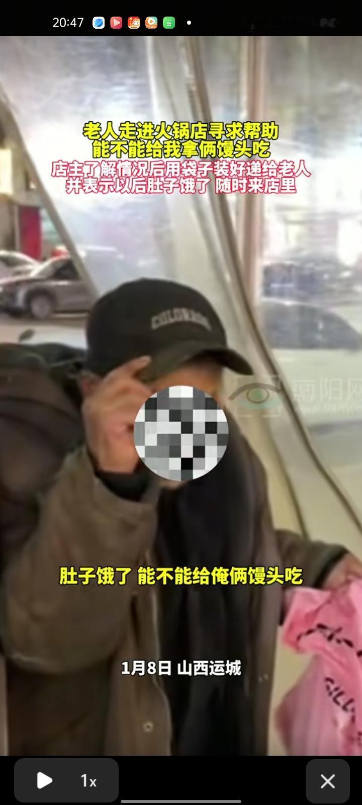 1月8日,运城河津市。一位老人走进火锅店寻求帮助,身无分文,要老板拿两个馒头。老板了解情况后,立刻去后厨给他热馒头,拿袋子装好递给老人。走的时候,老板和大爷说:“你要是不够吃,你随时来咱店里取就行了”