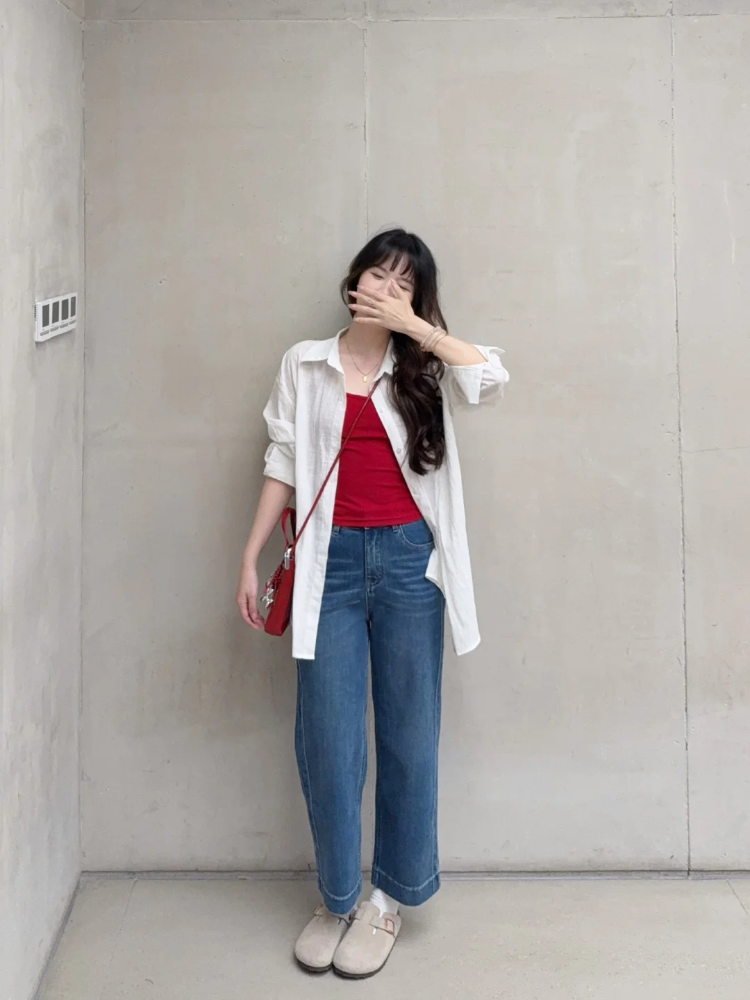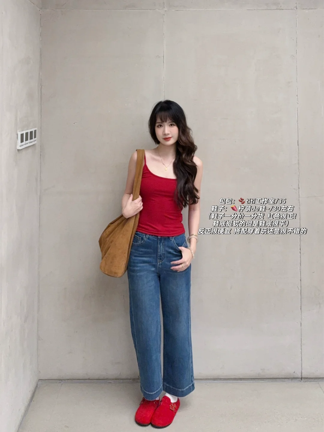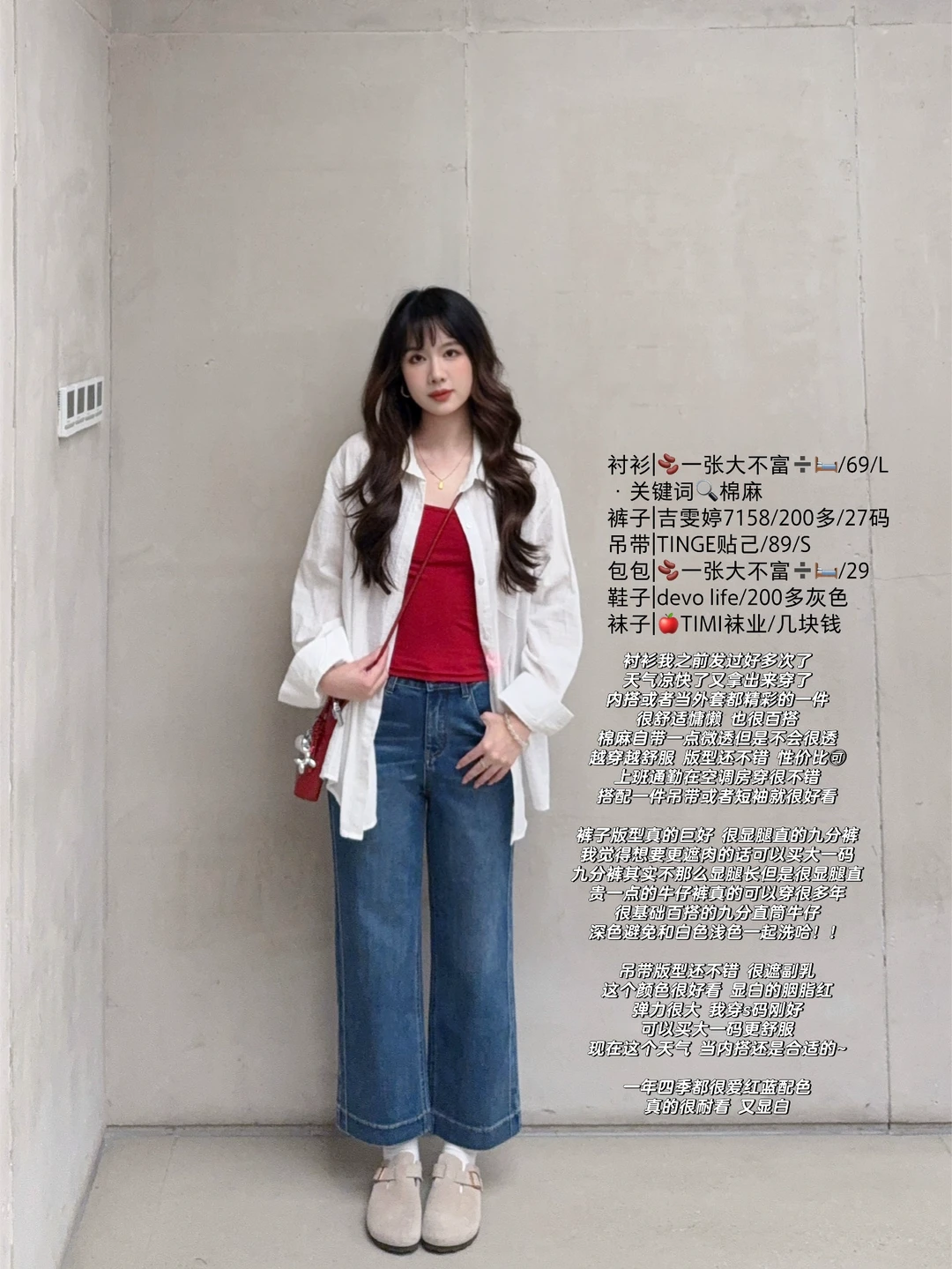 168/106左右 虽然我偶尔是极繁主义 配饰提升整体氛围感 但是对于大部分人来说配饰还是太麻烦 这套其实就很日常但是又很亮眼 上班通勤或者出去玩穿都很合适 不化妆穿 也是可以的 不费力的松弛感~ 而且!!九分裤 也不会担心拖地弄脏裤腿 不喜欢那么扎眼可以换成白色灰色的吊带 只是个人觉得红色比较出彩显白一些~ 反正这套的搭配思路就是很简单 白衬衫➕牛仔裤➕吊带➕勃肯鞋/德训鞋 上班东西多可以背大容量托特包 衬衫也可以换成牛仔衬衫或者黑色卡其色的外套 皮衣西装也是可以的~很百搭